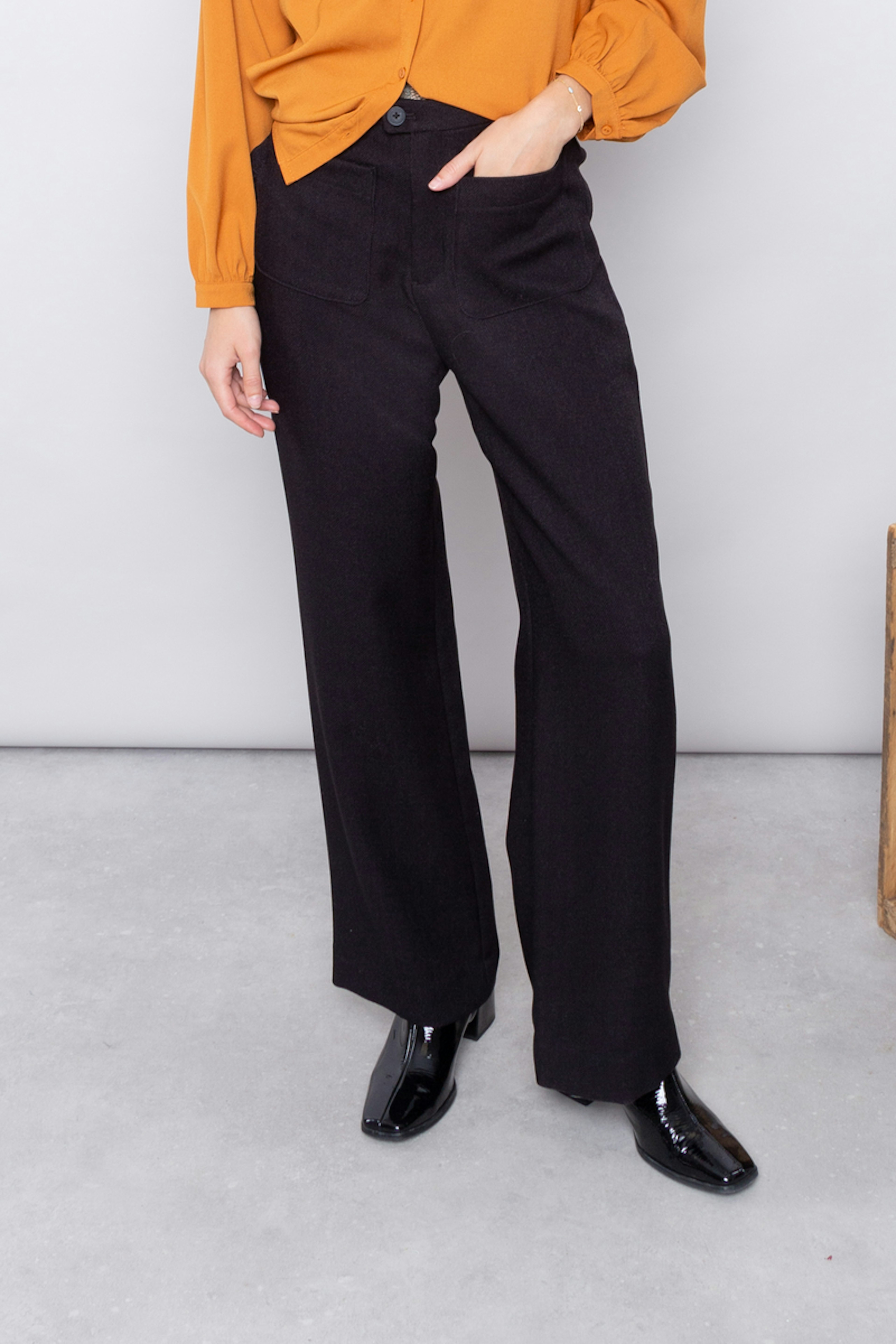 โข Pantalon ร l'allure 70's โข Coloris noir โข Taille haute โข Poches plaquรฉes sur le devant