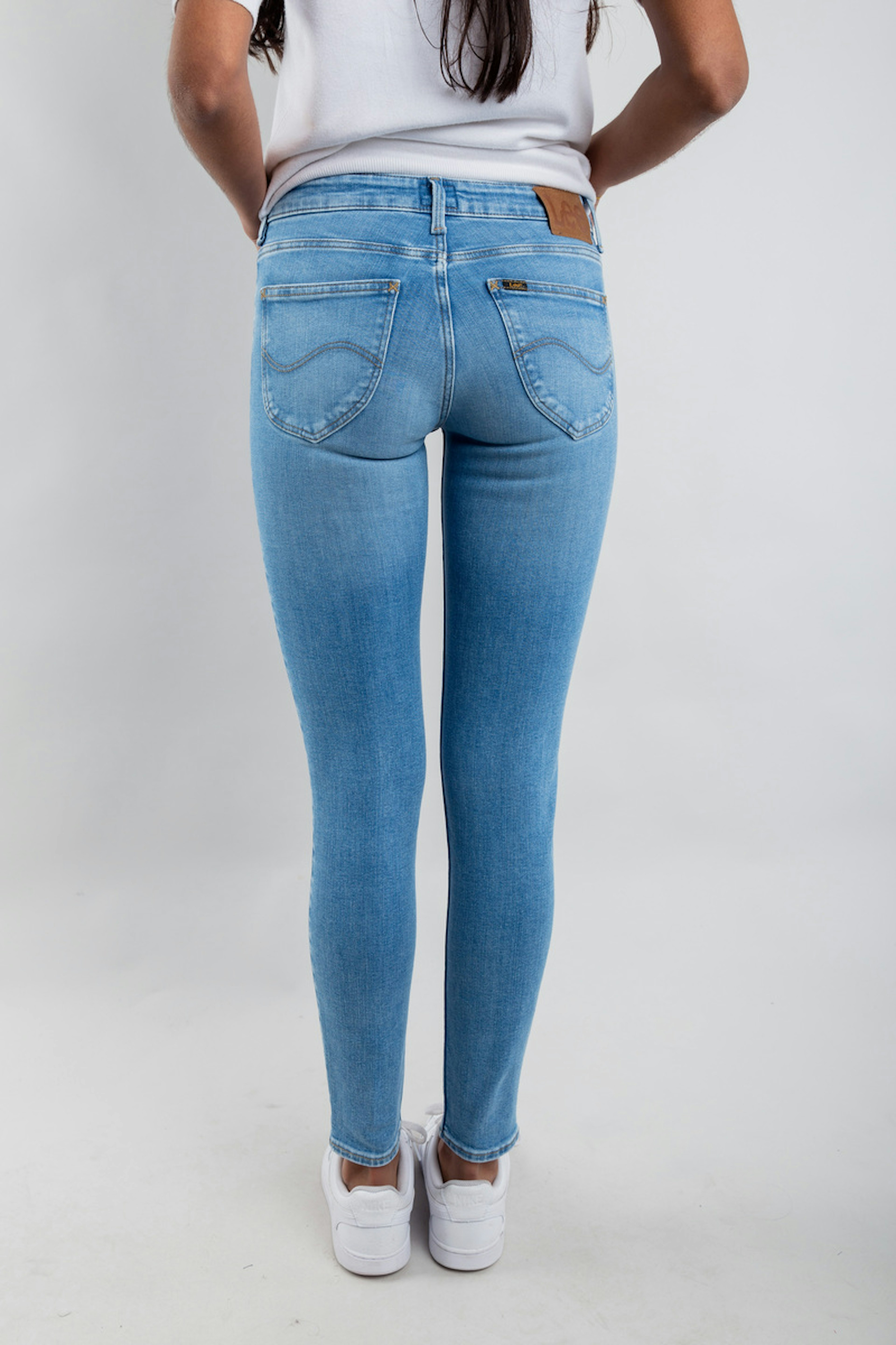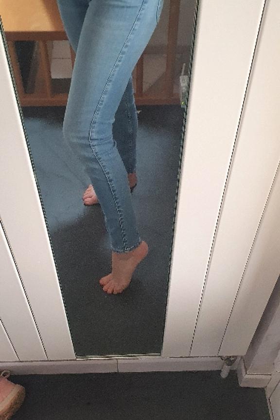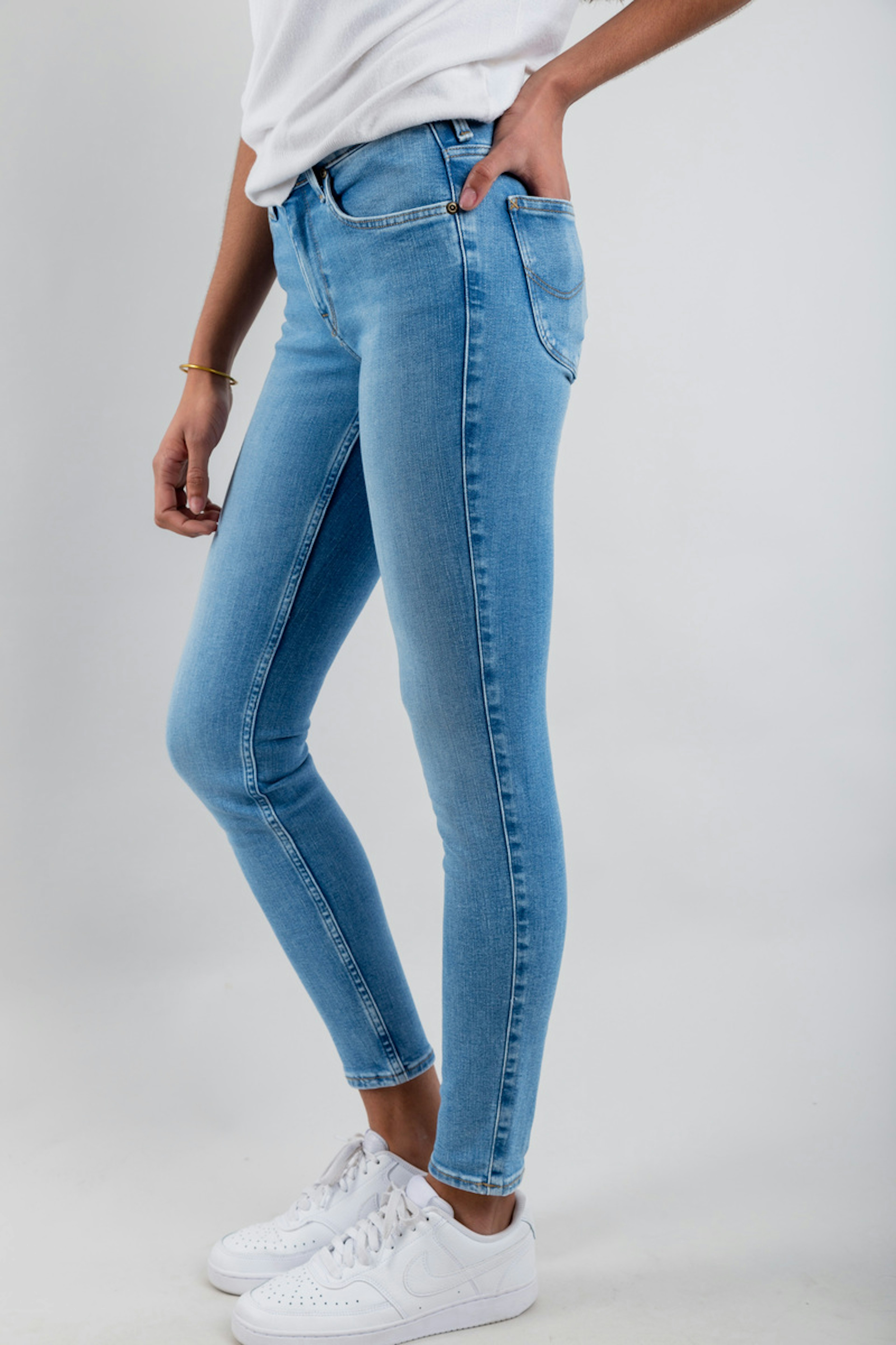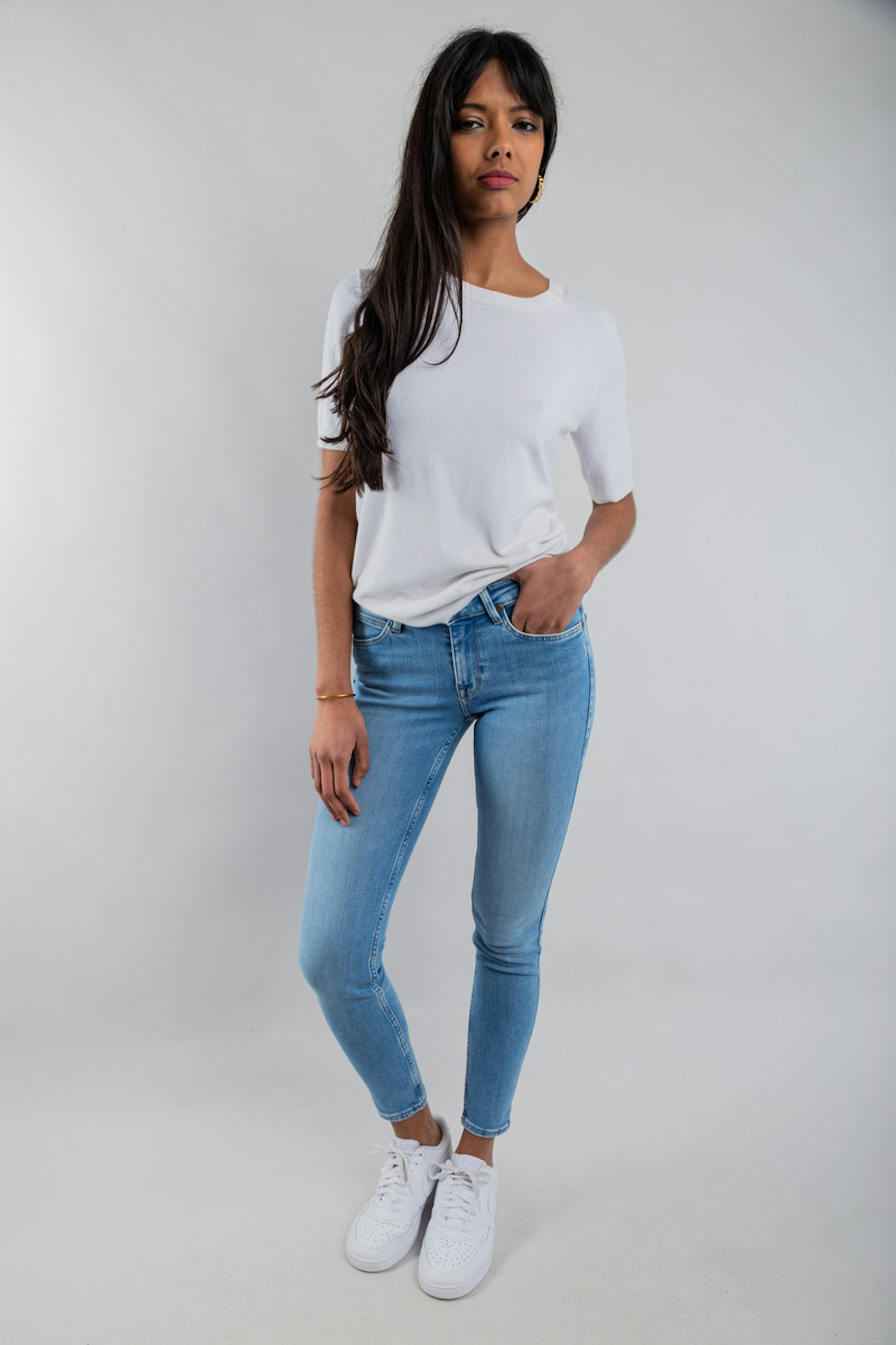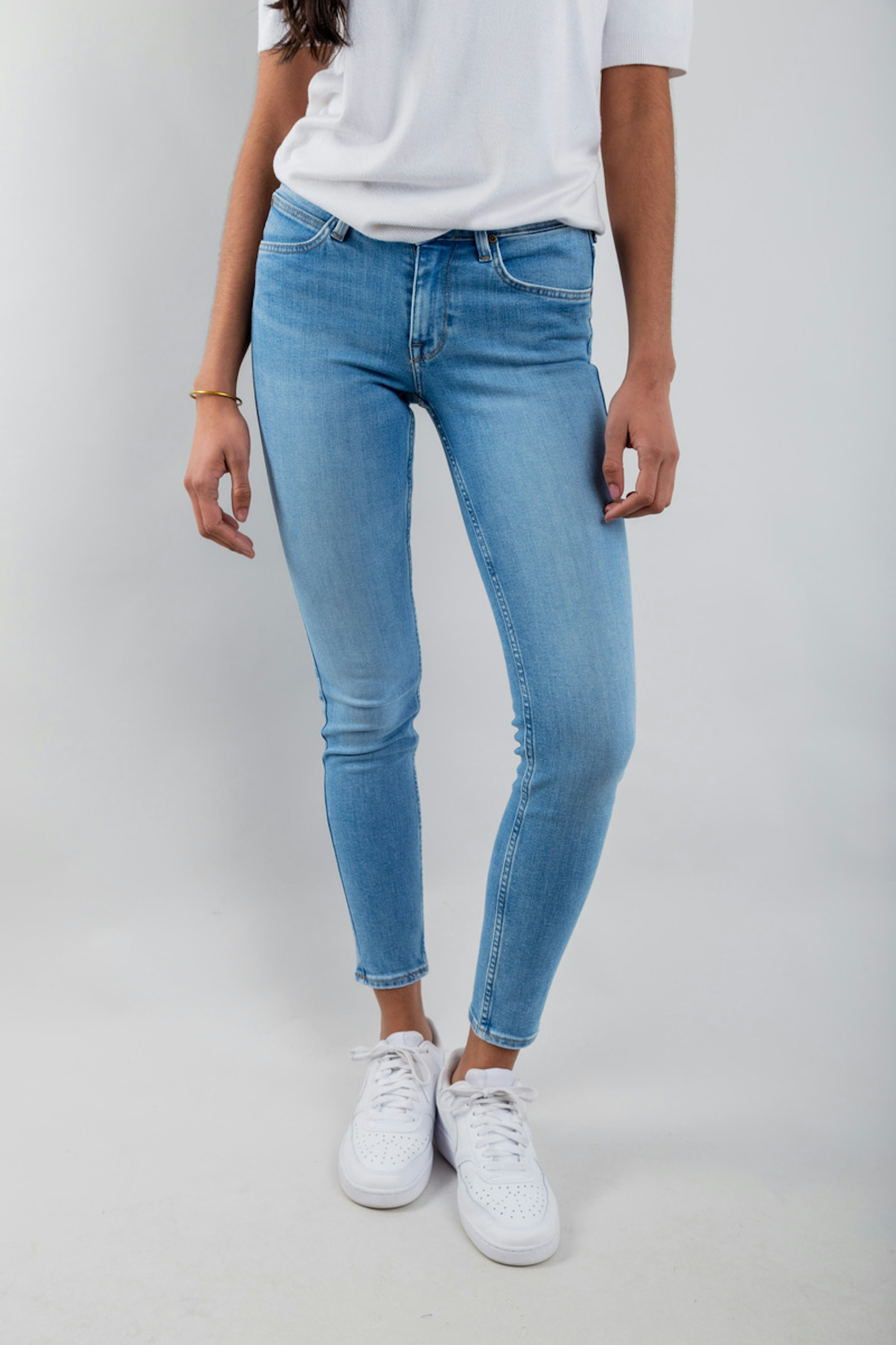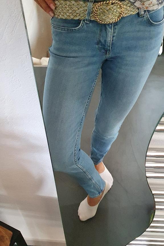 โข Pantalon en denim bleu clair โข Coupe skinny fit โข 5 poches โข Longueur cheville โข Coupe droite