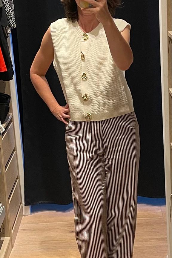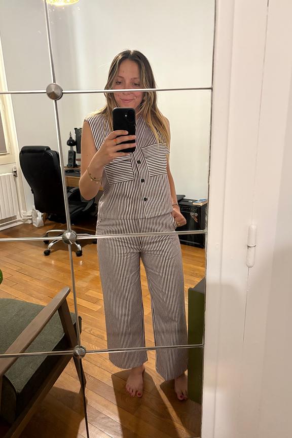 Associez ce pantalon ร  une blouse blanche fluide et des sandales dorรฉes pour un look estival chic. โ€ข Pantalon ร  rayures โ€ข Coupe ample โ€ข Taille haute โ€ข Longueur cheville โ€ข Poches avant plaquรฉes