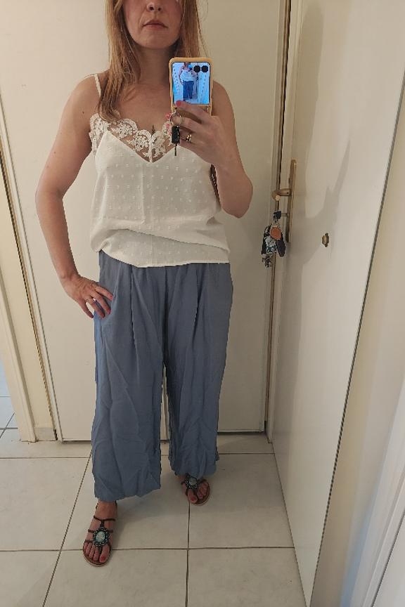 Portez ce pantalon fluide avec un haut ajustรฉ et des sandales ร brides pour une touche estivale. Parfait pour les journรฉes ensoleillรฉes ! โข Pantalon ample en viscose โข Taille รฉlastique confortable โข Jambes larges dรฉcontractรฉes โข Allure fluide et รฉlรฉgante โข Bleu estival polyvalent