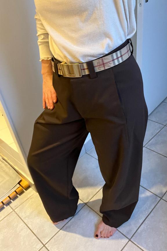 Associez ce pantalon à un pull en laine crème et des bottines camel pour une allure cosy et raffinée, idéal pour les journées d'hiver. • Pantalon marron • Coupe large et élégante • Taille haite • Longueur cheville • Ceinture intégrée avec boucle élégante