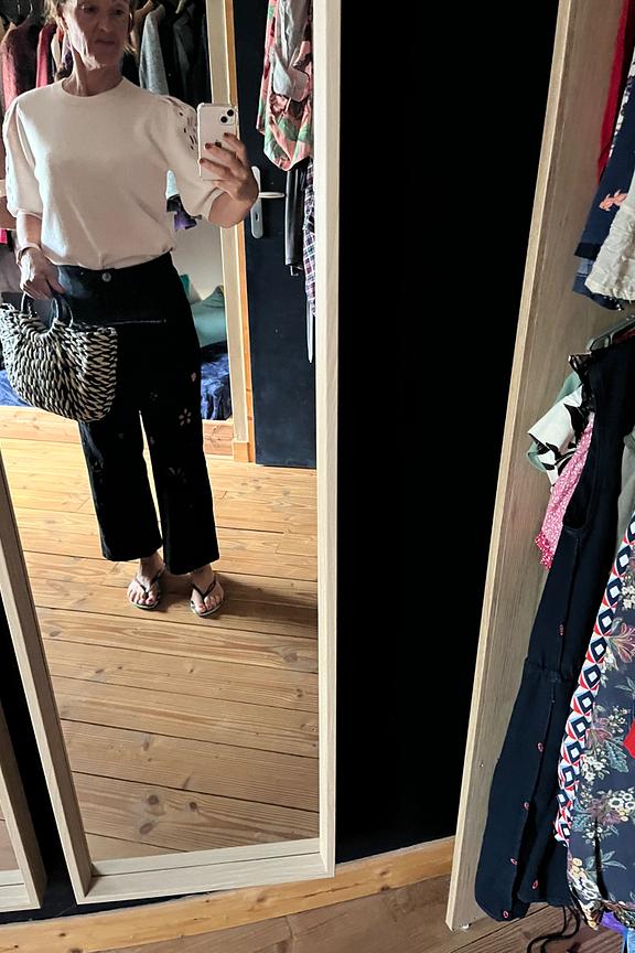 “Taille de guêpe obligatoire pour entrer dans ce pantalon : en taille 40/L, tour de taille maximum 73 cm. La toile n'est pas extensible, aucun espoir de gagner quelques centimètres ! Pour les hanches, pas de souci, ça passe pour 105 cm. Avec ma morphologie ovale, impossible de fermer le pantalon même si d'habitude, le 40 de cette marque me va bien. Dommage, les découpes brodées en forme de fleur sur le devant sont très sympa pour l'été et la longueur juste au dessus des chevilles parfaite pour mon 1,65 m (longueur de l'entrejambe au bas 63 cm en taille 40/L)”