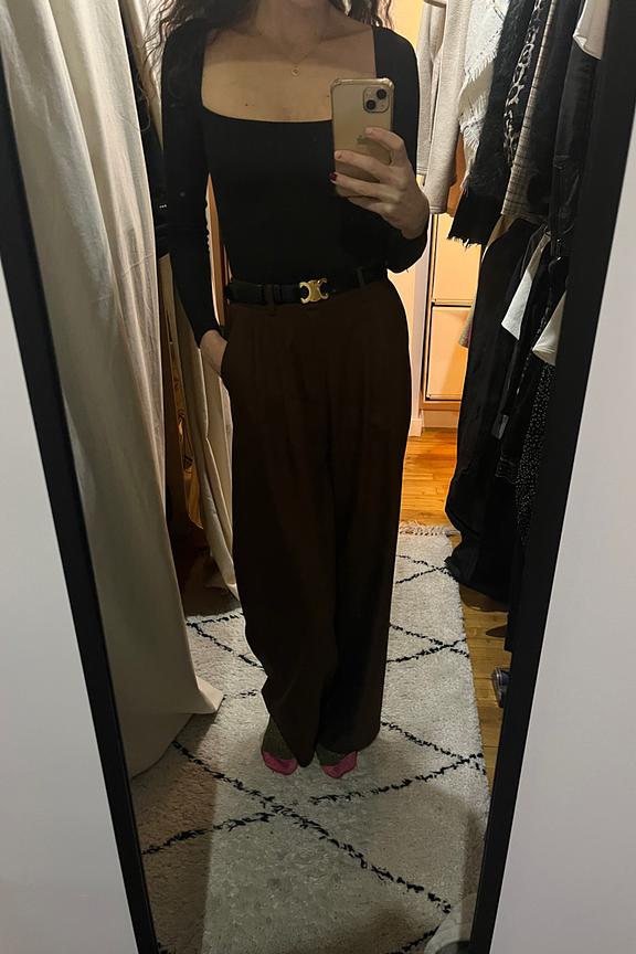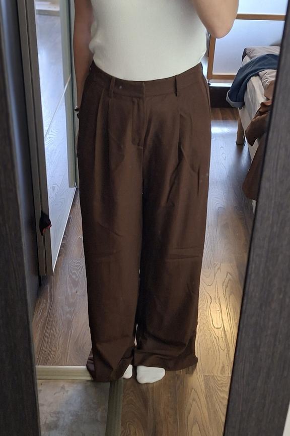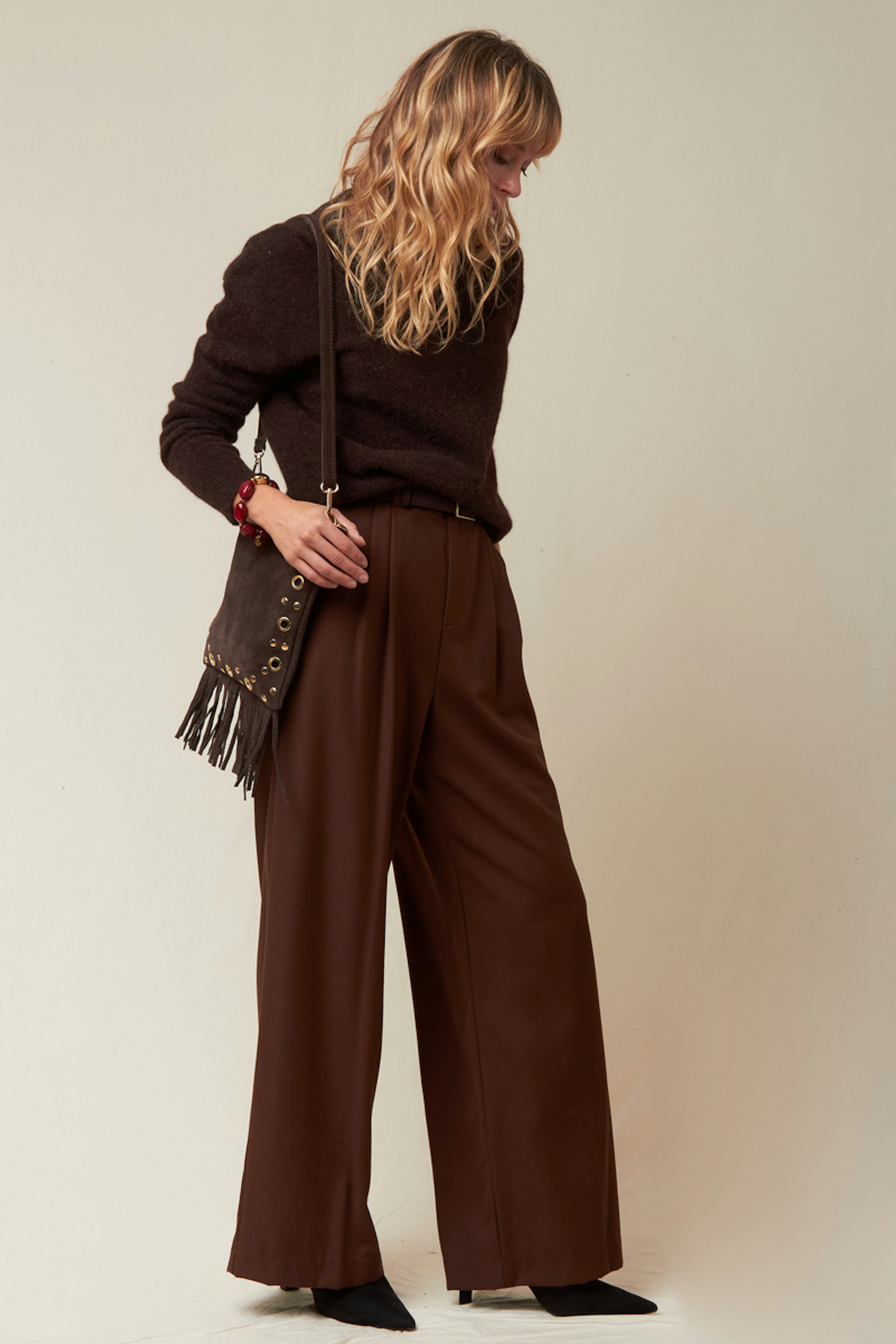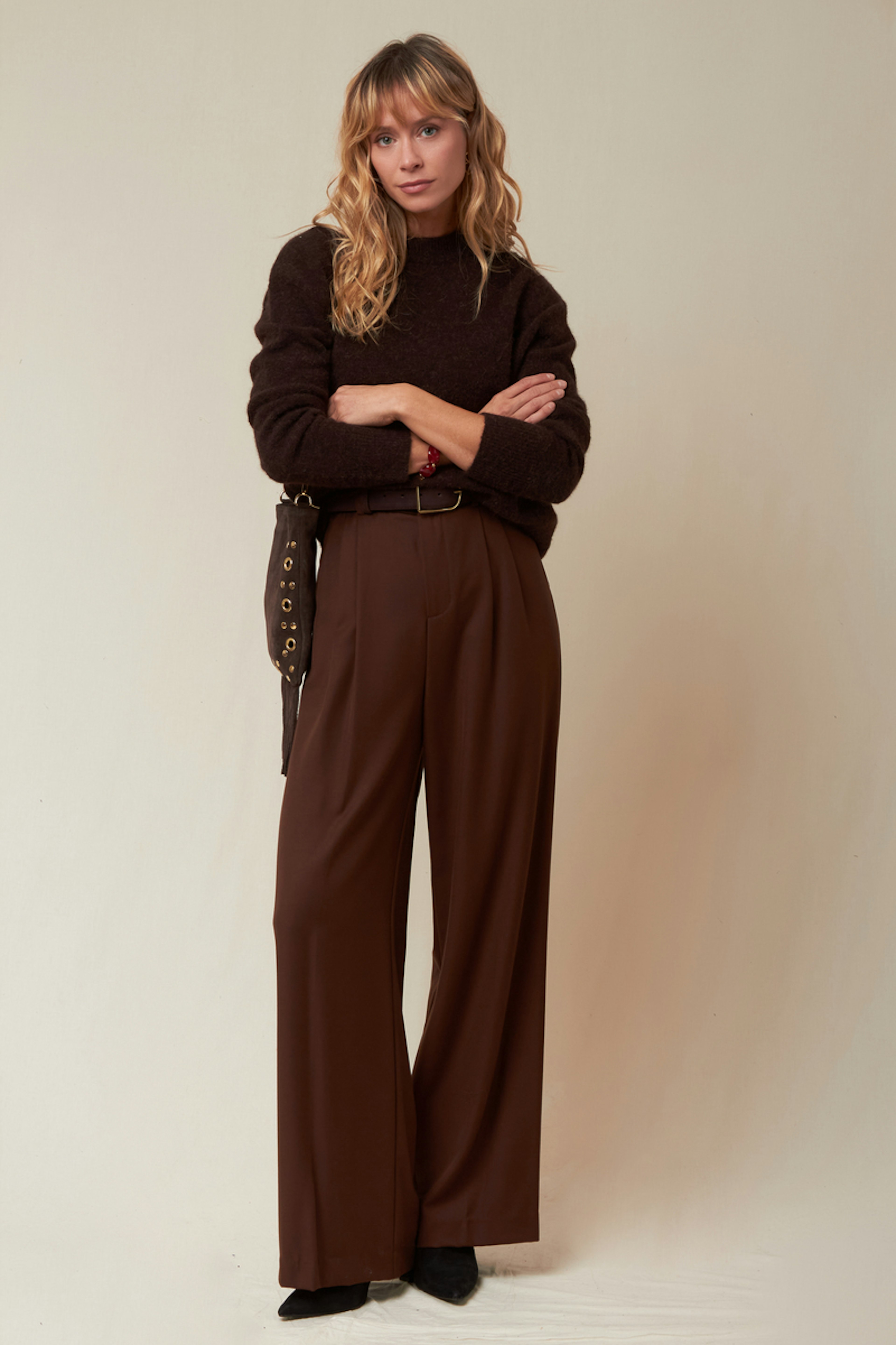 Associez ce pantalon avec un chemisier en soie et des talons pour un look sophistiqué. Parfait en toute saison. • Pantalon taille haute • Coupe large élégante • Pinces avant pour structure • Ourlet long fluide • Couleur marron polyvalente