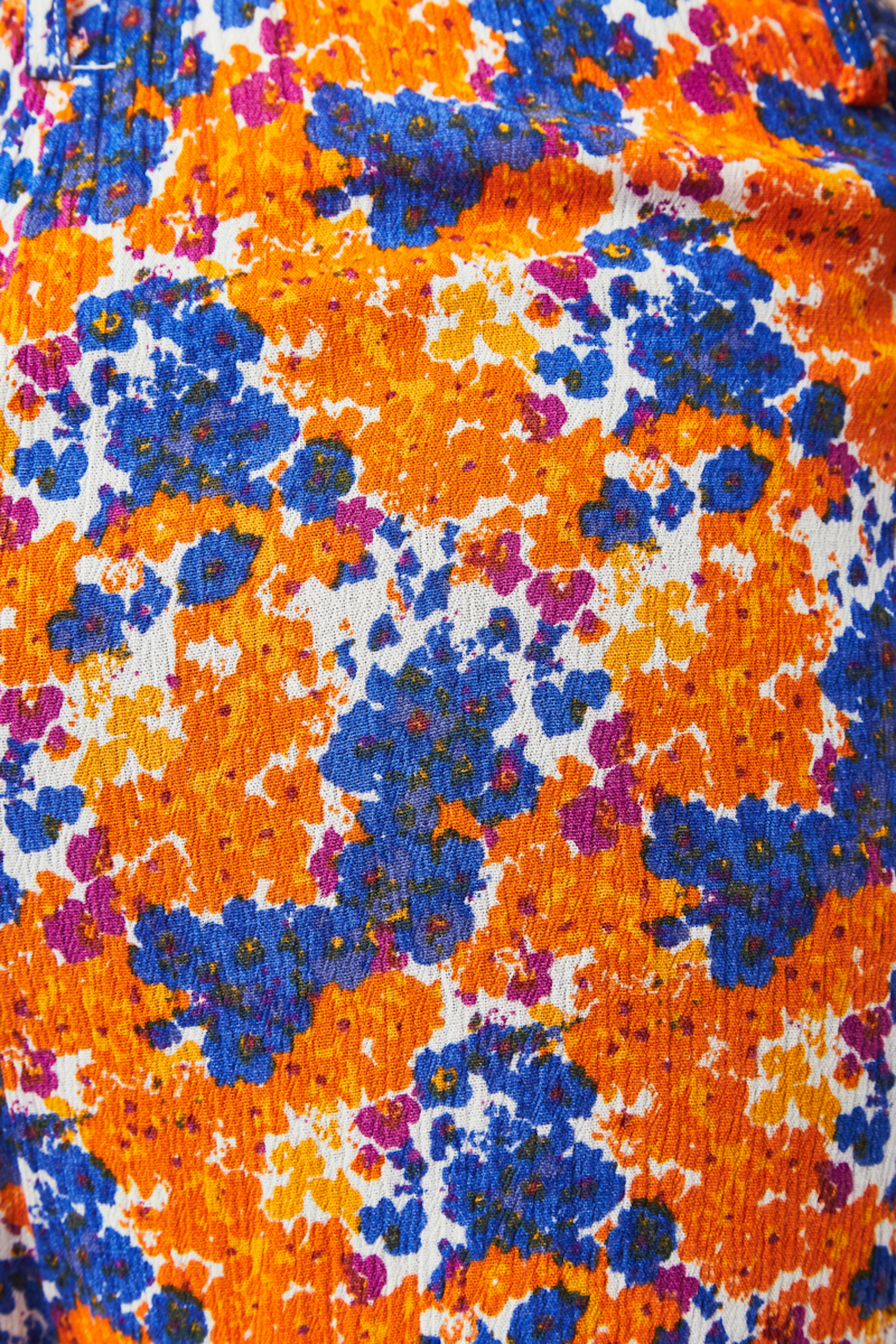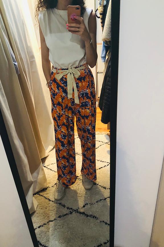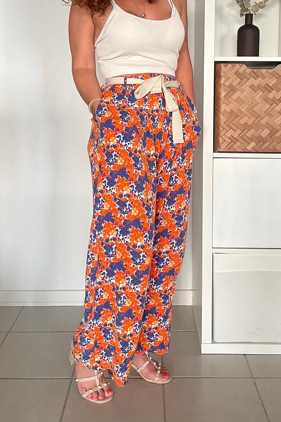 โ€ข Pantalon fluide d'รฉtรฉ imprimรฉ fleuri orange et bleu โ€ข Ceinture contrastรฉe dorรฉe โ€ข Ceinture รฉlastiquรฉe โ€ข Jambe รฉvasรฉe