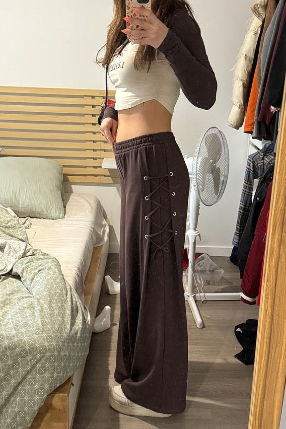 Optez pour une allure décontractée avec des baskets blanches et un chapeau tendance pour un style urbain. • Pantalon ample • Taille élastique • Détail lacé sur les côtés • Coupe droite • Parfait pour un look décontracté