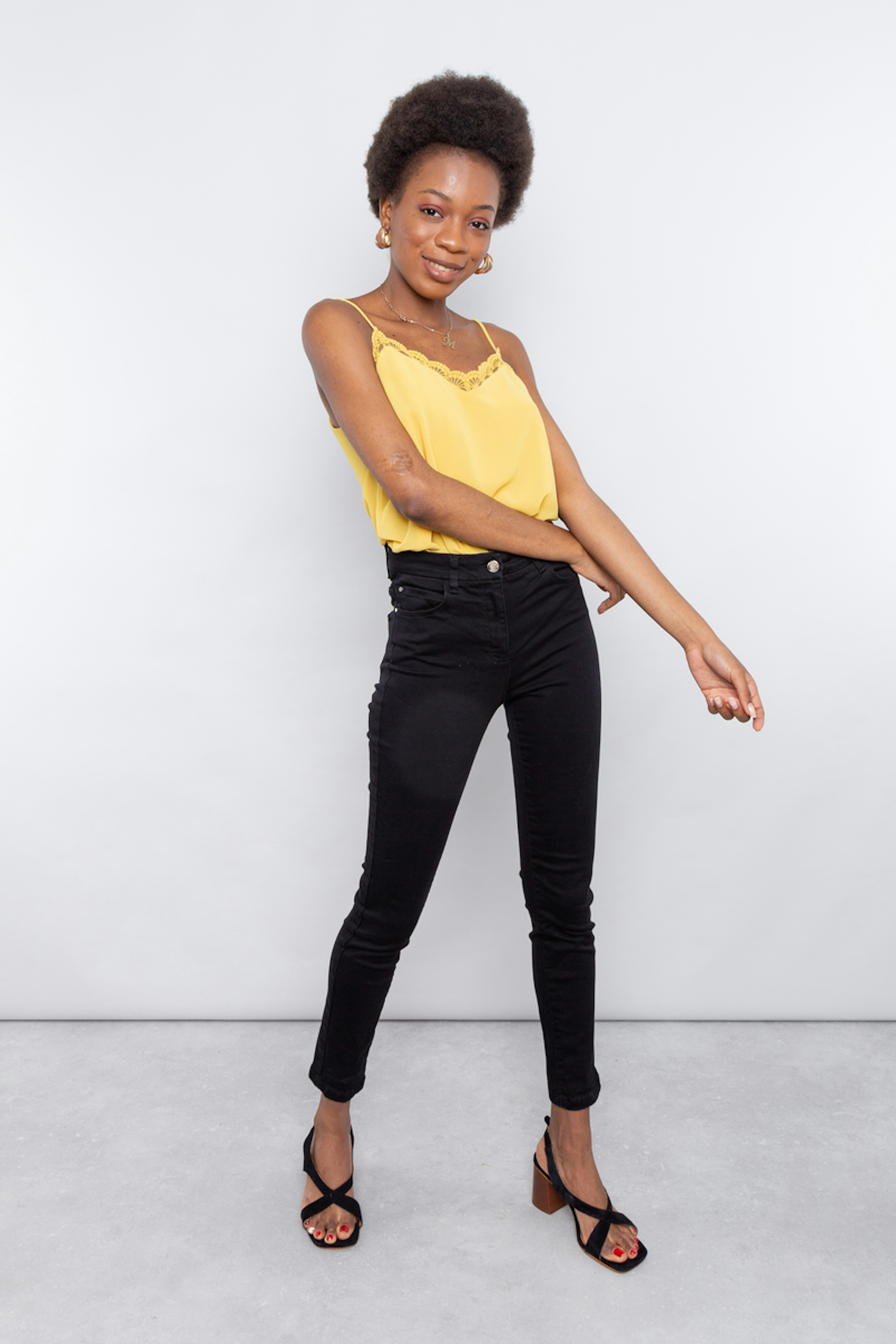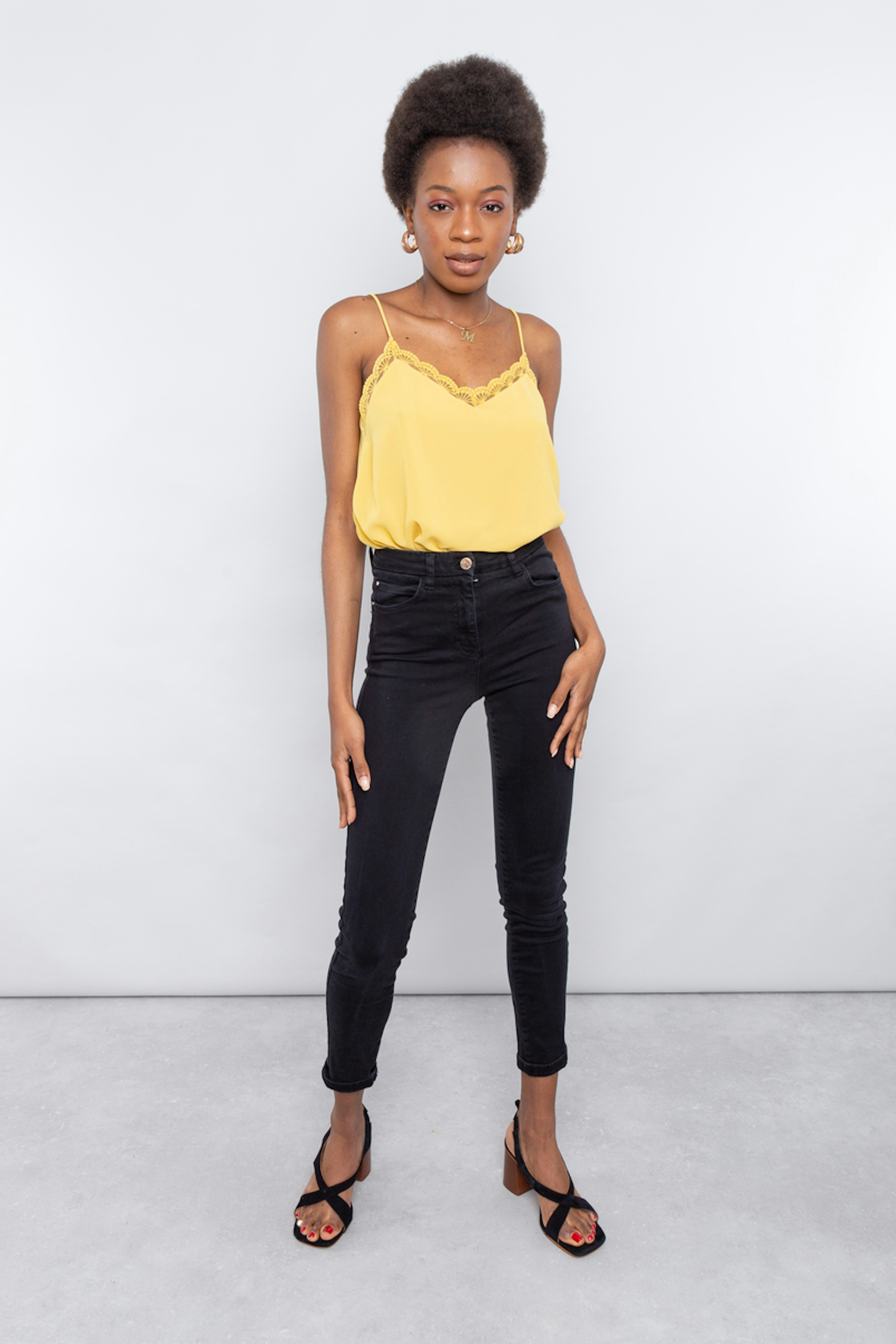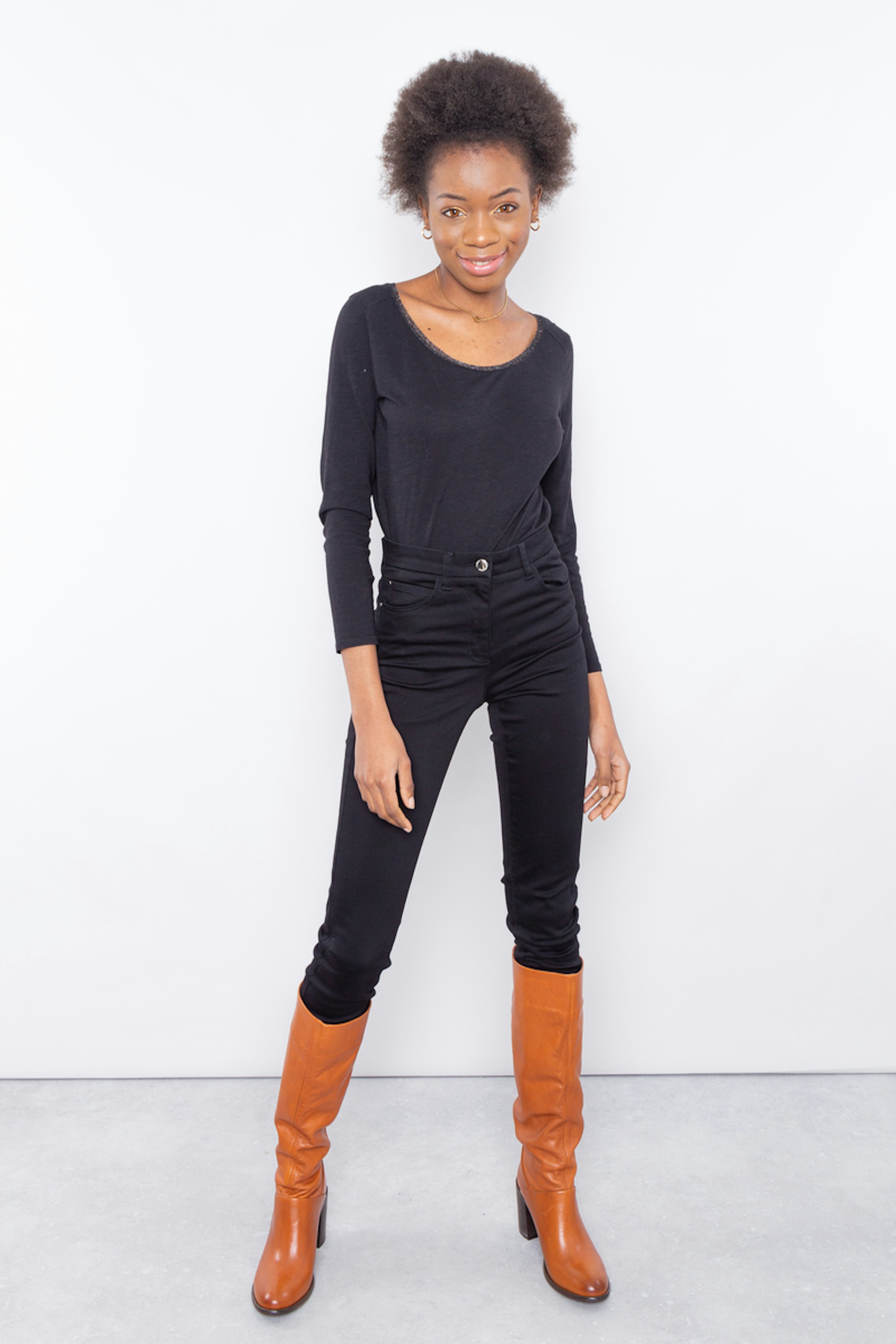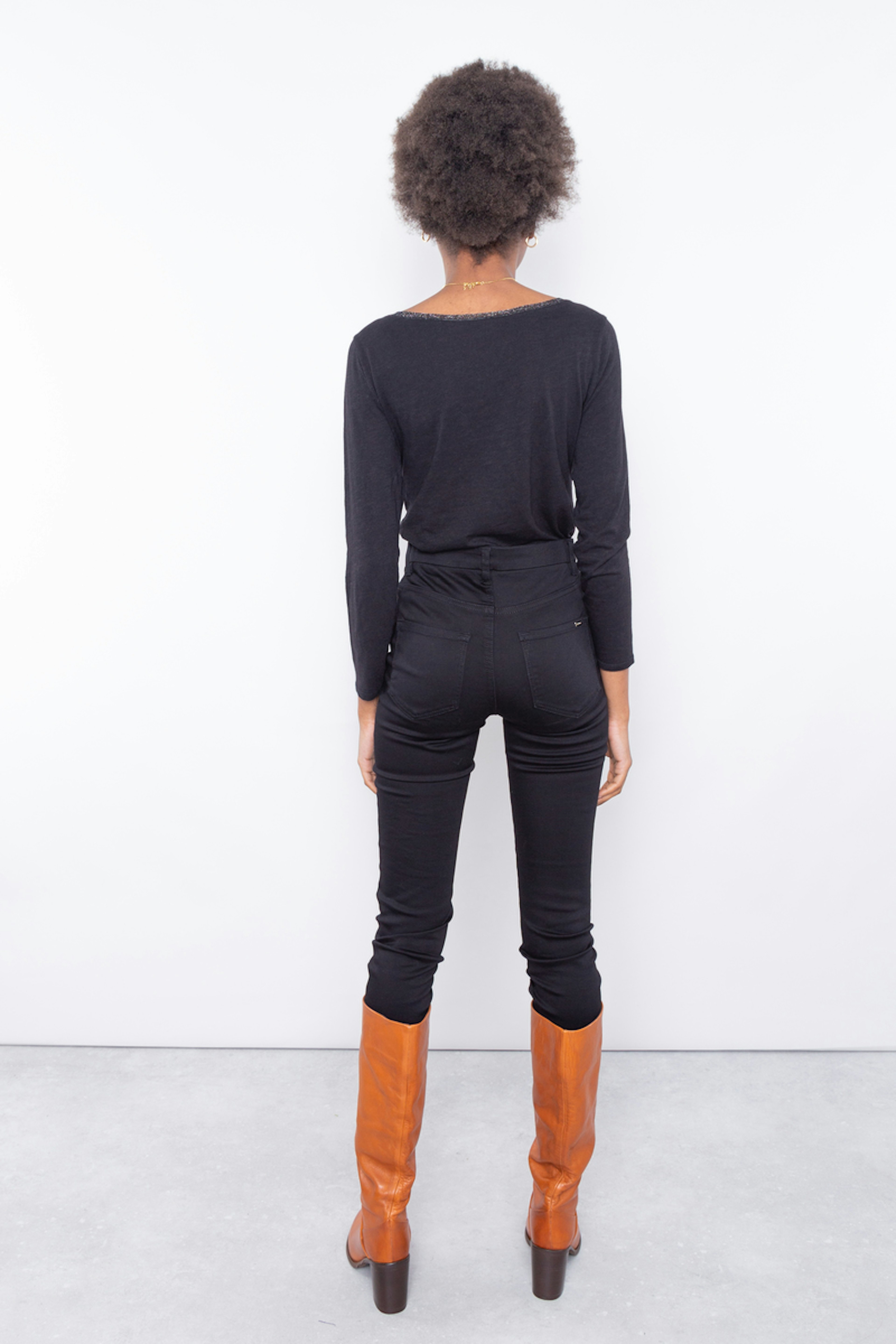 โ€ข Pantalon slim ร  la coupe ajustรฉe sur toute la jambe noir โ€ข Fermรฉ par un bouton mรฉtallisรฉ gravรฉ "Caroll" et un zip sous patte โ€ข Ceinture montรฉe avec 5 passants โ€ข 3 poches devant dรฉcorรฉs de rivets mรฉtalliques โ€ข 2 poches plaquรฉes au dos โ€ข Jacqueron mรฉtallisรฉ gravรฉ "Caroll", brodรฉ sur une poche dos