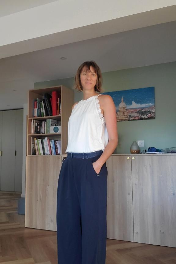 “La matière est agréable a porter et ne se froisse pas. Je n'ai pas aimé la ceinture en jean qui casse la fluidité du pantalon.”