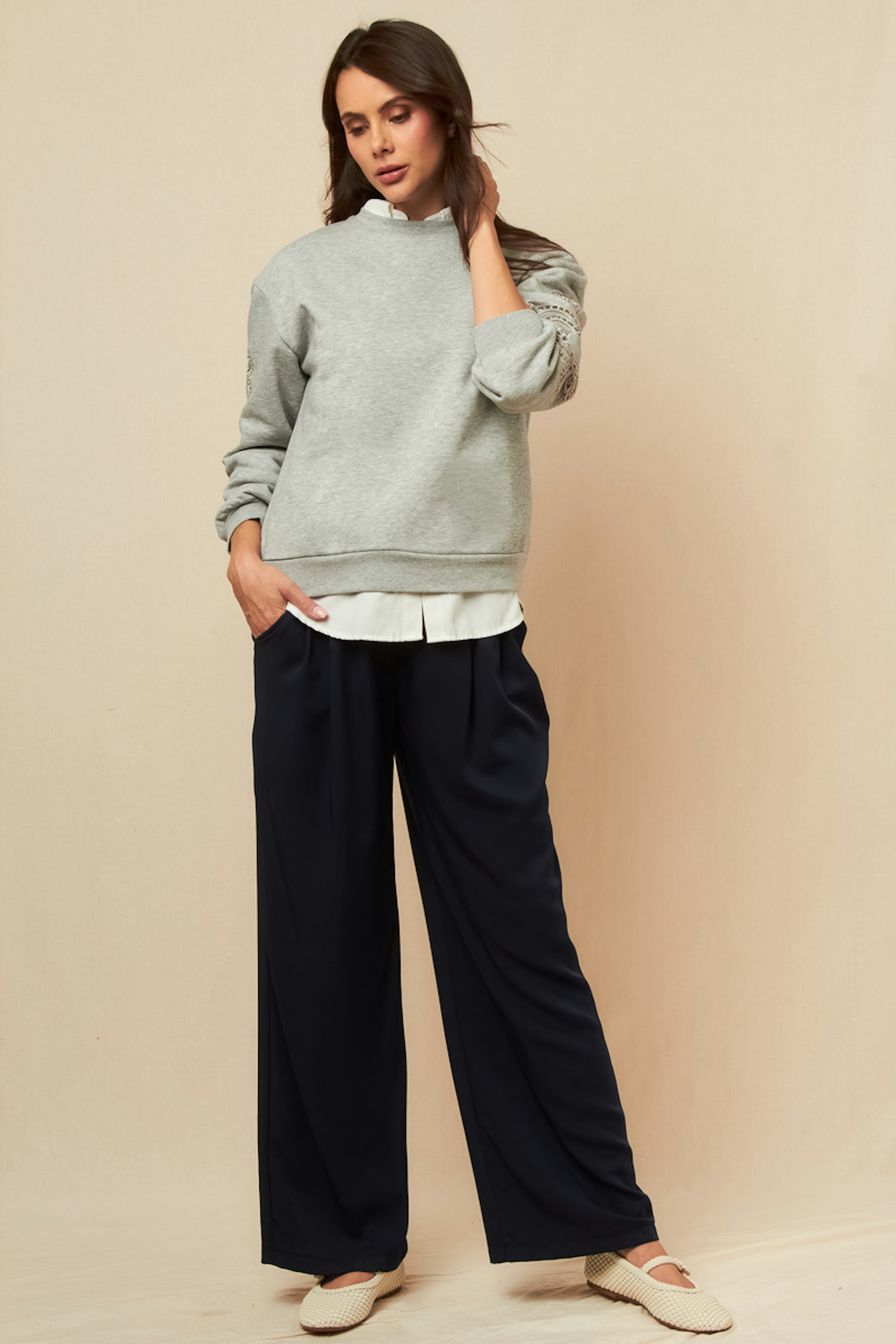 Ce pantalon bleu est idéal avec un top ajusté ou une blouse fluide pour une allure sophistiquée. Ajoutez des talons pour allonger la silhouette. • Pantalon large • Taille standard • Plis sur le devant • Ourlet droit