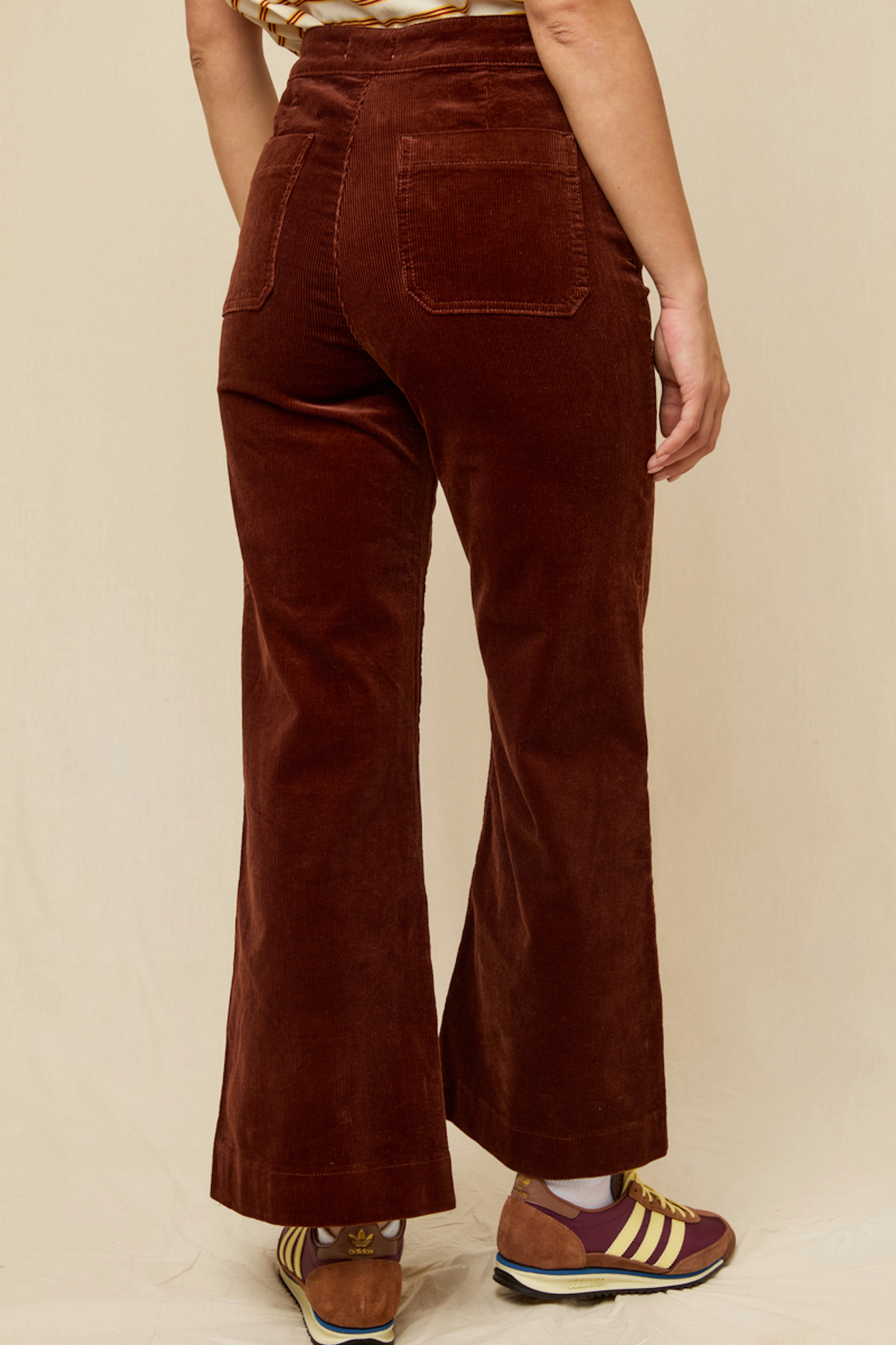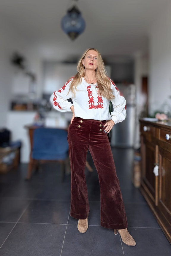 Ajoutez une touche chic avec des bottines à talons et un pull oversize. Idéal pour les journées fraîches. • Pantalon en velours côtelé • Taille haute • Coupe large • Double rangée de boutons • Couleur marron chaleureuse
