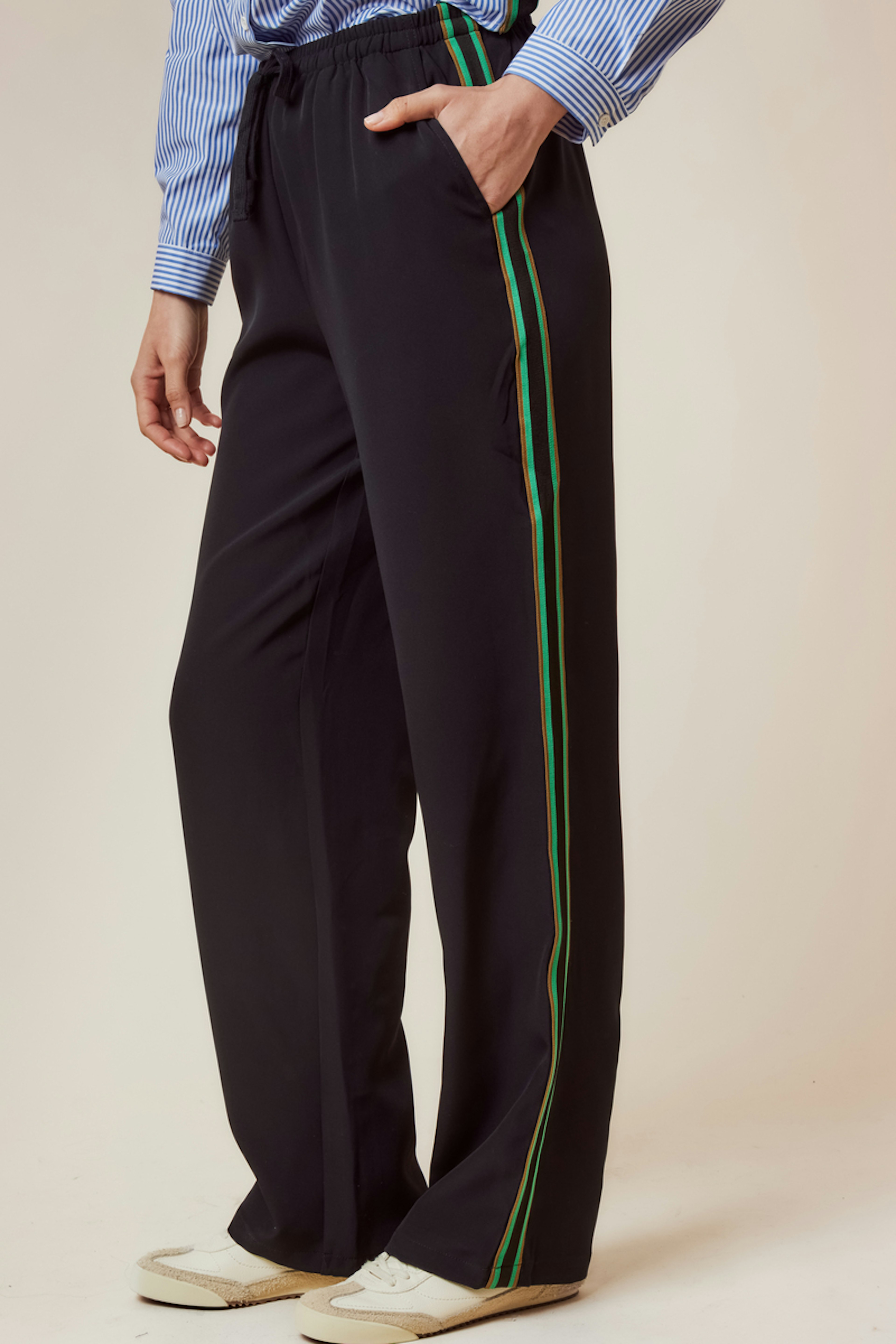 Pour un look dynamique, associez ce pantalon à une chemise blanche et des baskets minimalistes. Idéal pour affronter le froid avec style. • Pantalon à rayures • Coupe large et confortable • Taille élastiquée • Détail bande latérale • Parfait pour un style décontracté