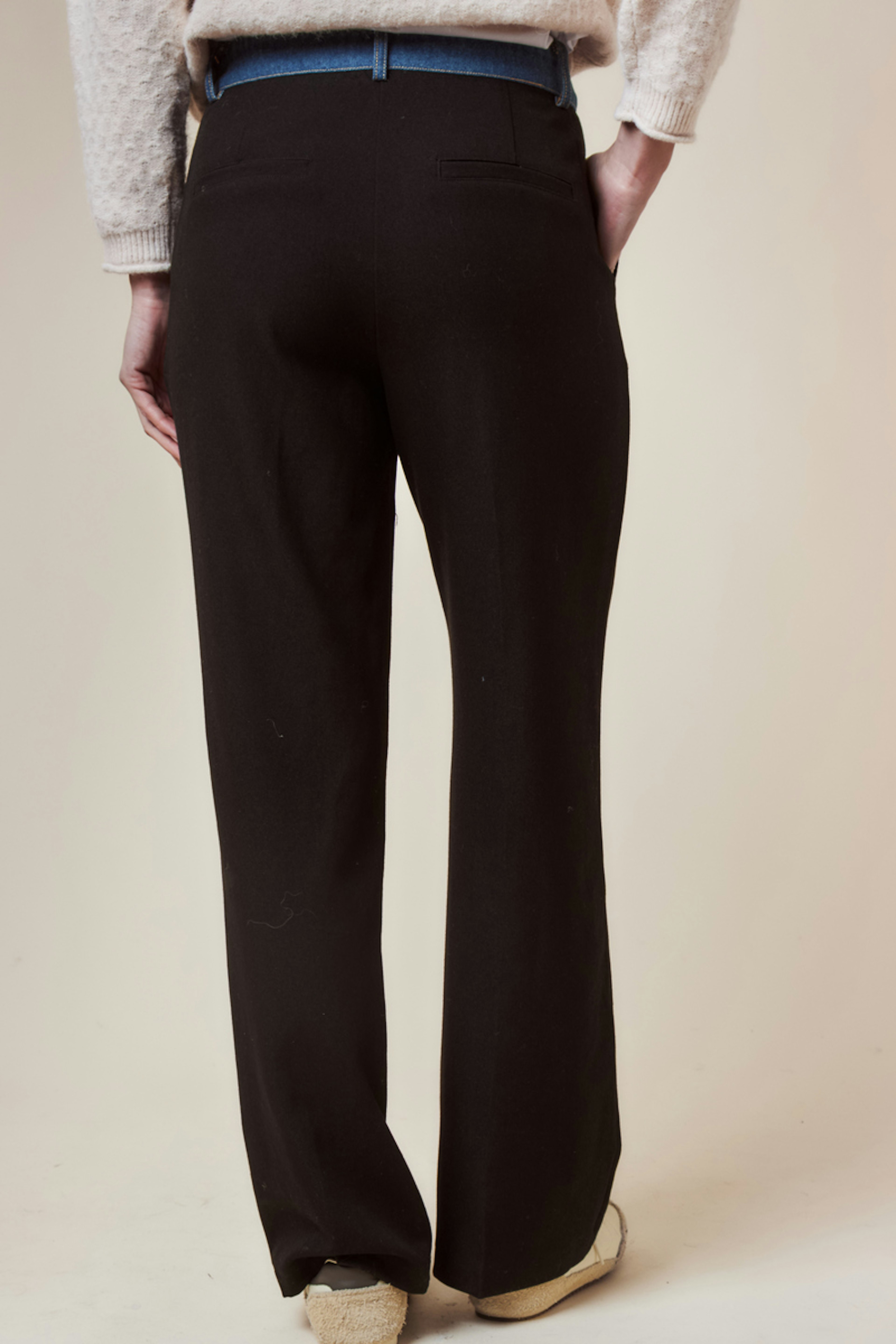 Associez ce pantalon avec une maille douce et des bottines pour un look chic cet hiver. • Pantalon droit noir • Coupe large • Taille mi-haute • Longueur pleine • Détail ceinture contrastée