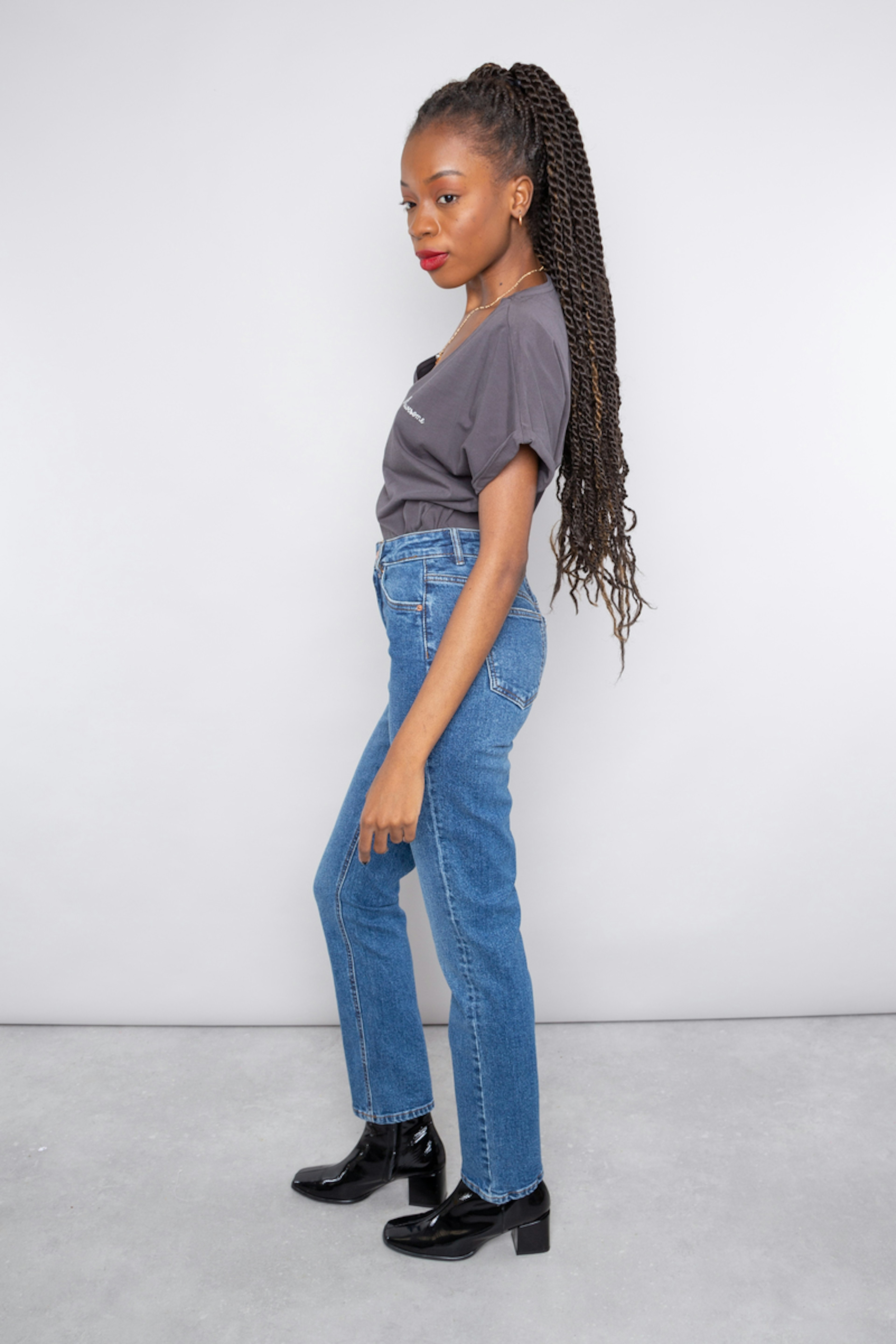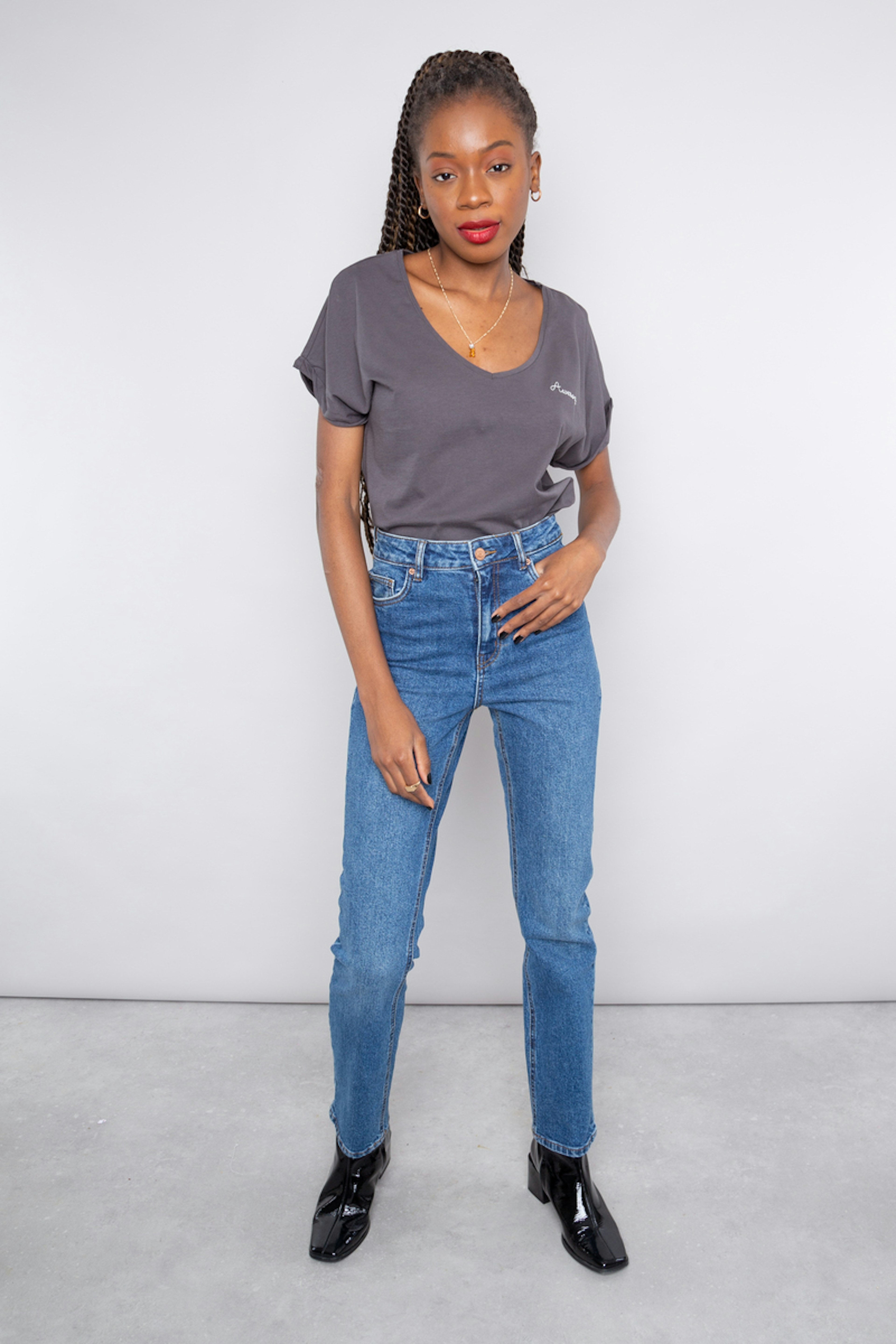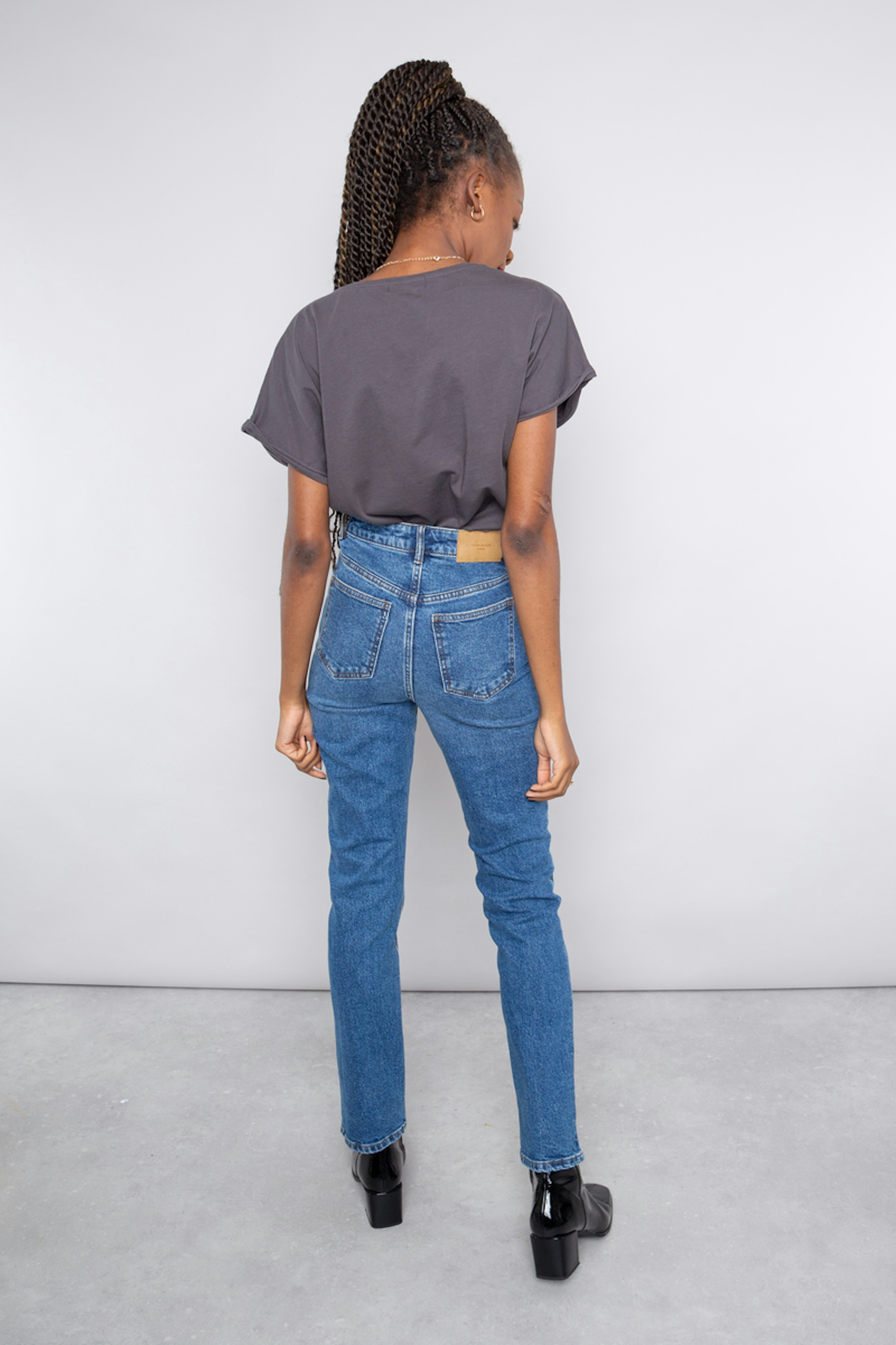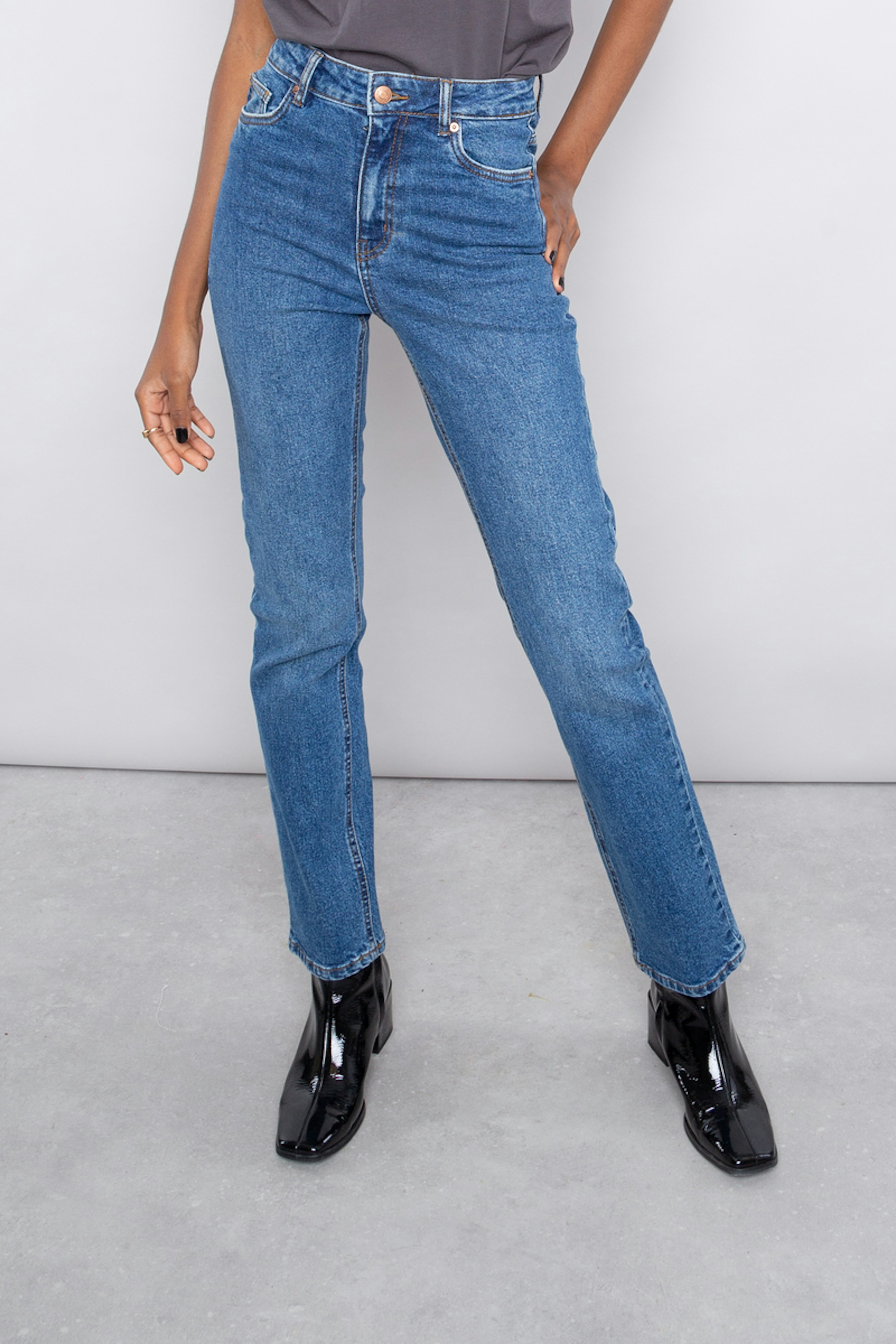 โข Jean taille haute bleu โข Coupe droite โข 5 poches โข Passants pour la ceinture