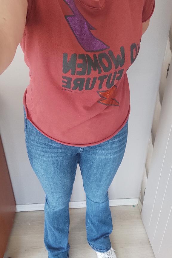 โข Pantalon en denim โข Coupe flare โข Dรฉlavage lรฉger โข 5 poches โข Passants pour ceinture