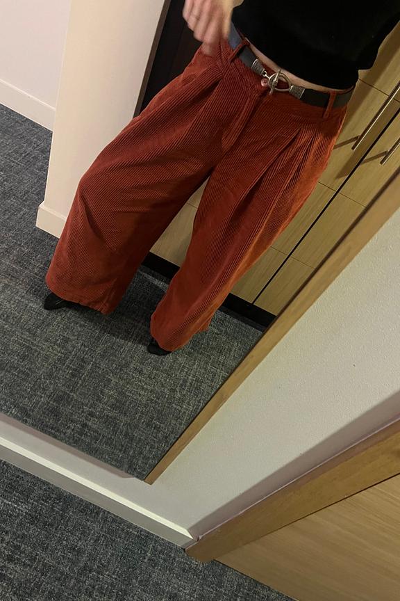 Associez ce pantalon à un haut ajusté et des bottines pour une allure distinguée et confortable. • Pantalon en velours côtelé • Coupe ample et fluide • Taille haute flatteuse • Plis élégants à l'avant • Teinte orange vibrante