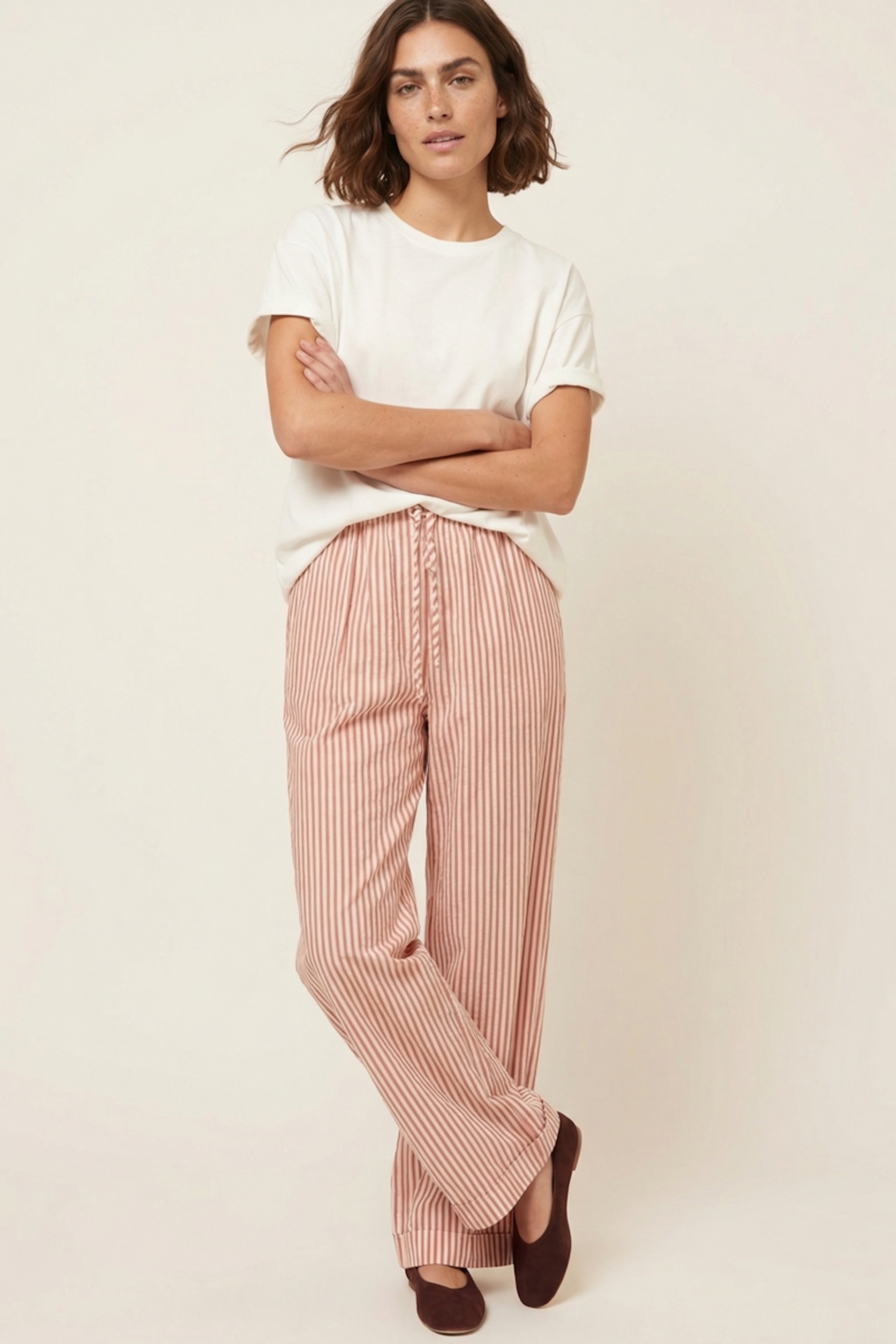 Ajoutez une touche bohème en associant ce pantalon fluide à un débardeur en lin et des sandales en cuir pour une journée d'été décontractée. • Pantalon à rayures • Coupe large et fluide • Taille élastique avec cordon • Longueur ample • Rayures verticales