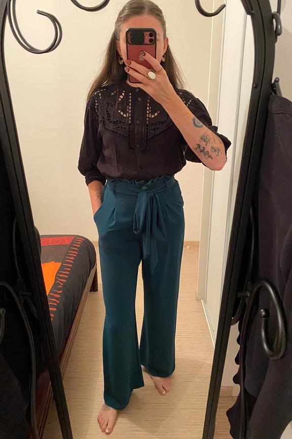โBeau tissu, souple et ne se froisse pas. Trรจs long par contre et un peu grand pour un 36 : on peut resserrer ร la taille heureusement.โ