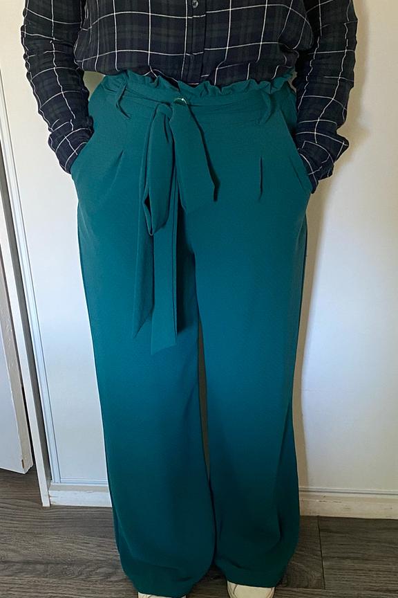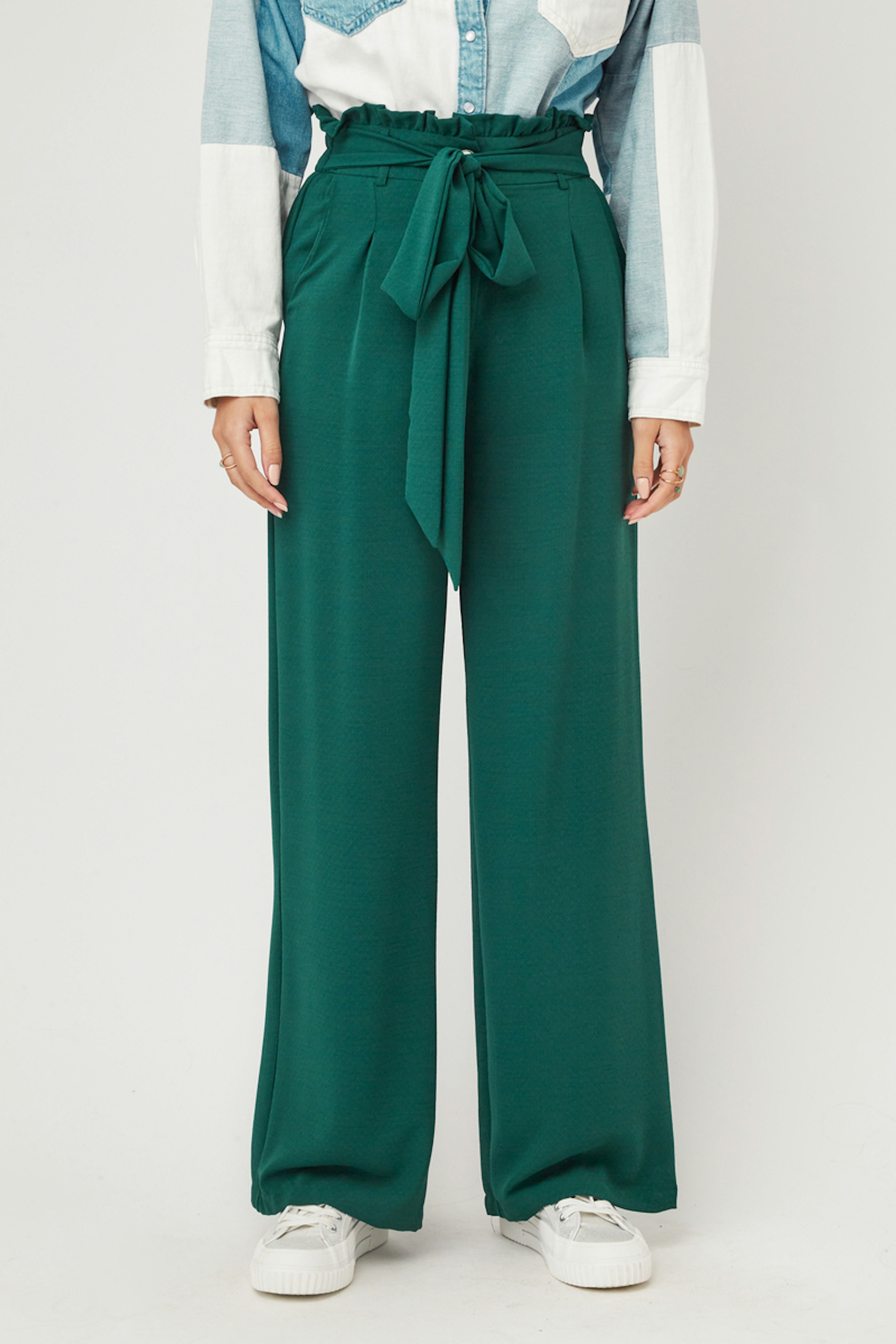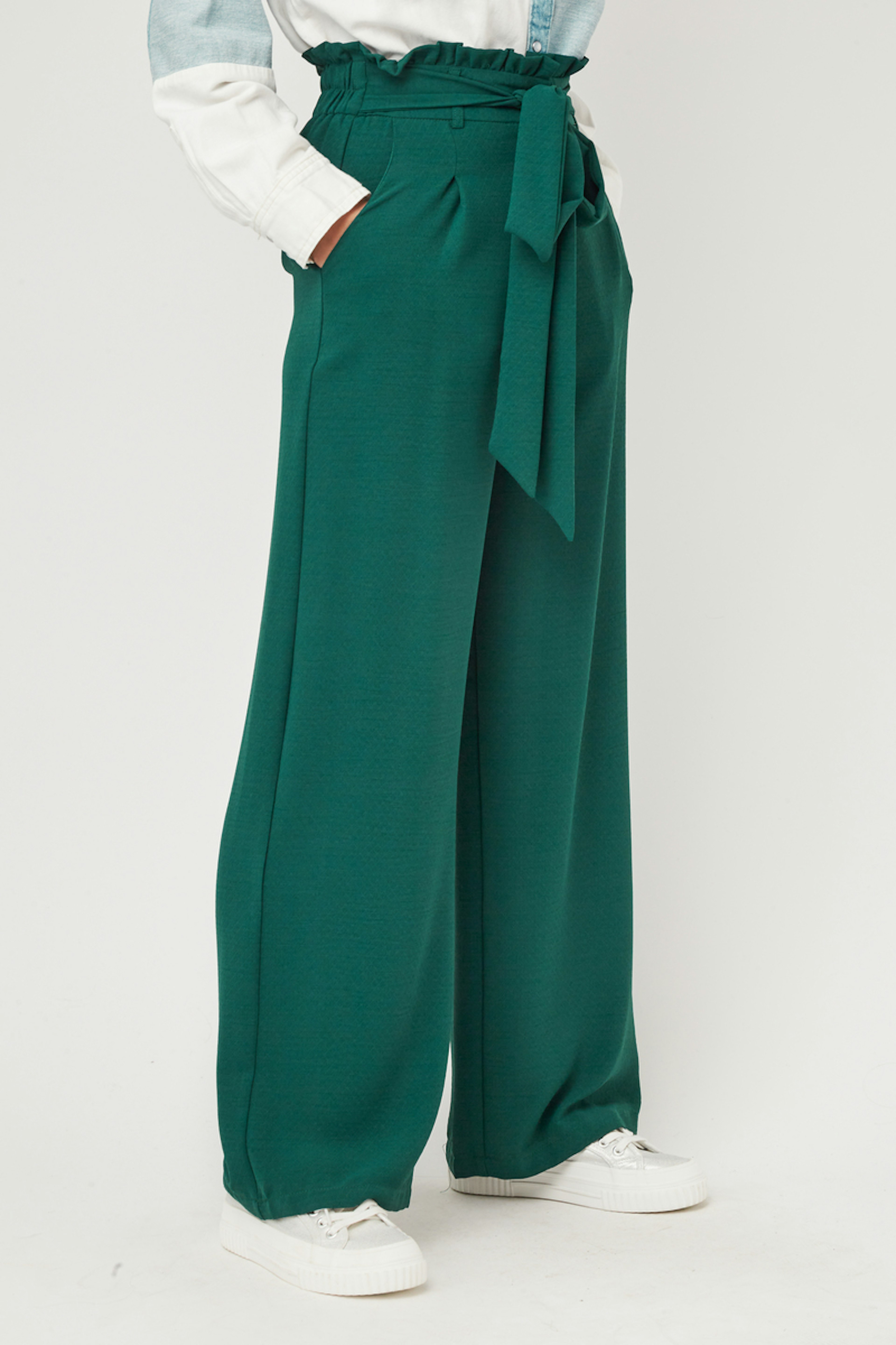 โข Pantalon large de coupe droite โข Tissu fluide en viscose ร plumetis โข Volants ร la taille โข Taille รฉlastiquรฉe โข Ruban ร nouer ร la ceinture โข Fermeture bouton รฉmaillรฉ โข Deux poches cavaliรจres sur les cรดtรฉs
