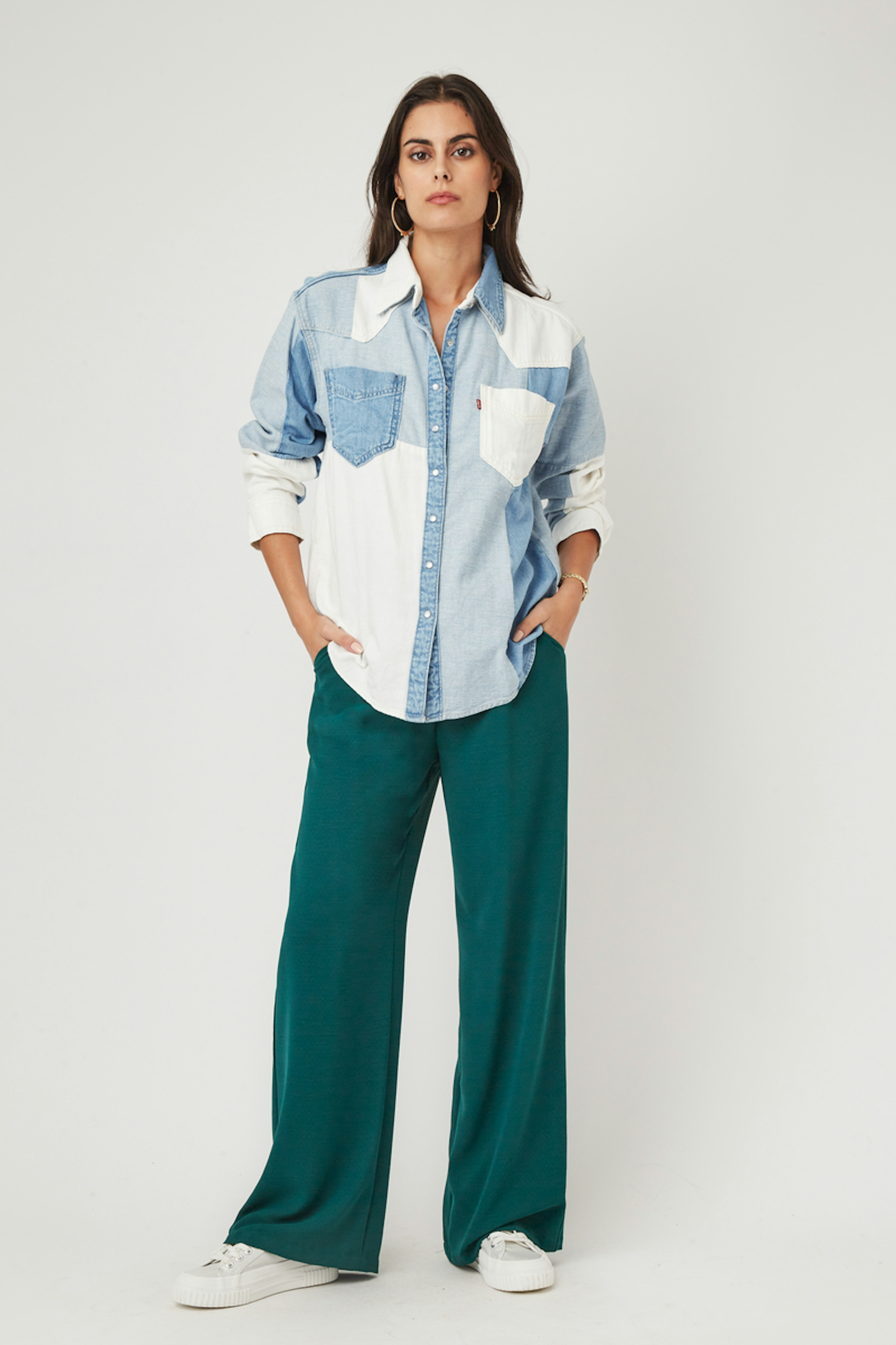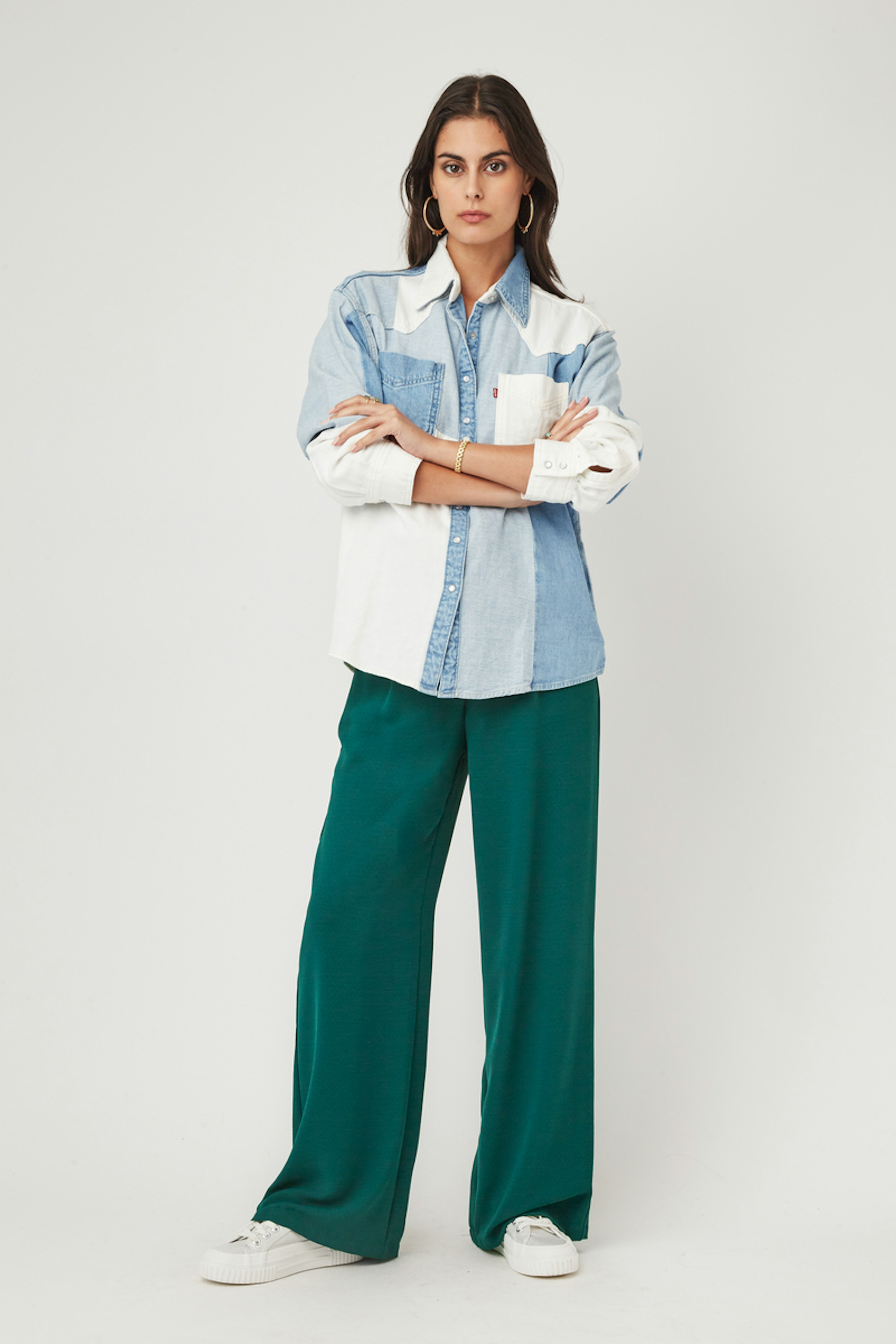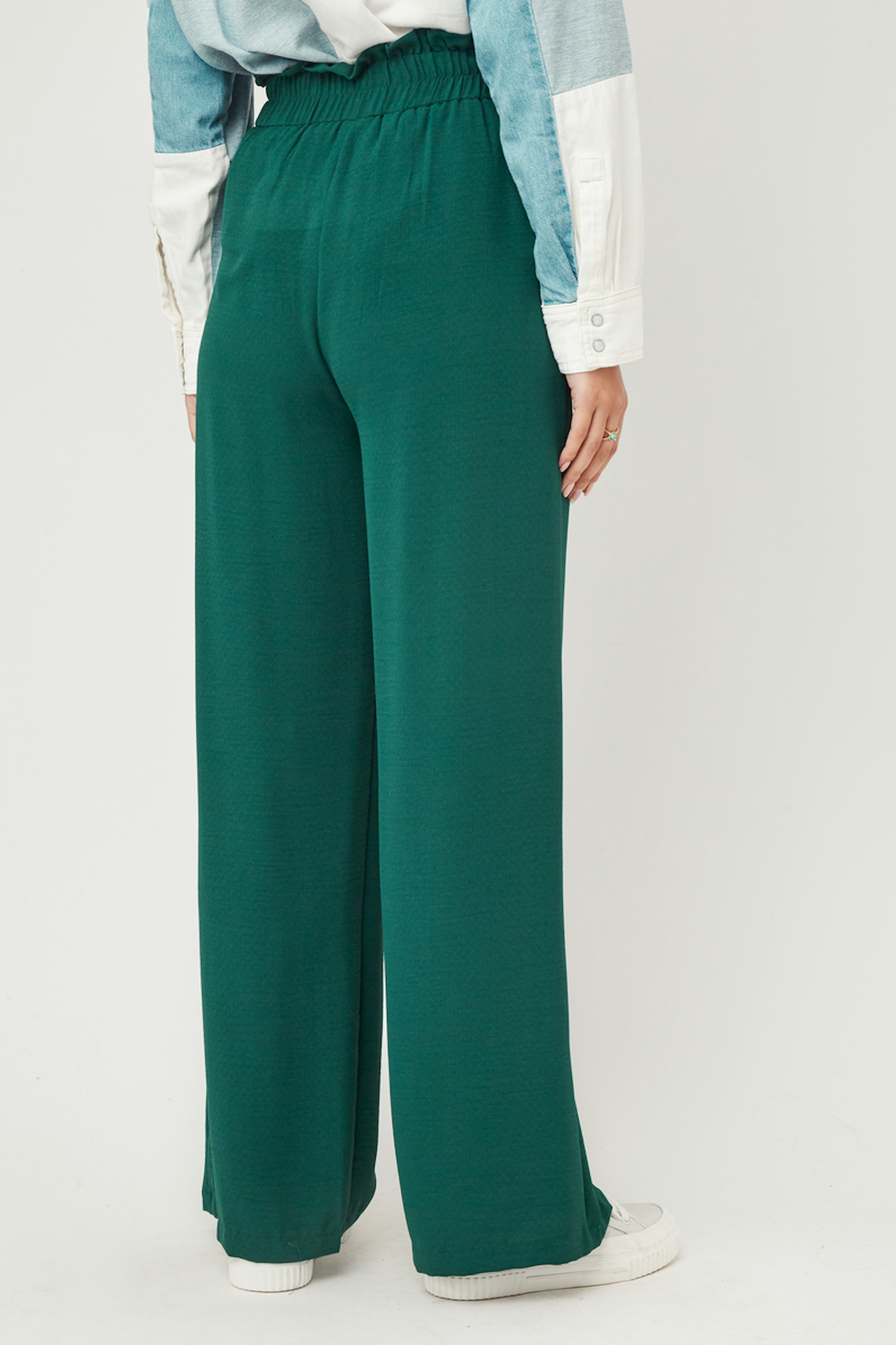 โข Pantalon large de coupe droite โข Tissu fluide en viscose ร plumetis โข Volants ร la taille โข Taille รฉlastiquรฉe โข Ruban ร nouer ร la ceinture โข Fermeture bouton รฉmaillรฉ โข Deux poches cavaliรจres sur les cรดtรฉs