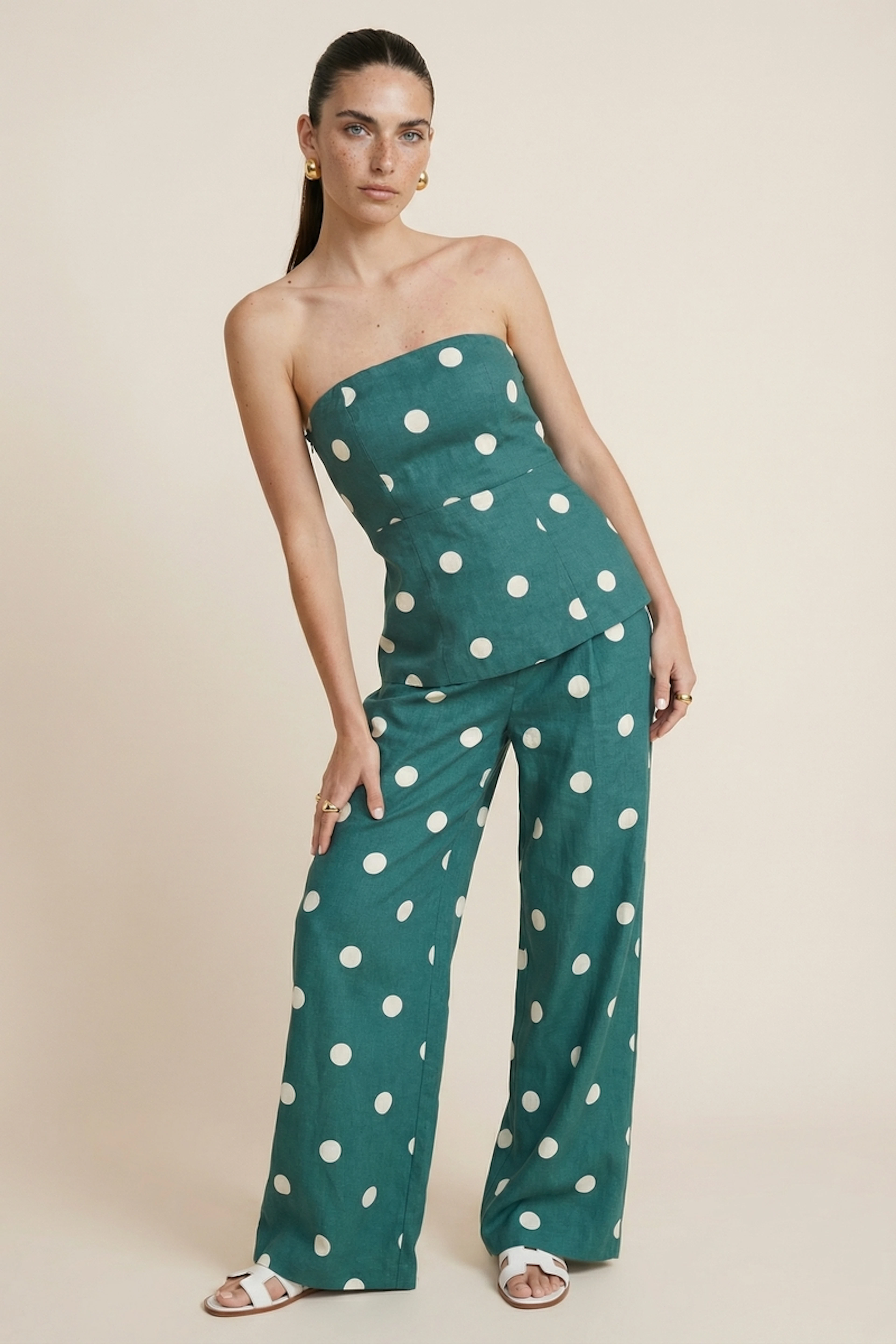 Ajoutez une touche de chic avec un top blanc minimaliste et des sandales dorées pour capturer l'essence de l'été. • Pantalon en lin et viscose • Coupe évasée • Taille haute • Imprimé à pois • Fermeture zippée discrète