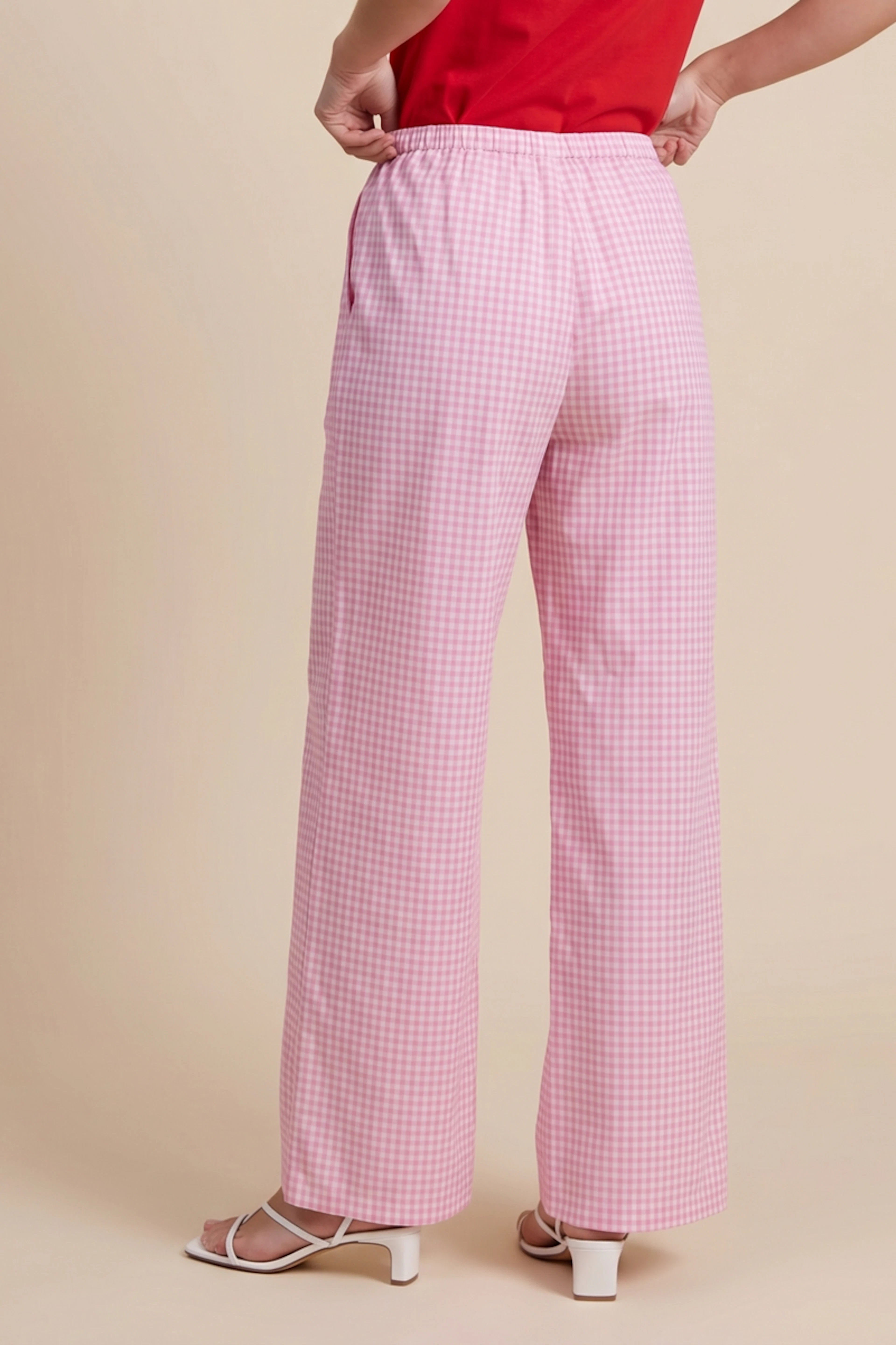 Associe ce pantalon vichy rose avec un haut blanc aérien pour un look estival léger. Ajoute des sandales neutres pour un style sans effort. Parfait pour l'été. • Pantalon en coton • Taille élastiquée avec lien • Coupe ample décontractée • Grandes poches décoratives • Motif vichy rose