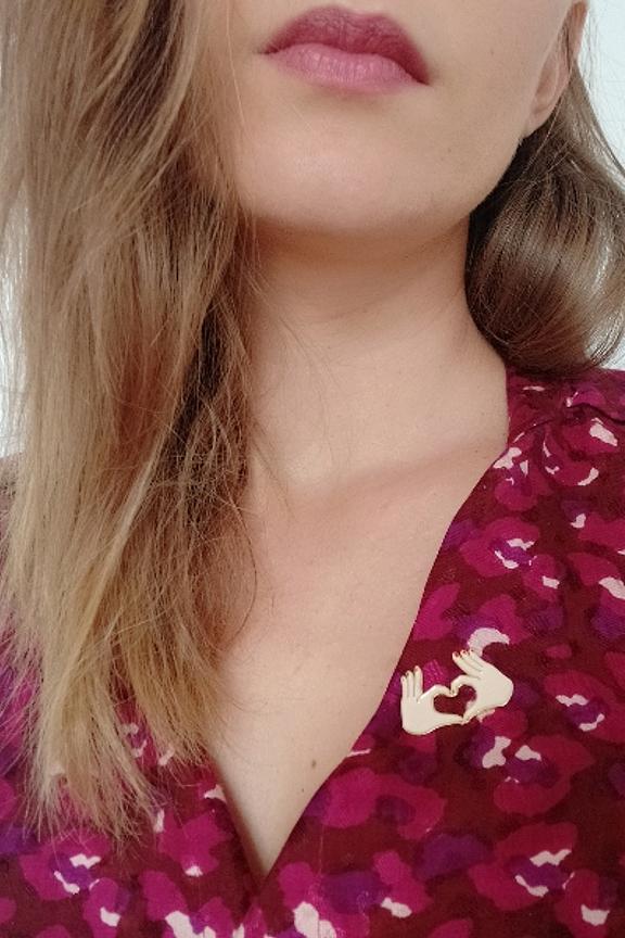 Tel un petit porte bonheur, ce pin's en laiton qui cรฉlรจbre l'amour est ร porter fiรจrement sur une chemise, un pull ou encore un tote-bag.