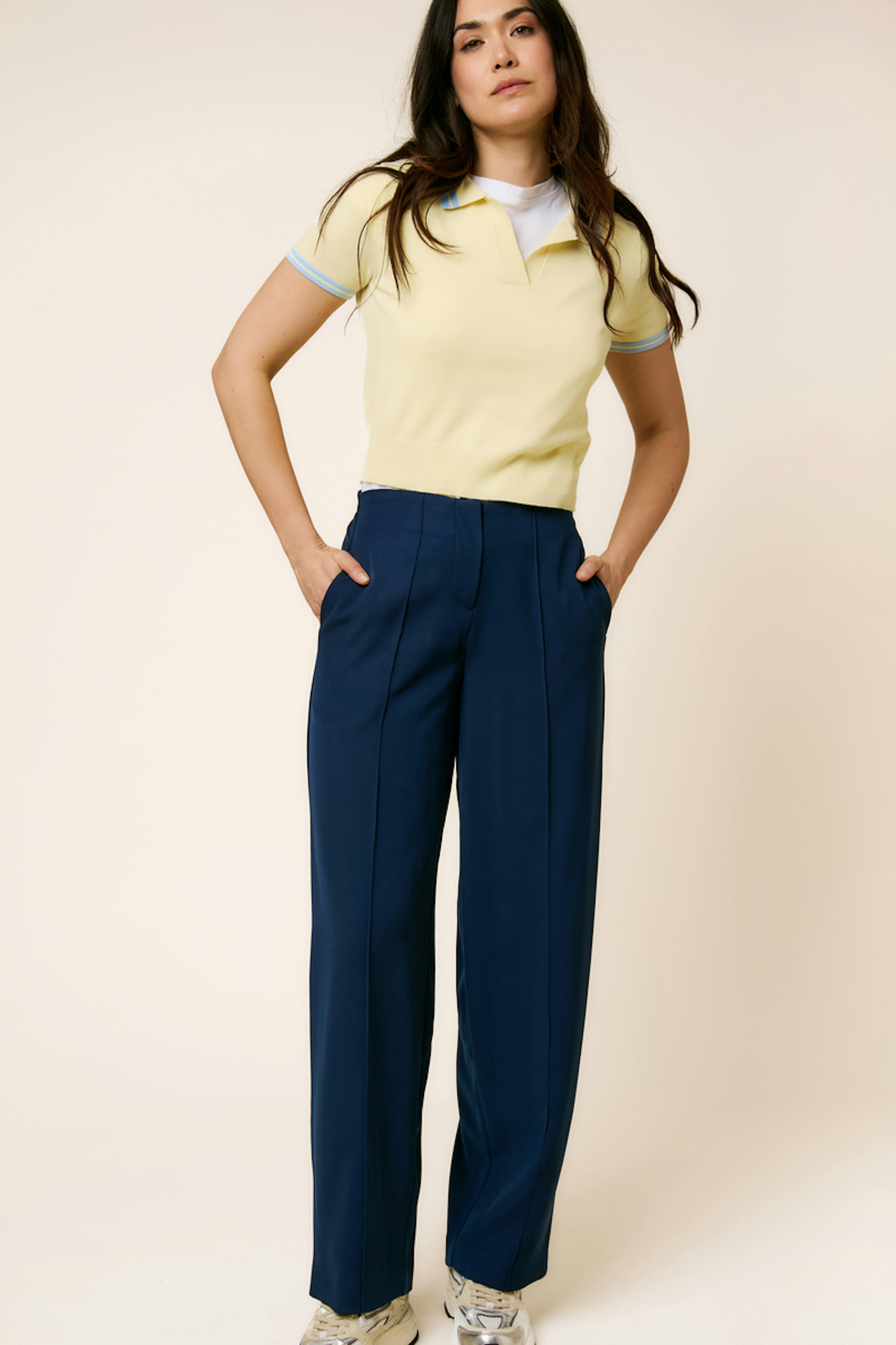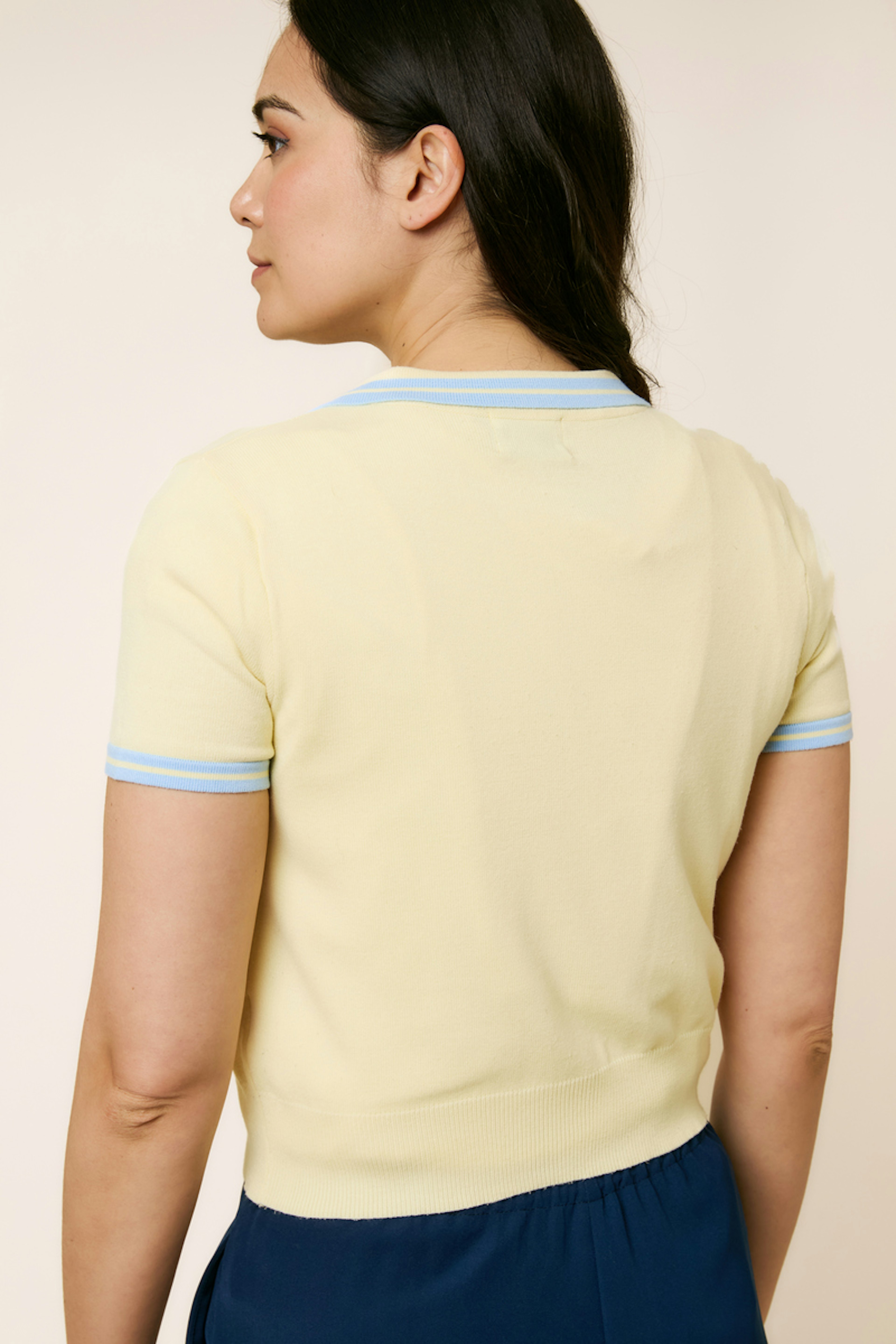 Ajoutez une touche de fraîcheur estivale en portant ce pull jaune avec un jean délavé et des espadrilles. Parfait pour les journées décontractées sous le soleil. • Pull à manches courtes • Coupe décontractée • Col chemise • Bordures contrastées • Texture douce et légère