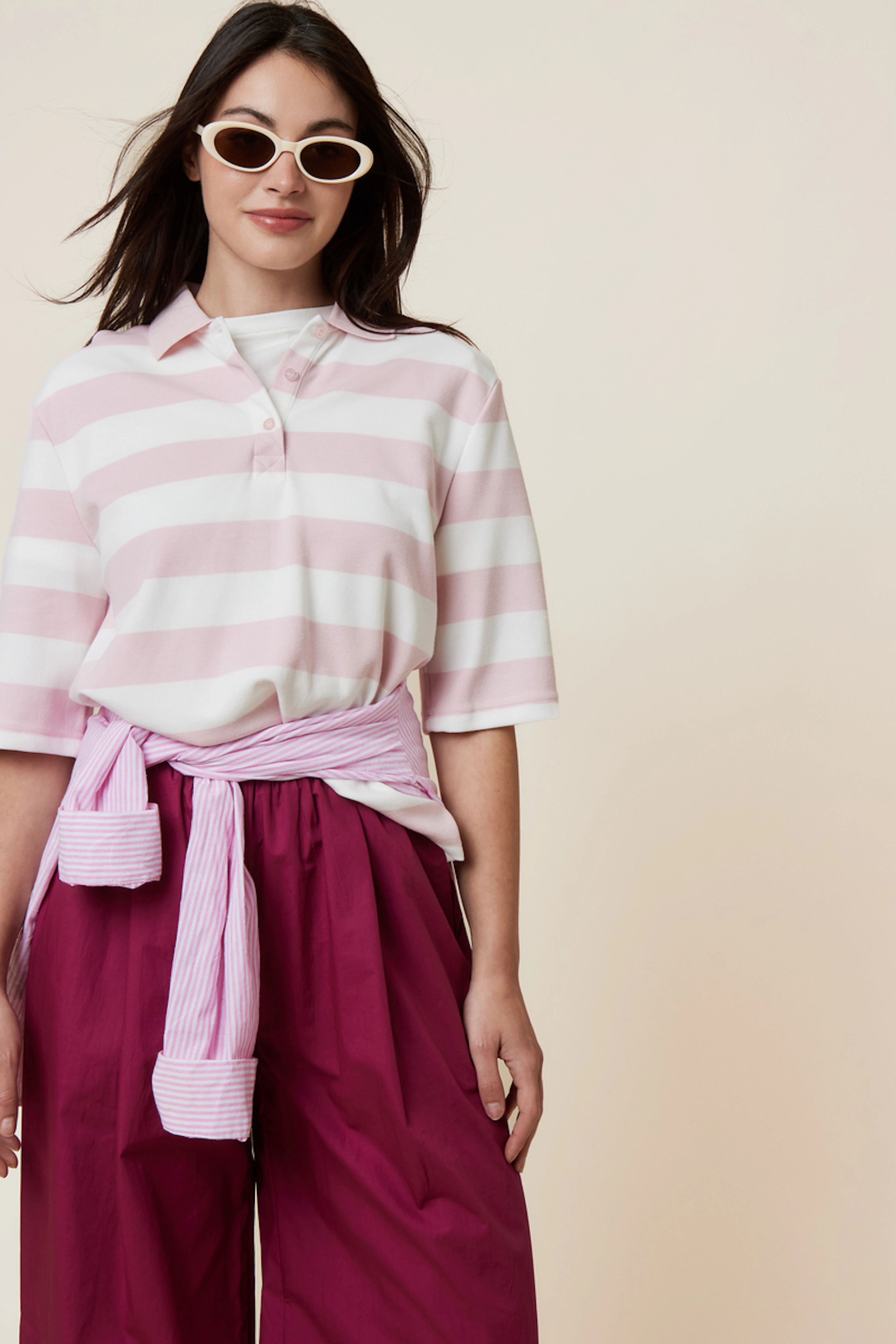 Associez-le à un pantalon blanc pour une allure estivale rafraîchissante. • Haut à manches mi-longues • Coupe décontractée • Rayures roses larges • Col chemise classique • Patte de boutonnage à l'avant
