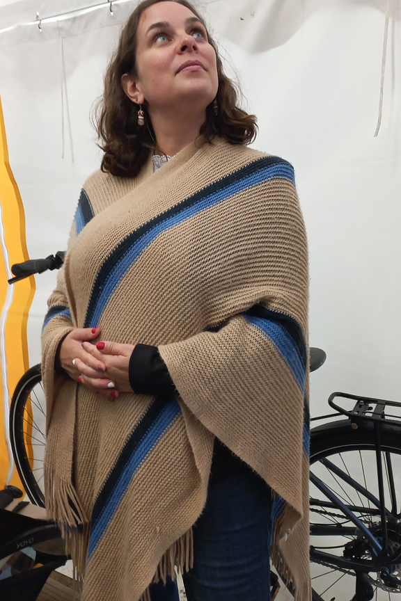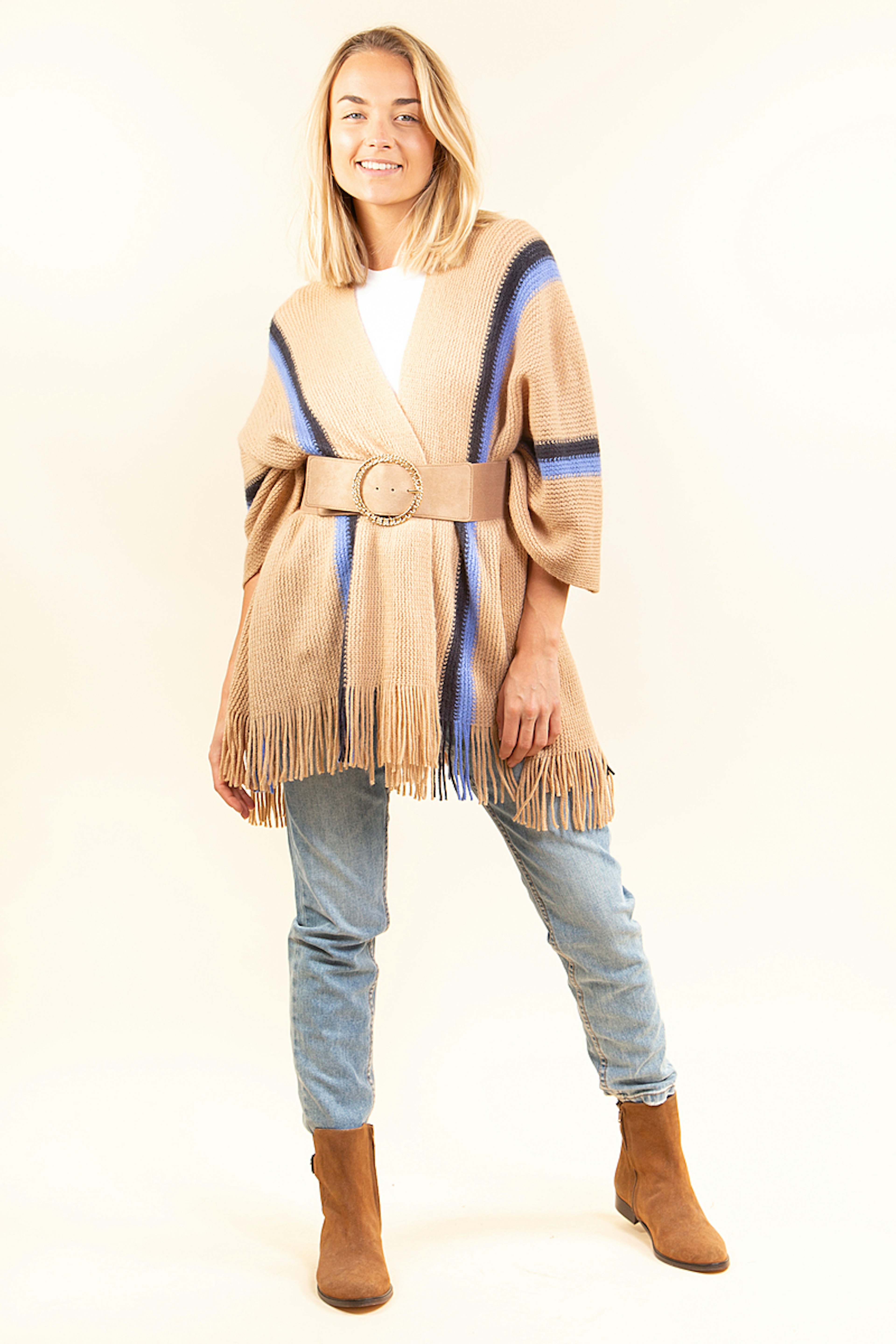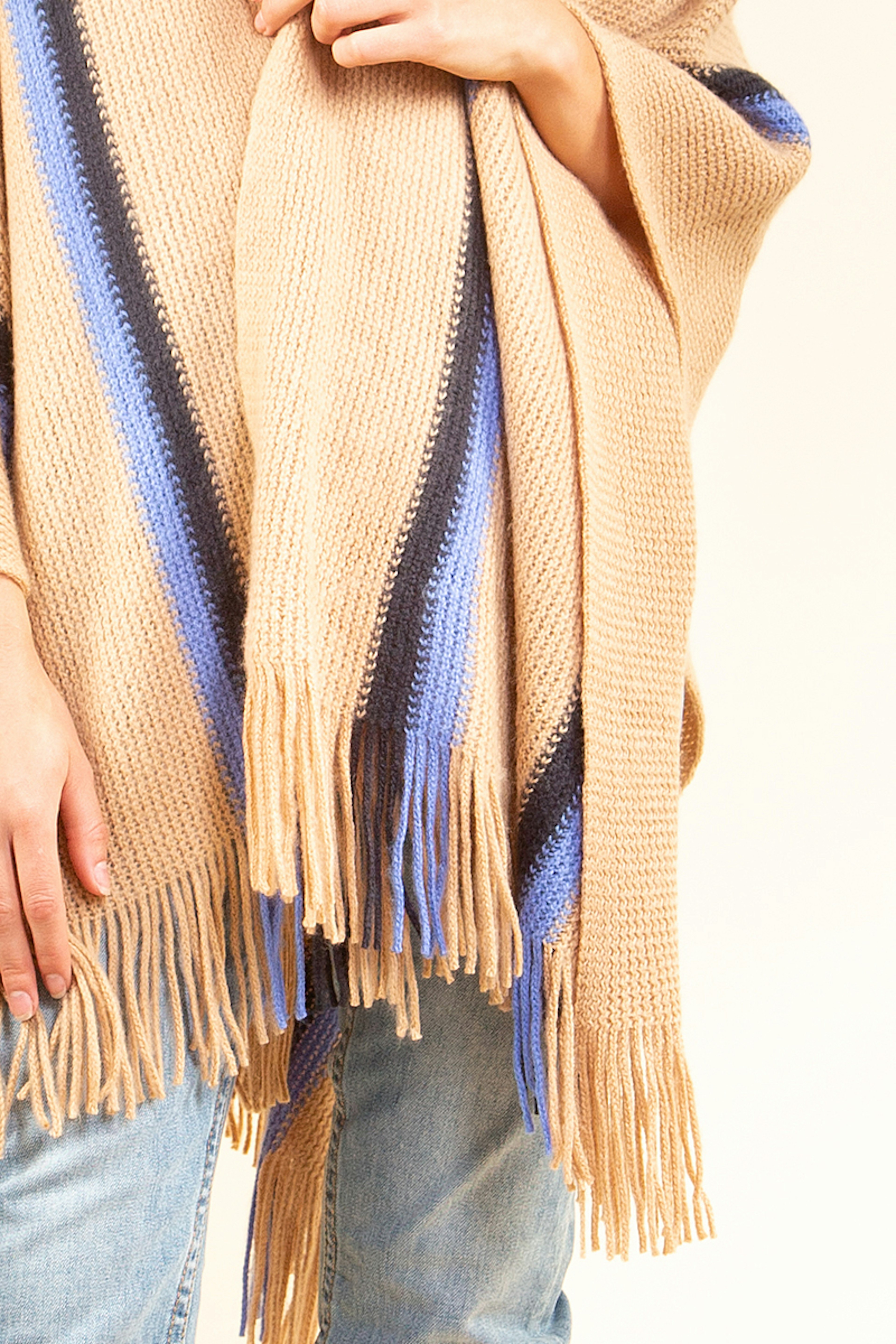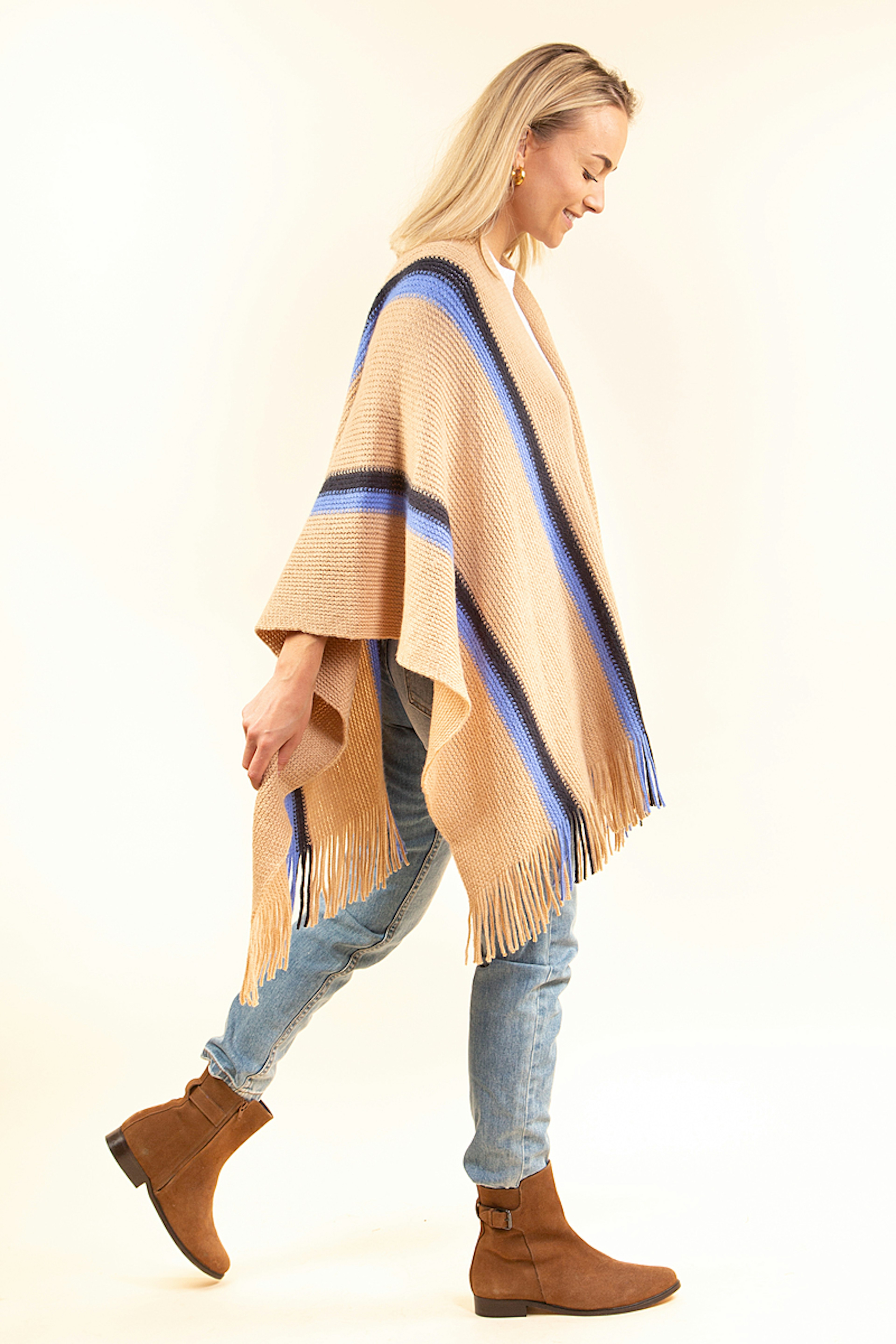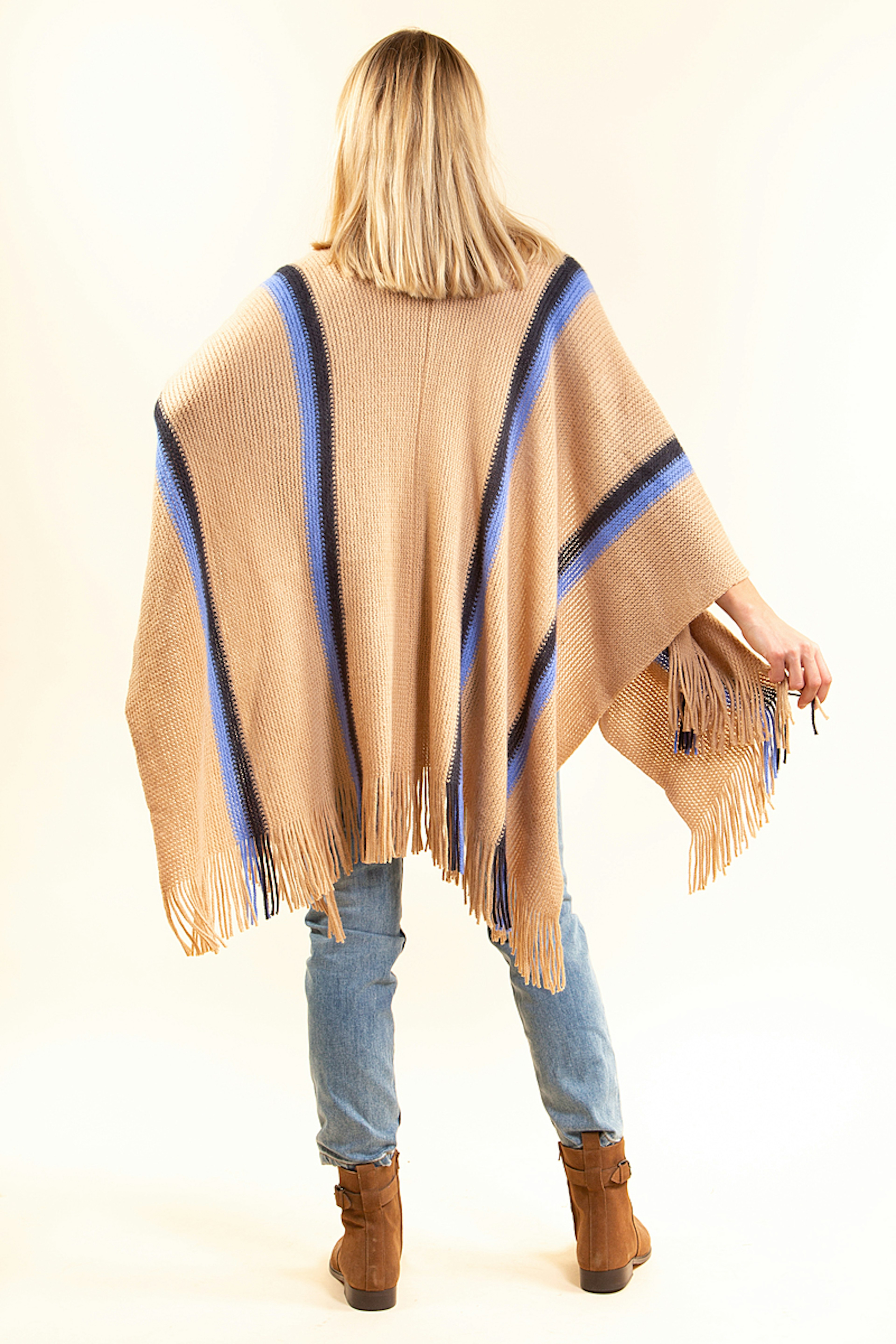โ€ข Poncho d'hiver camel, marine et bleu โ€ข Dรฉtails de franges en bas du poncho โ€ข A porter avec une ceinture ou au-dessus d'une veste en hiver