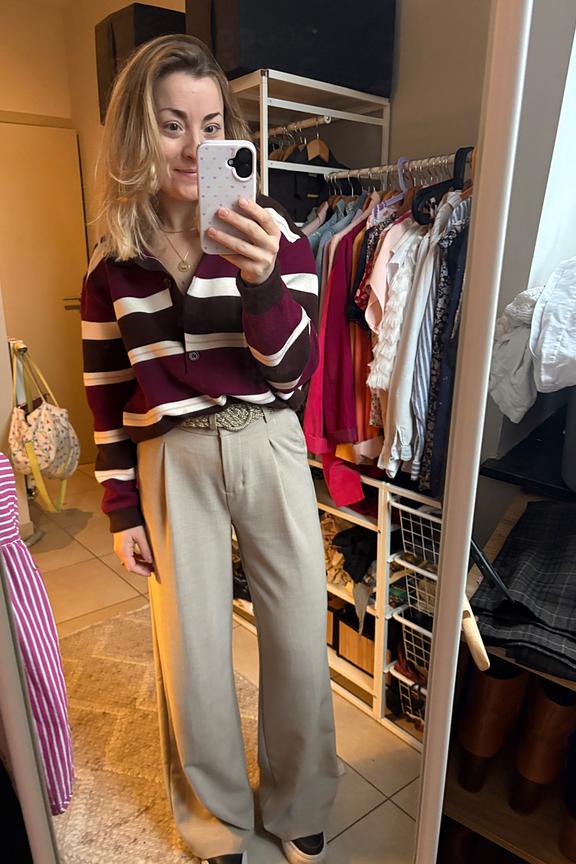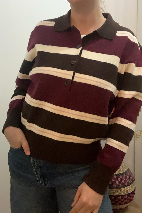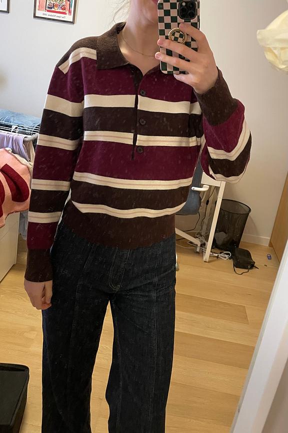 Associez ce pull rayé à un pantalon en laine pour une allure chic et intemporelle. Idéal pour les journées d’hiver. • Pull avec motif rayé • Col chemise • Manches longues • Coupe ample • Fermeture par boutons