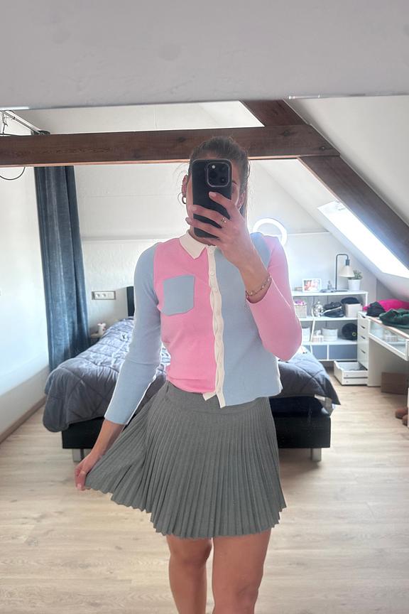 Associez ce pull bicolore avec un jean blanc et des baskets pour une allure douce et moderne en hiver. • Pull avec laine • Col chemise classique • Boutonnage élégant • Manches longues • Coloris bicolore pastel