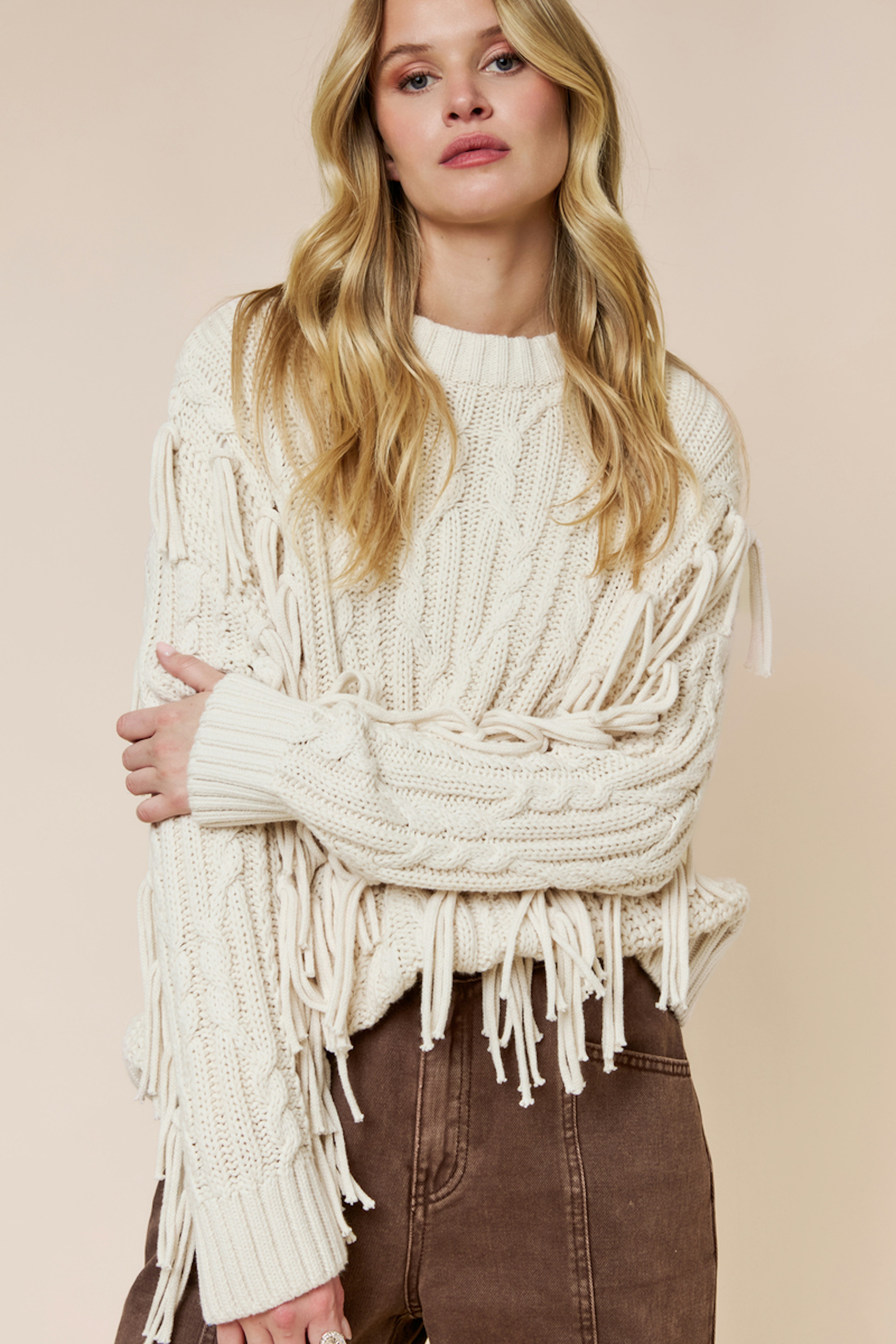 Portez-le avec un jean et des bottines pour un look cosy chic cet hiver. • Pull en coton biologique • Coupe ample pour un confort optimal • Manches longues avec franges • Design à torsades • Bord-côte à la base