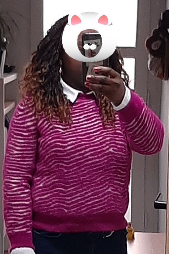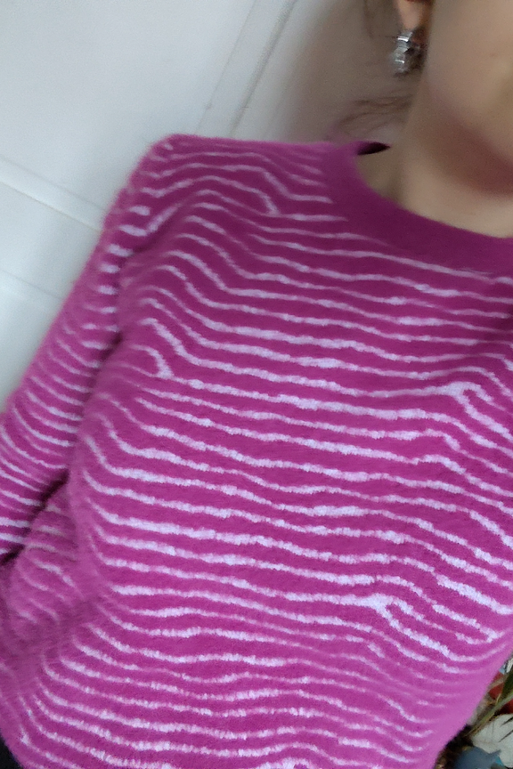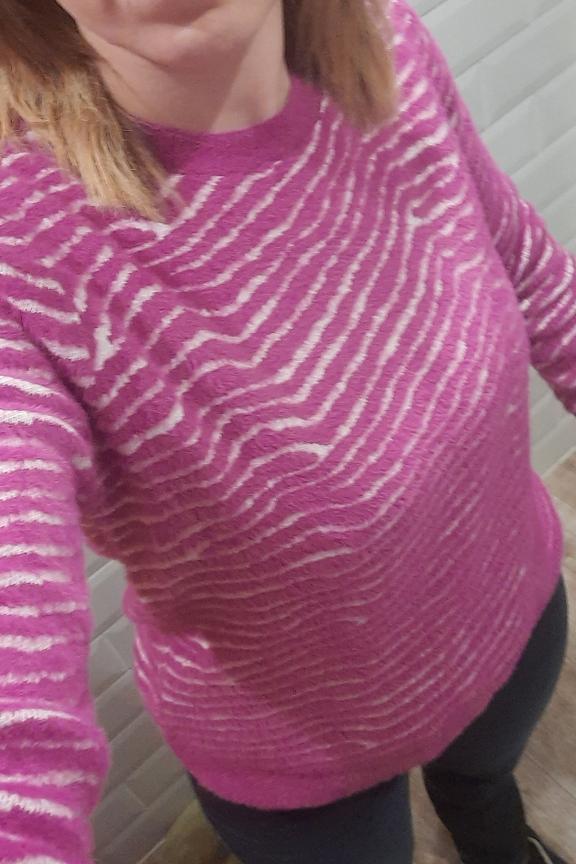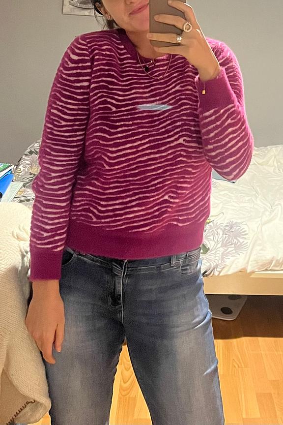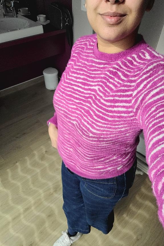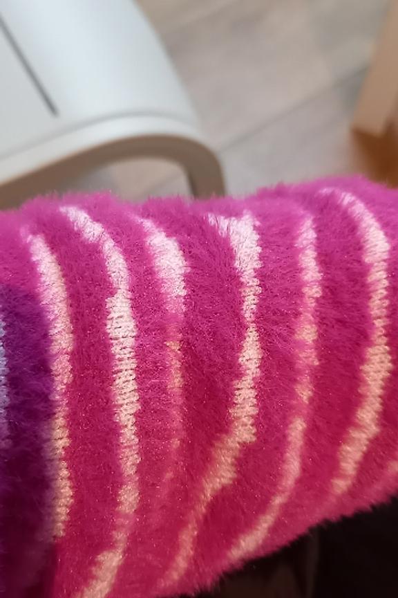 โข Pull en maille imprimรฉ zรจbre rose et blanc โข Encolure ronde โข Finitions bord-cรดtes โข Tout doux