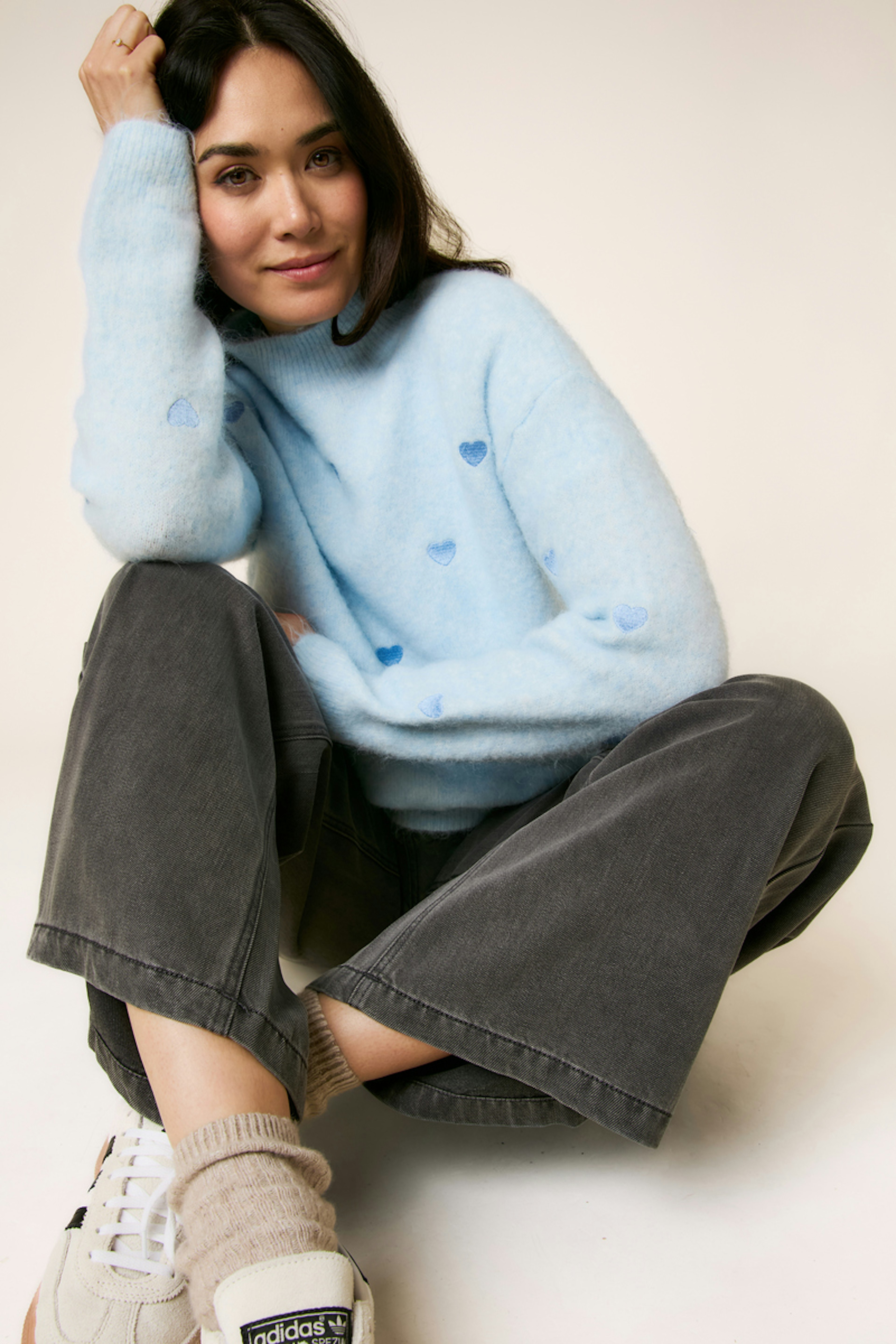 Associez ce pull bleu à un pantalon noir ajusté et des bottines pour un look hivernal chic. • Pull imprimé • Coupe décontractée • Col rond • Manches longues • Motif cœurs