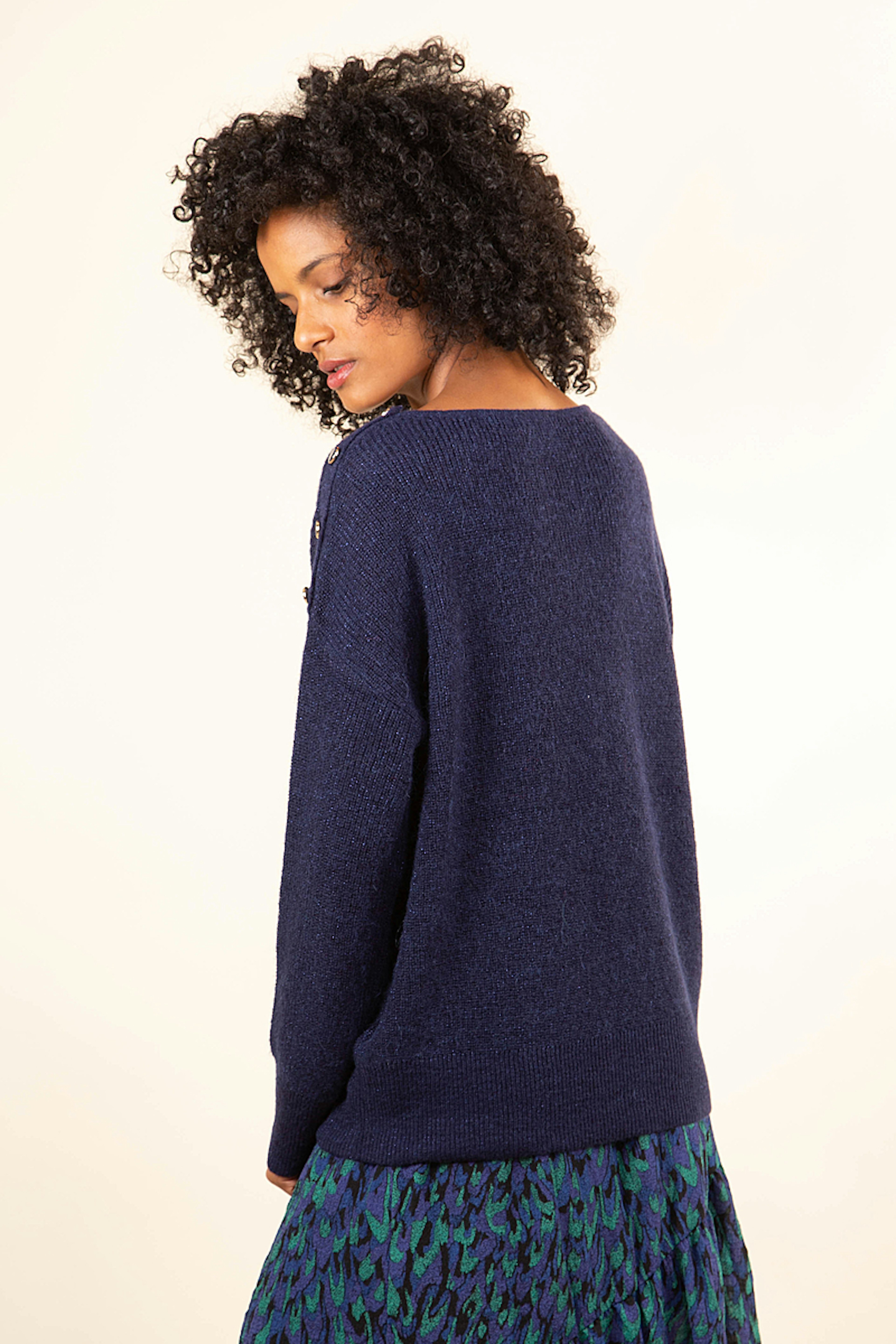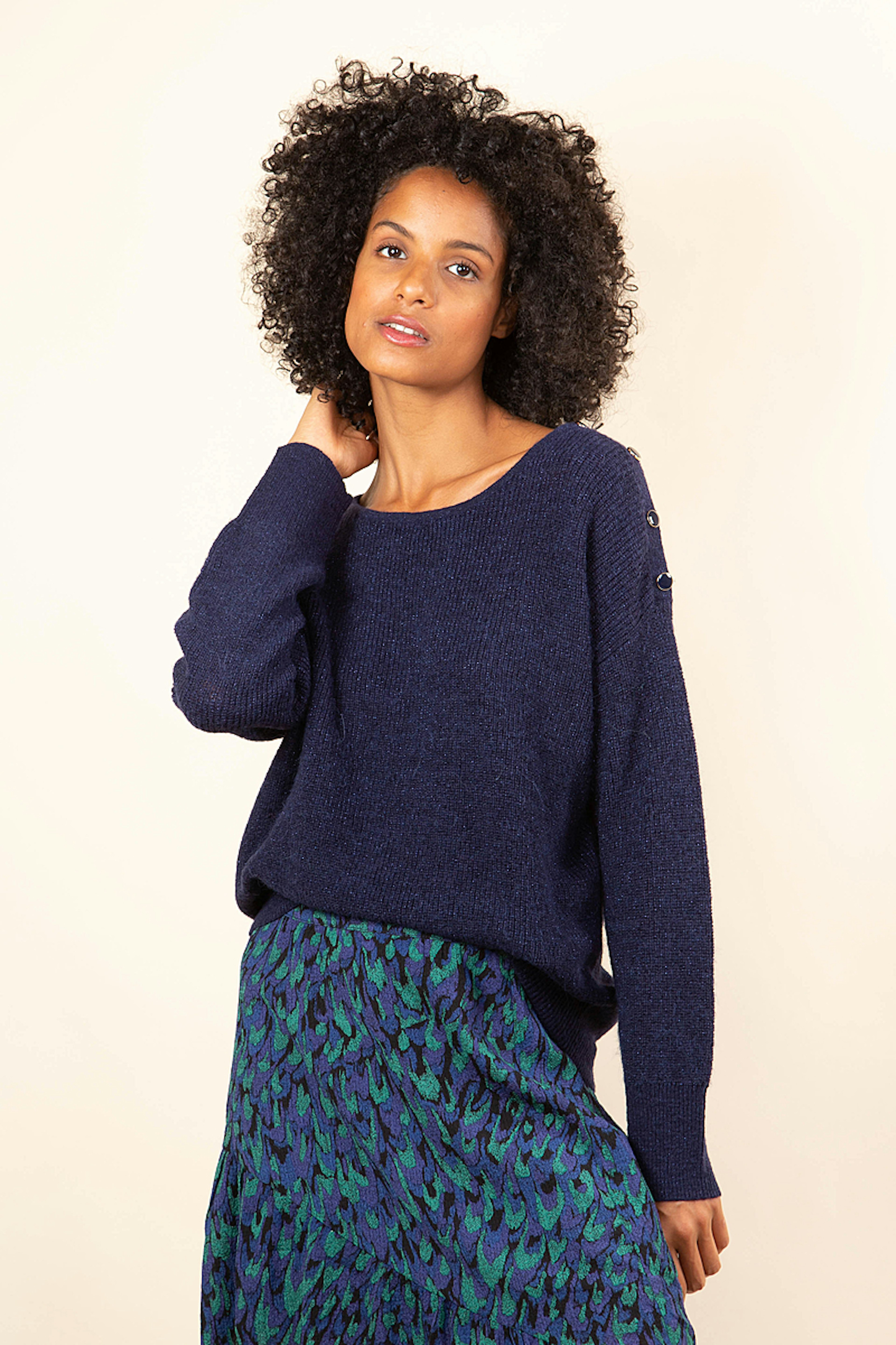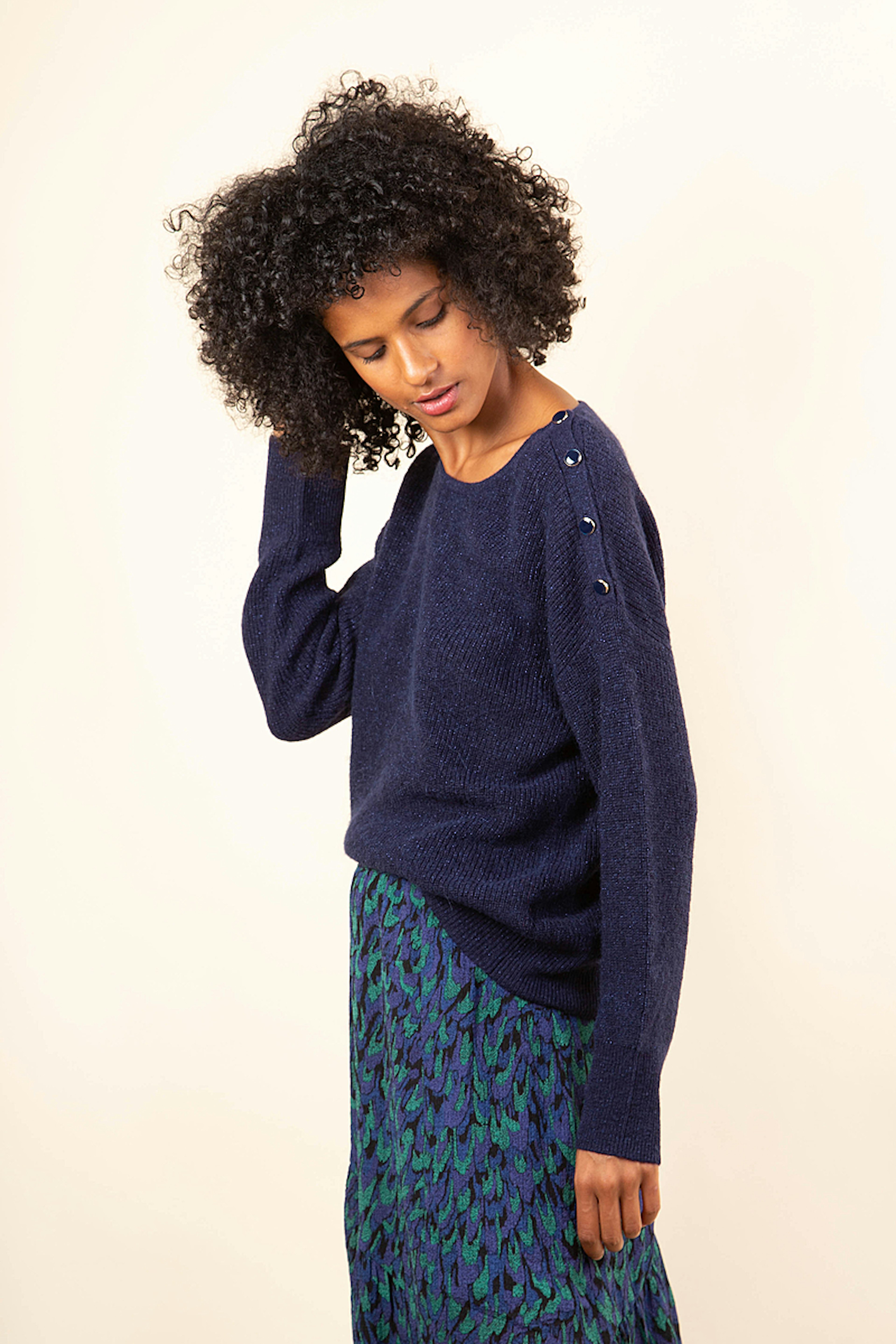 Lorsqu'il commence ร faire froid, optez pour le pull en laine et alpaga Alessandro. Sa maille bleue s'associe trรจs bien avec une jupe imprimรฉe. On aime les dรฉtails de ses boutons sur l'รฉpaule.