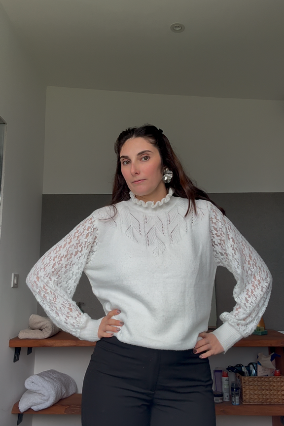 Associez ce pull avec un pantalon tailleur pour un style chic et raffiné. Idéal pour l'hiver. • Pull en dentelle • Manches longues bouffantes • Col montant volanté • Motif ajouré • Poignets resserrés