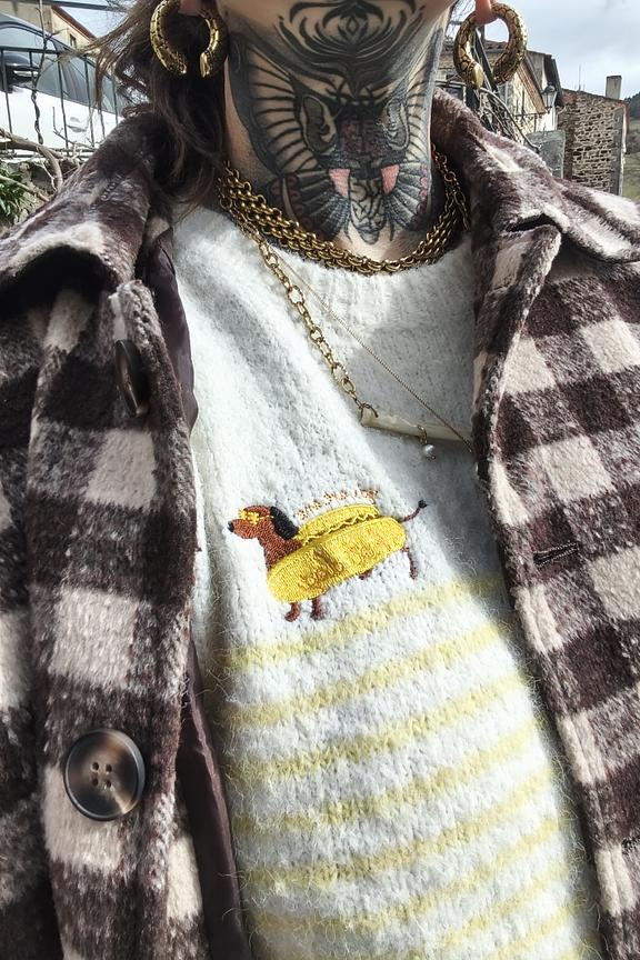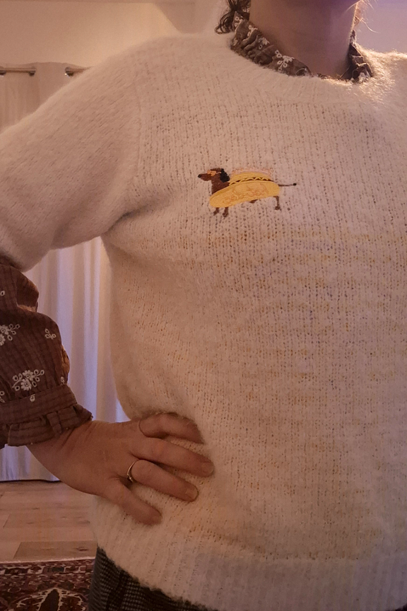 “Pull tout doux, original avec broderie humoristique 😉, chaud mais j'aurais préféré des manches longues à cette saison. Un petit coup de cœur”
