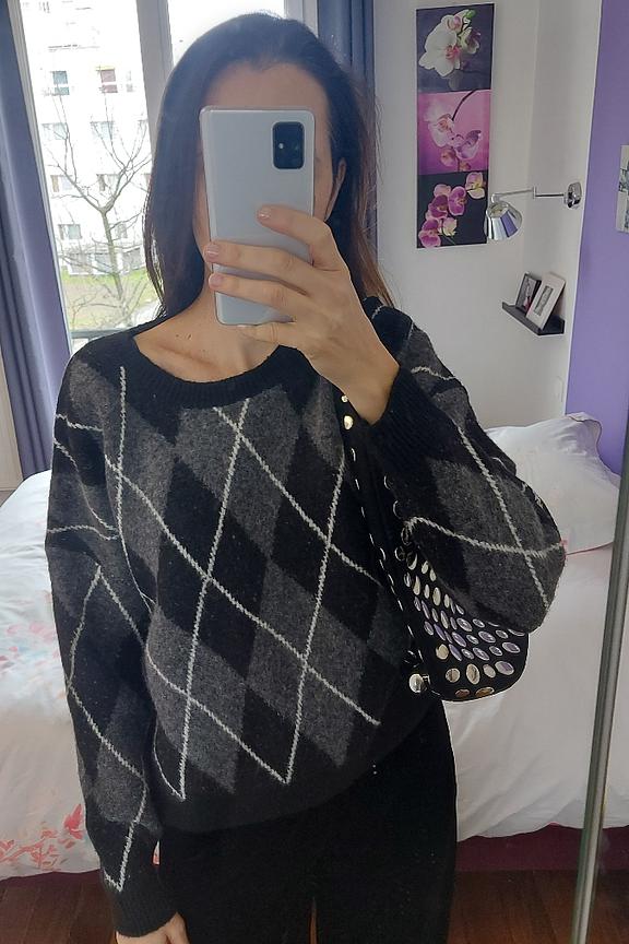 Pour une allure décontractée et élégante, associez ce pull avec un pantalon blanc et des bottines noires. Parfait pour les journées fraîches d'hiver. • Pull à motif losanges • Coupe ample • Manches longues • Finitions côtelées • Col rond