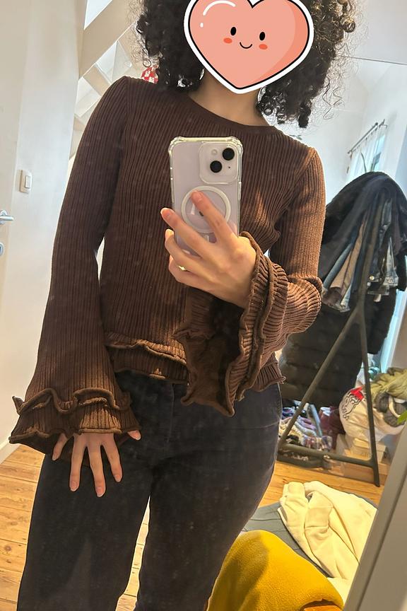 Portez ce pull avec un jean décontracté pour un look cosy-chic. Parfait pour les journées fraîches d'hiver. • Pull à manches longues • Coupe ajustée • Détails à volants • Style côtelé • Couleur marron chaleureuse