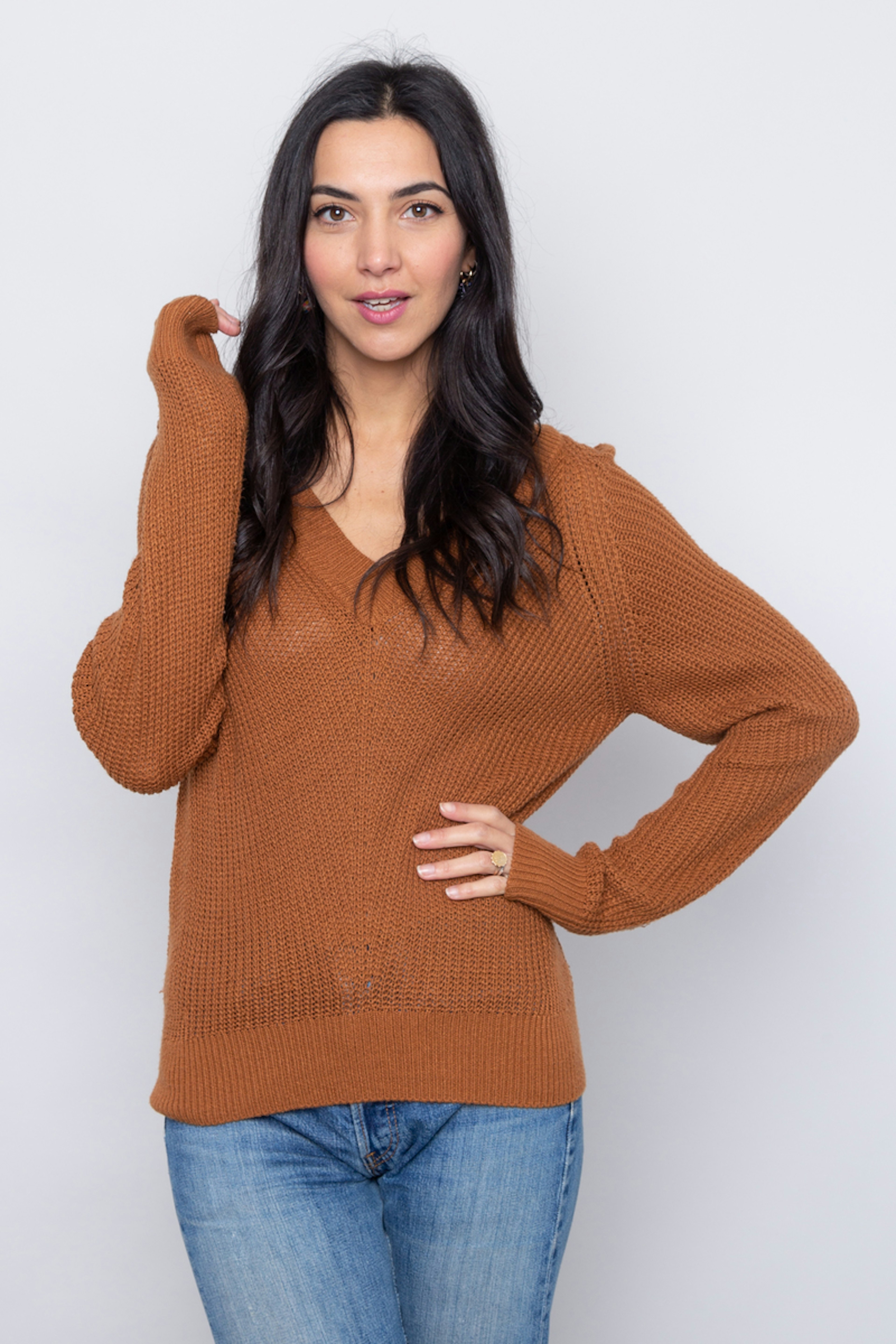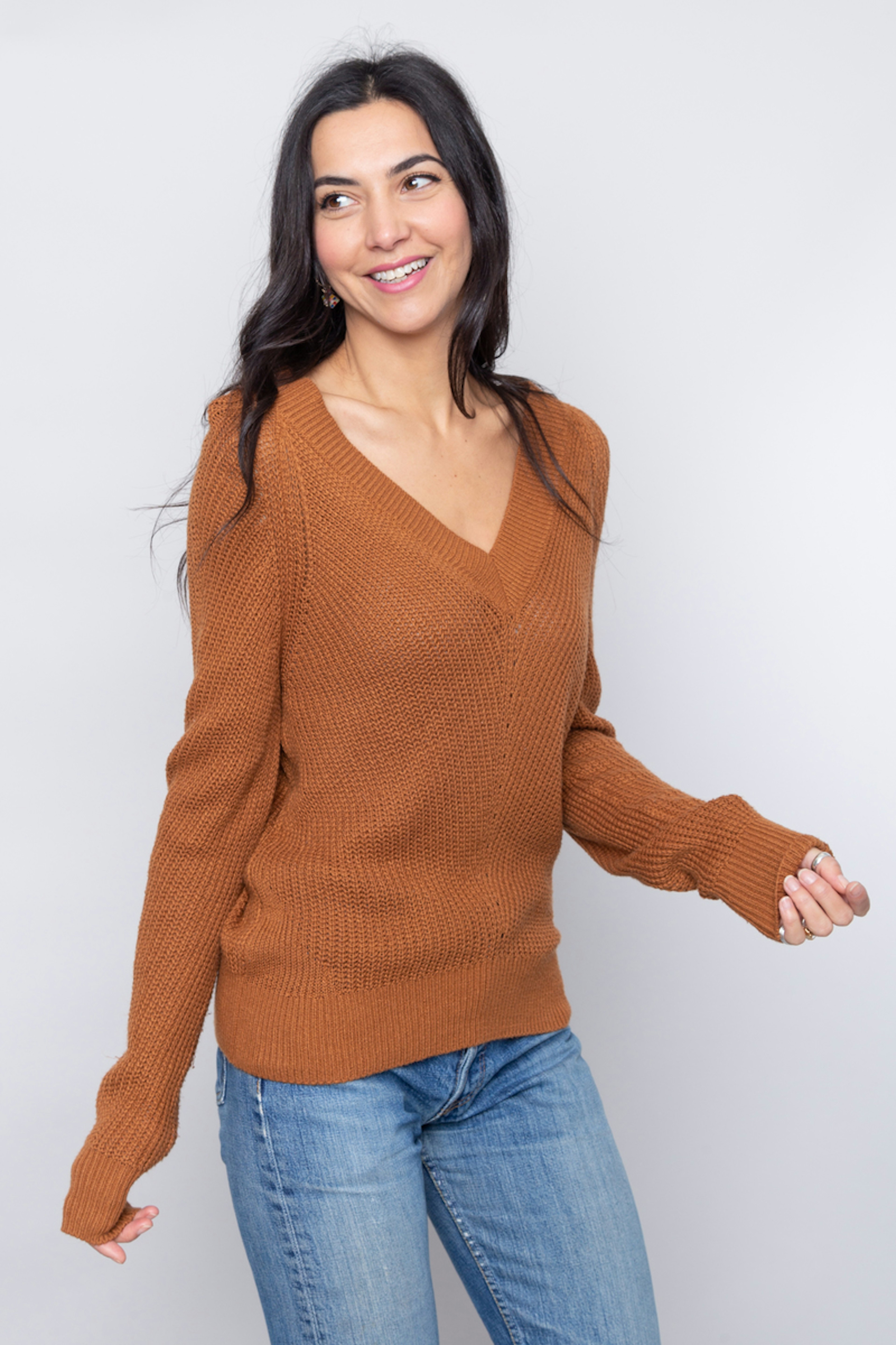โข Pull marron โข Maille cรดtelรฉe โข Manches longues โข Encolure en V plongeant
