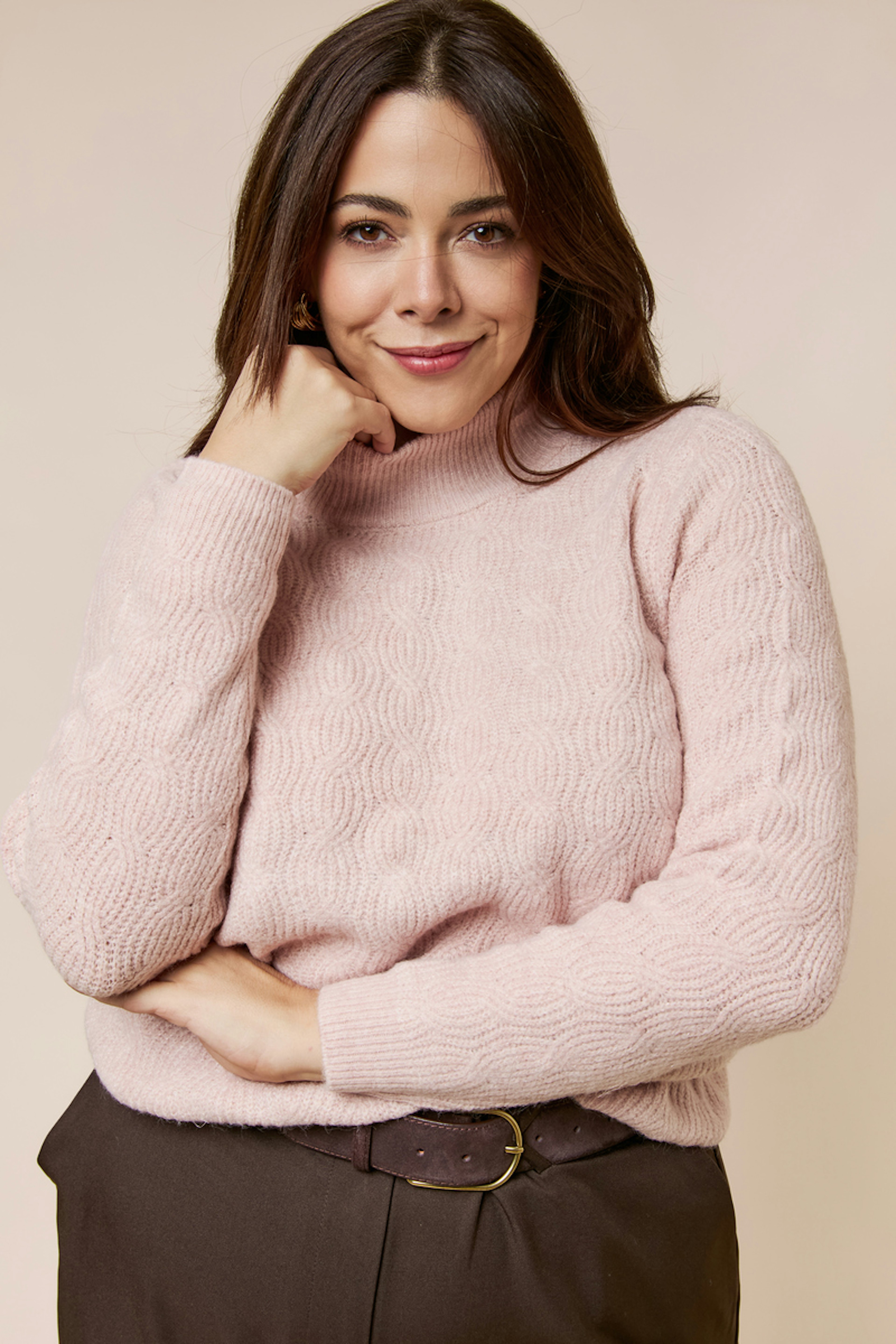 Ce pull rose doux est parfait pour un look réconfortant en hiver. Associez-le à un pantalon taille haute et des bottines pour un style chic et confortable. • Pull à col roulé • Manches longues • Motif texturé • Couleur douce et féminine • Coupe confortable