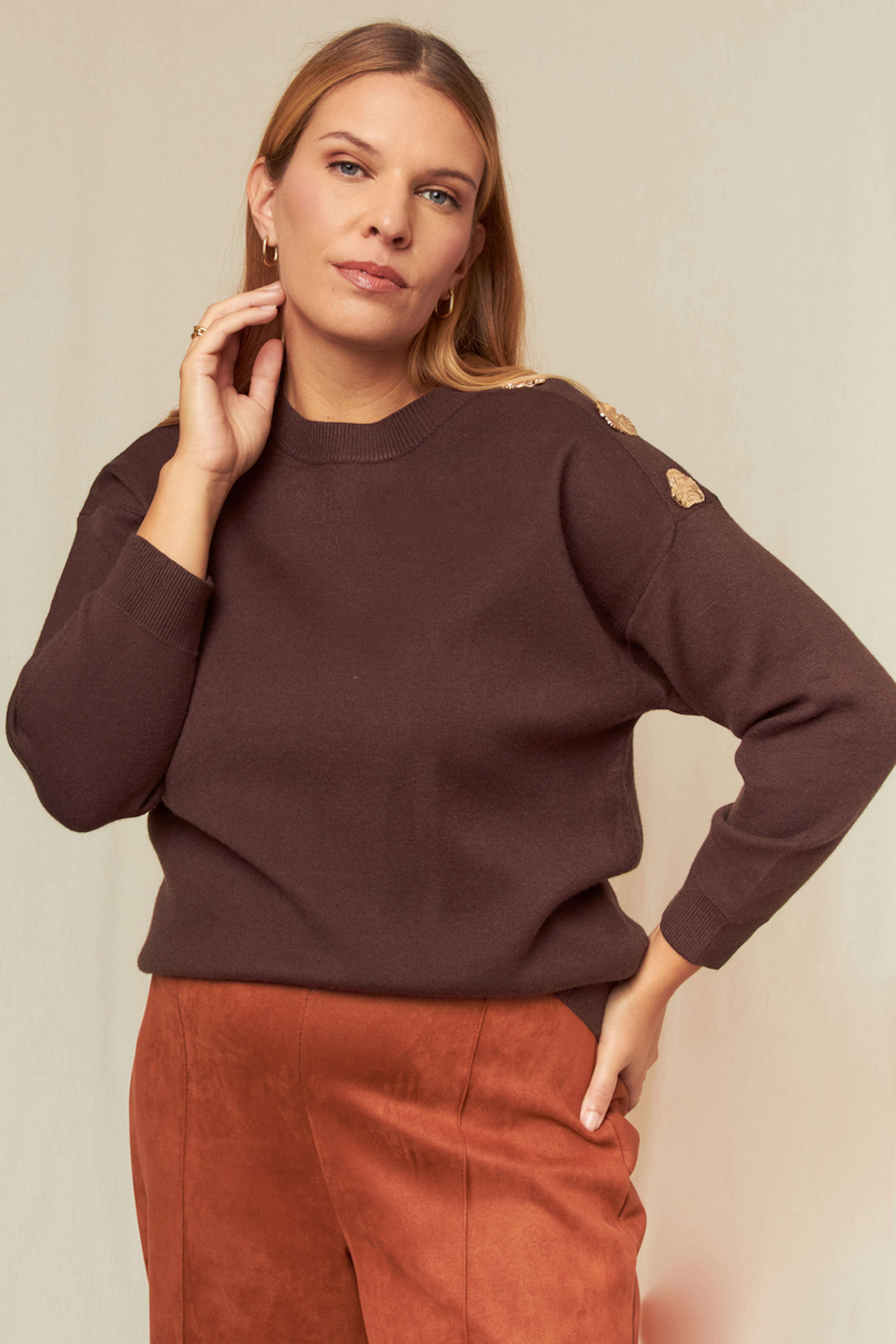Pour un look cosy, associez ce pull à un pantalon en velours et des bottines en cuir. Parfait pour les journées d'hiver. • Pull ajusté marron • Boutons décoratifs à l'épaule • Manches longues • Encolure ronde • Ourlet côtelé