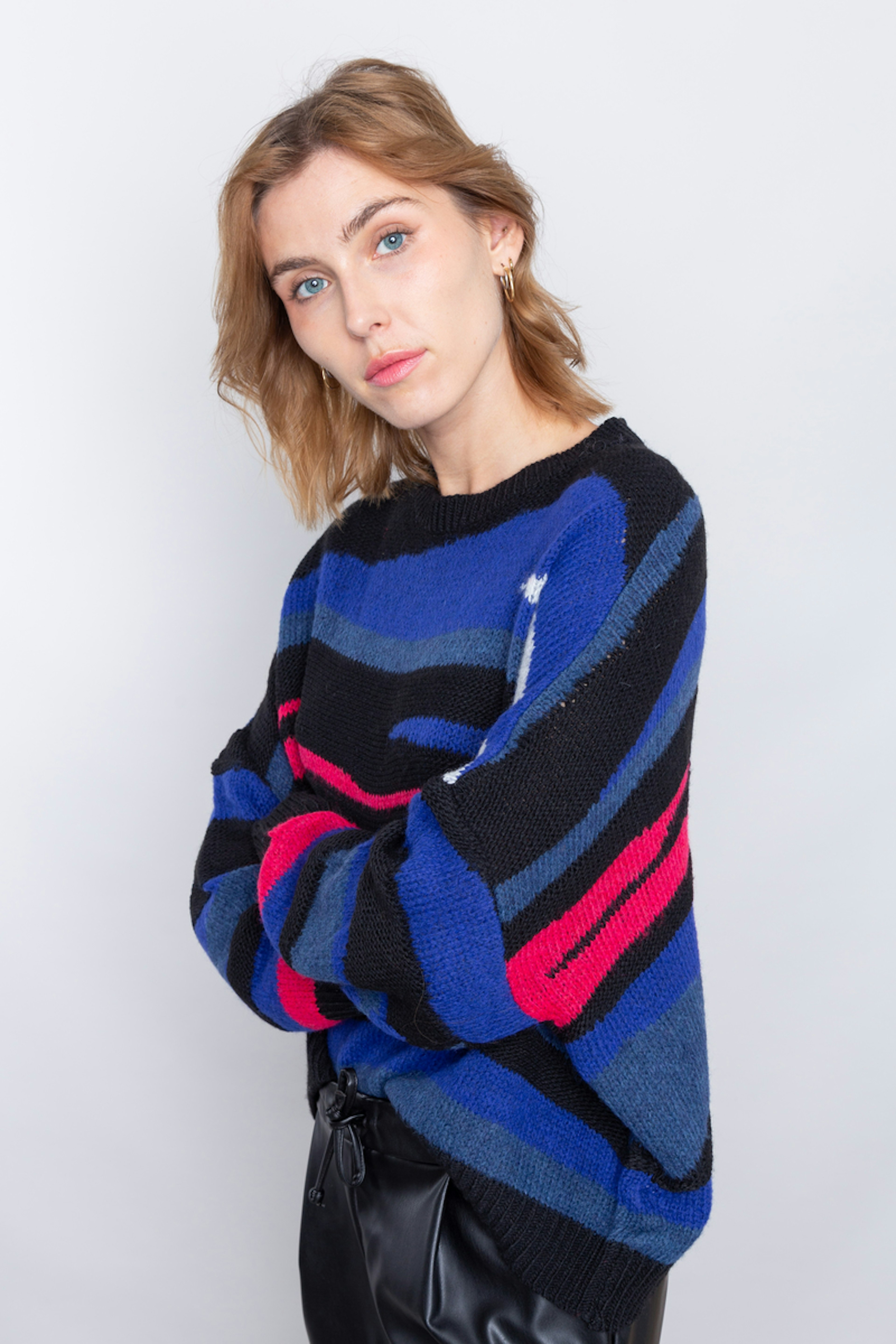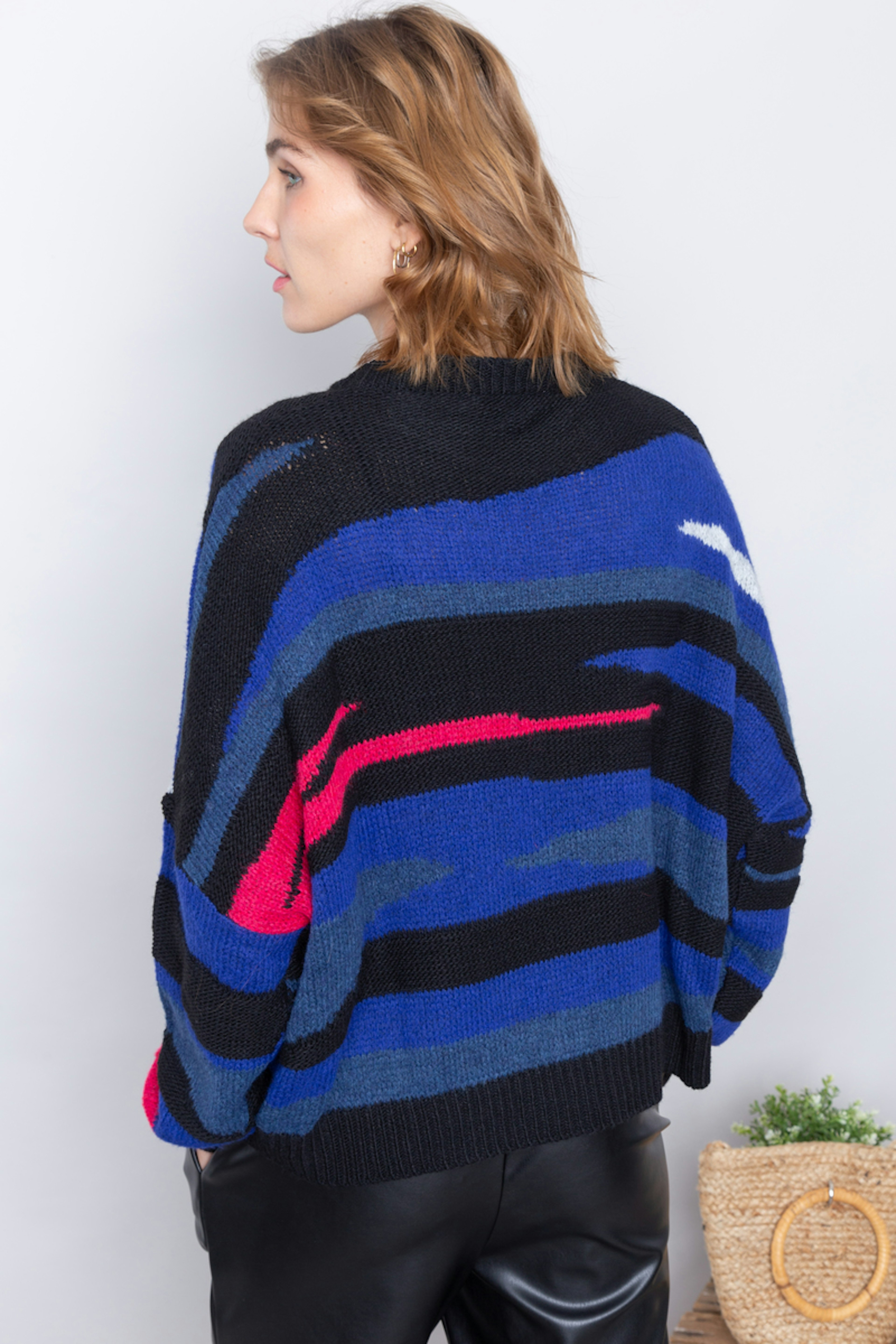 โข Pull jacquard allover โข Encolure ronde โข Coupe oversize โข Finition bas corps et bas manches en bord cรดtes contrastรฉs.
