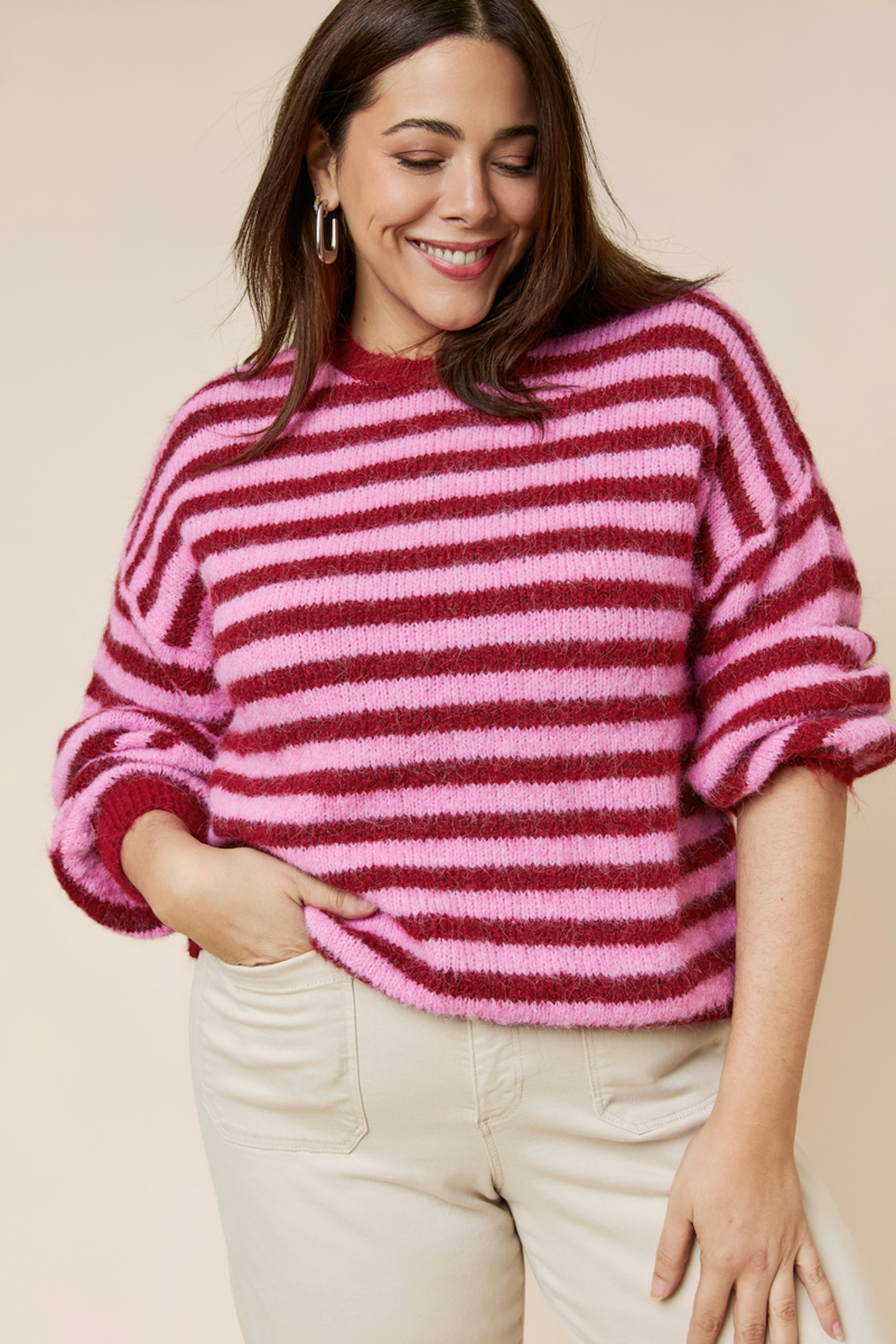 Associez ce pull avec un pantalon beige et des bottines pour un look cosy et élégant cet hiver. • Pull rayé • Coupe ample • Manches bouffantes • Col rond • Ourlet côtelé