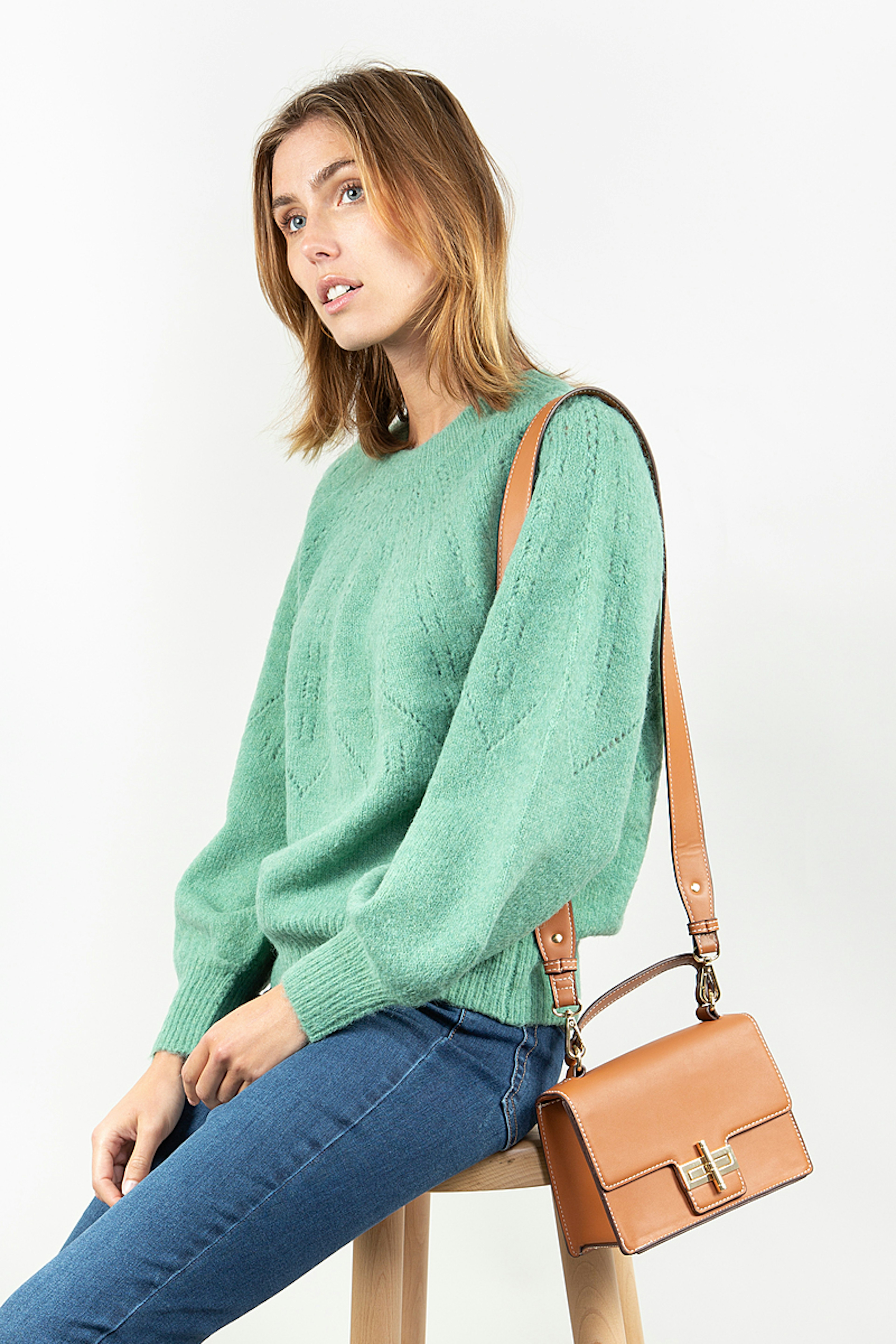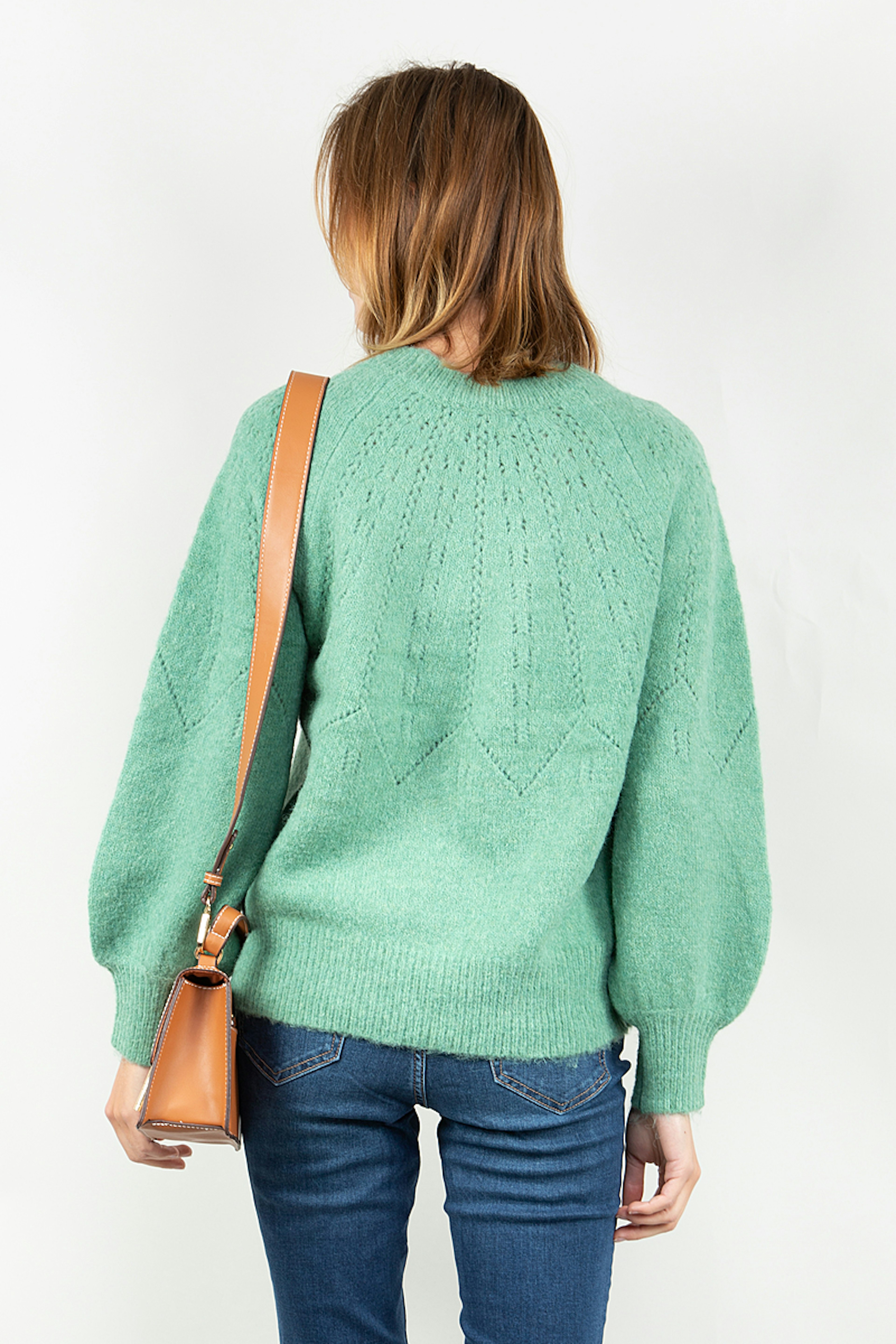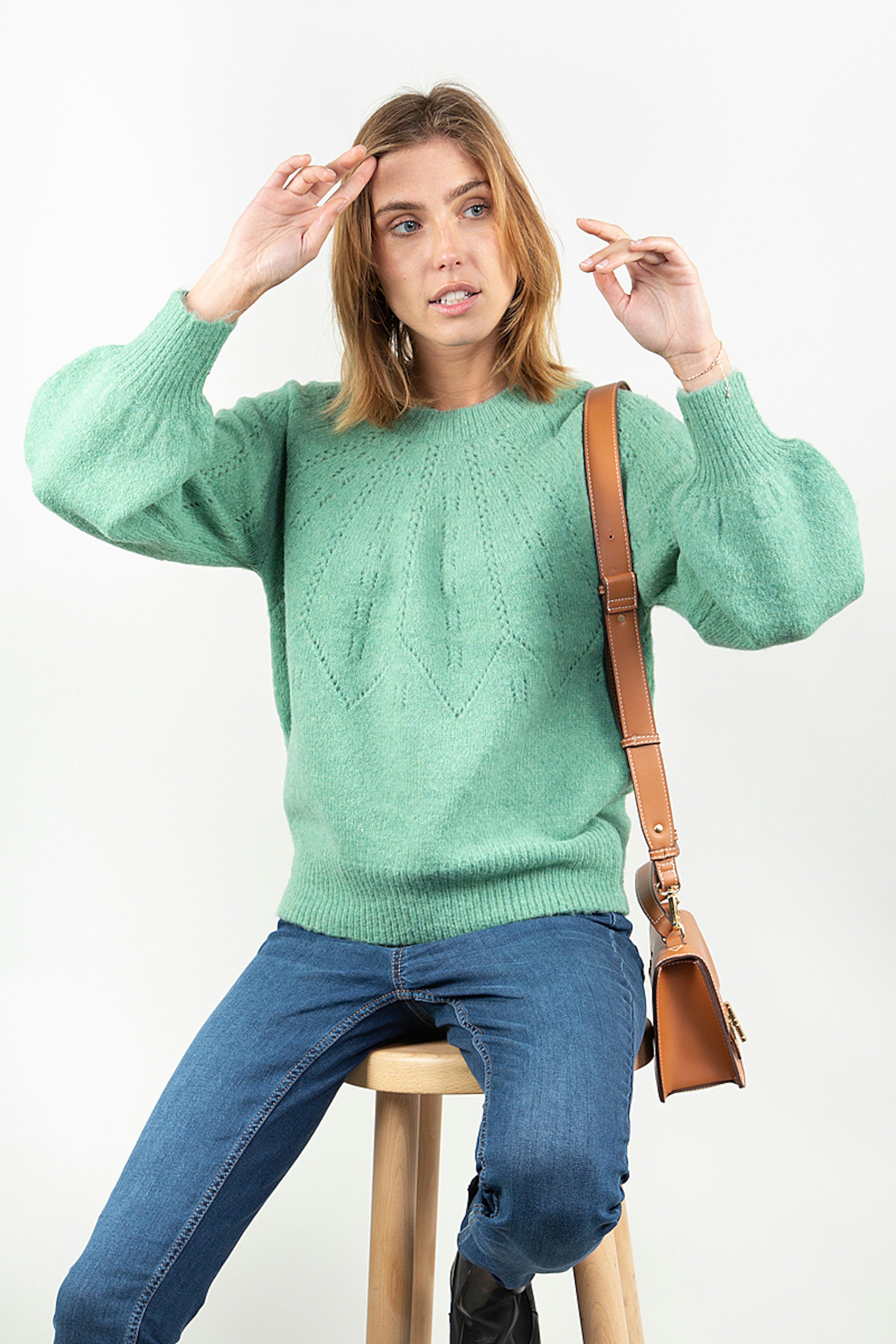 โข Pull en maille ajourรฉe oversize vert, ร manches longues โข Encolure ronde โข Contient de la laine