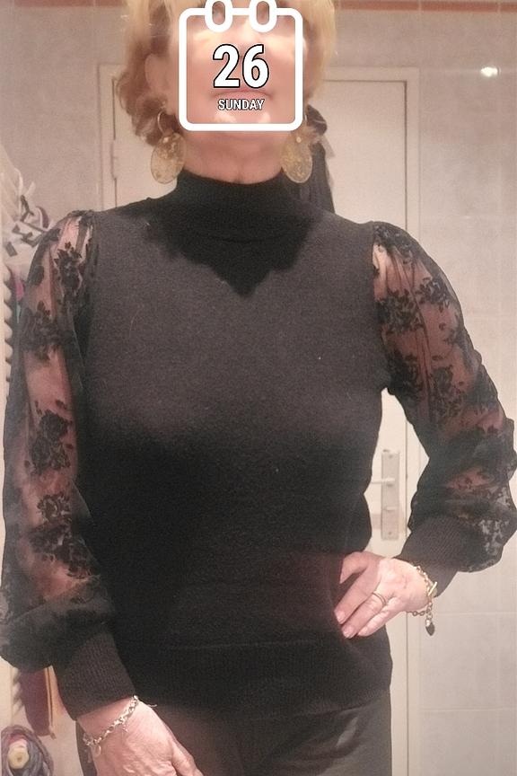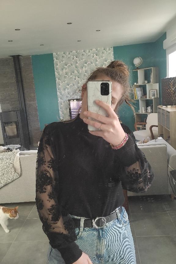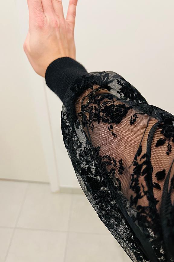 โ€ข Pull noir ร  manches longues โ€ข Tissu transparent avec dรฉtails fleuris noirs effet satinรฉ sur les manches โ€ข Col officier โ€ข Coupe droite