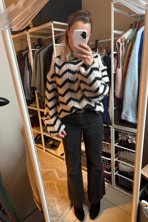 Associez ce pull graphique ร  un jean noir et des bottines pour une allure urbaine et chic cet hiver. โ€ข Pull doux โ€ข Manches longues โ€ข Coupe ample โ€ข Motif zigzag โ€ข Col rond en contraste