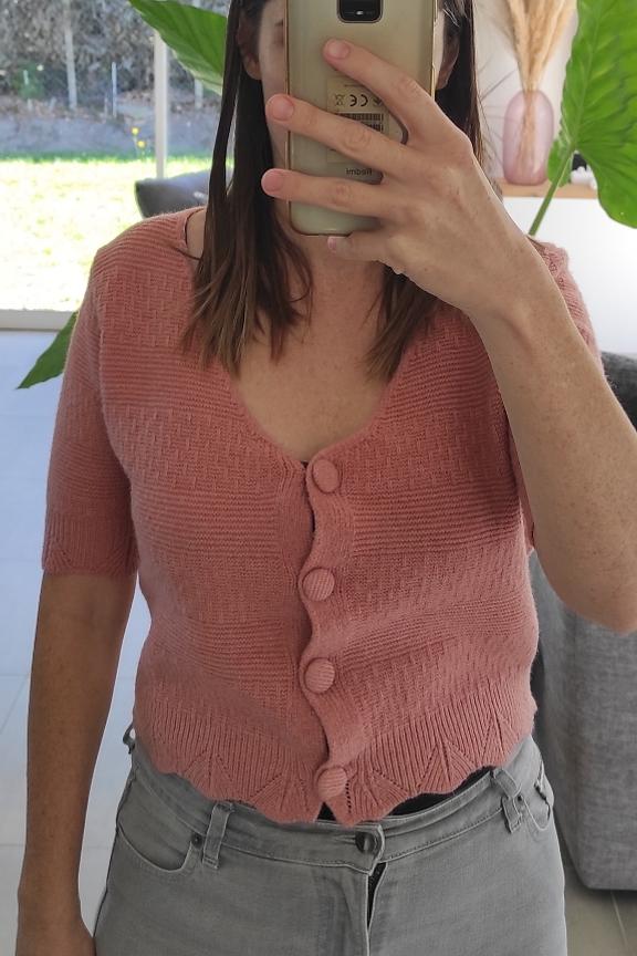 โข Pull en maille fines rose poudrรฉ โข Manches courtes droites โข Col en V โข Patte de boutonnage ton sur ton โข Bords ondulรฉs โข La taille unique convient du S au L