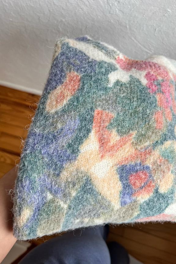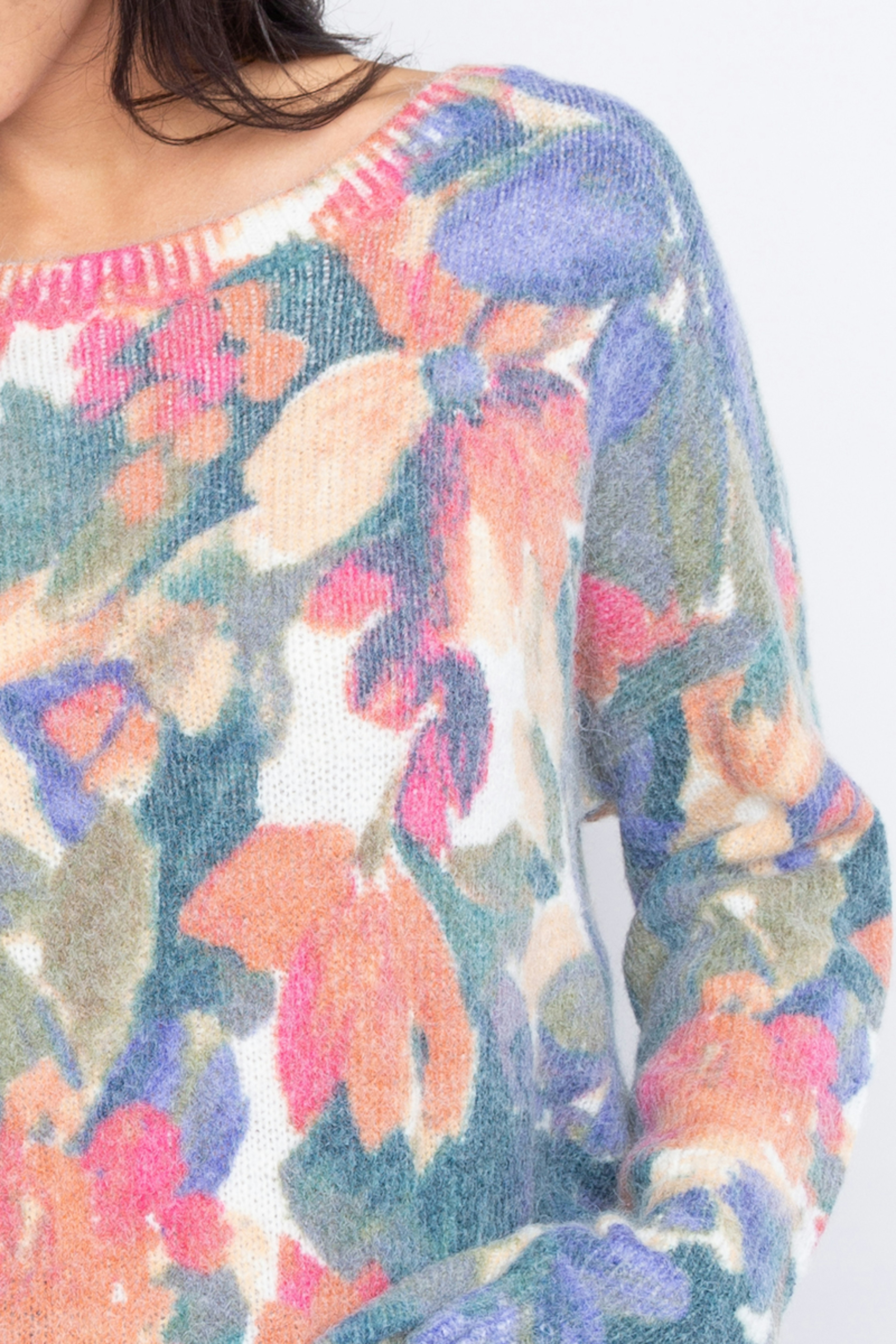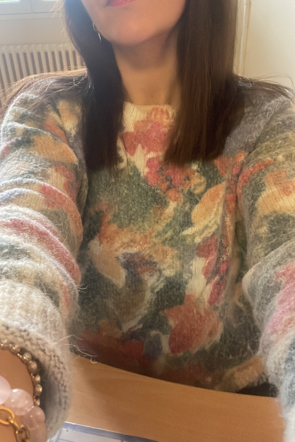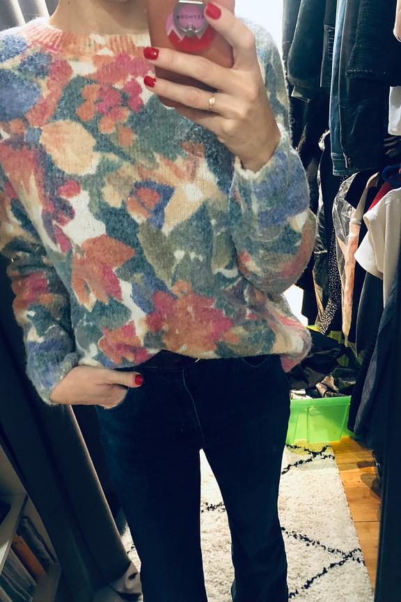 โ€ข Pull oversize imprimรฉ aquarelle โ€ข Manches longues โ€ข Poignets et ourlets cรดtelรฉs โ€ข Col rond