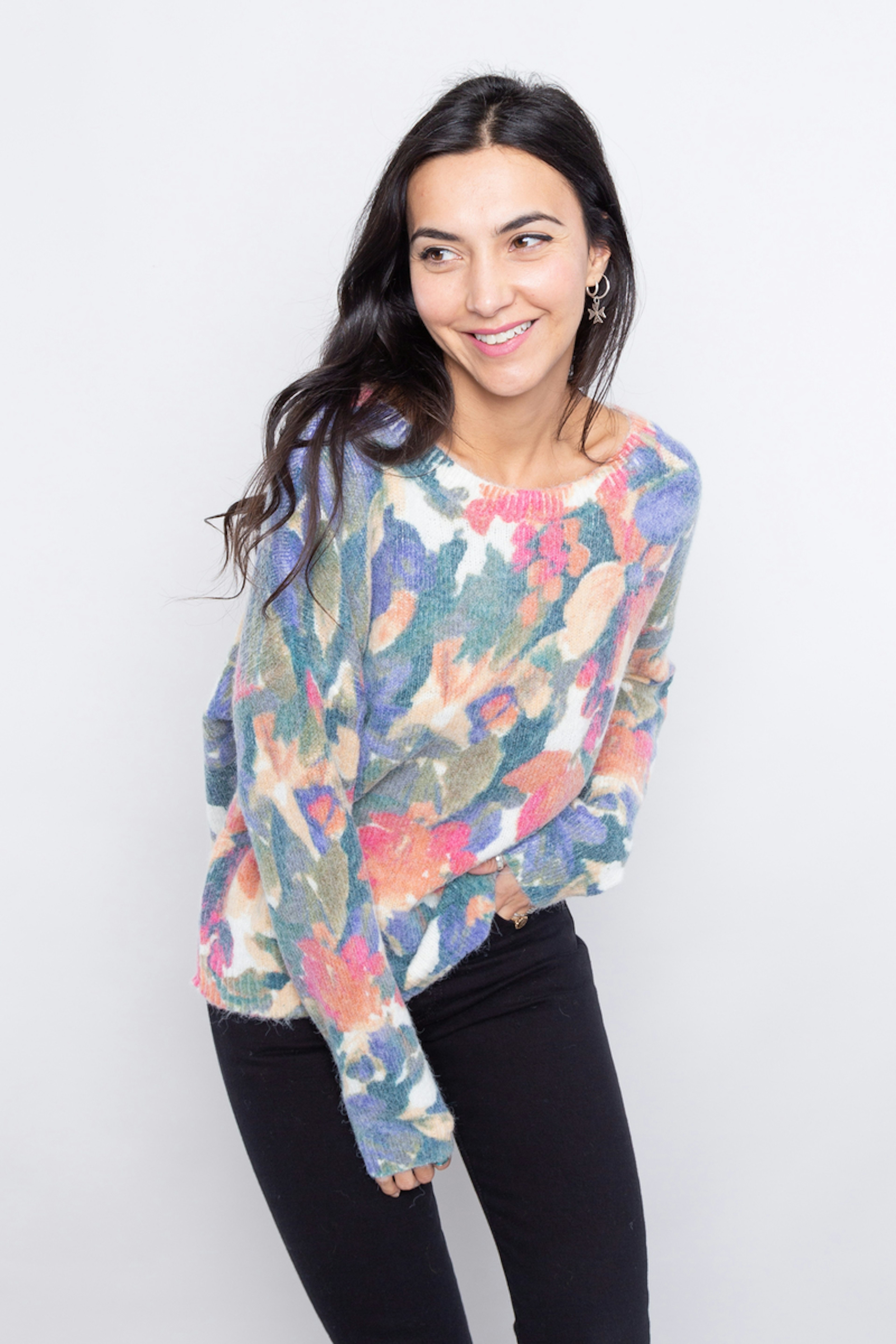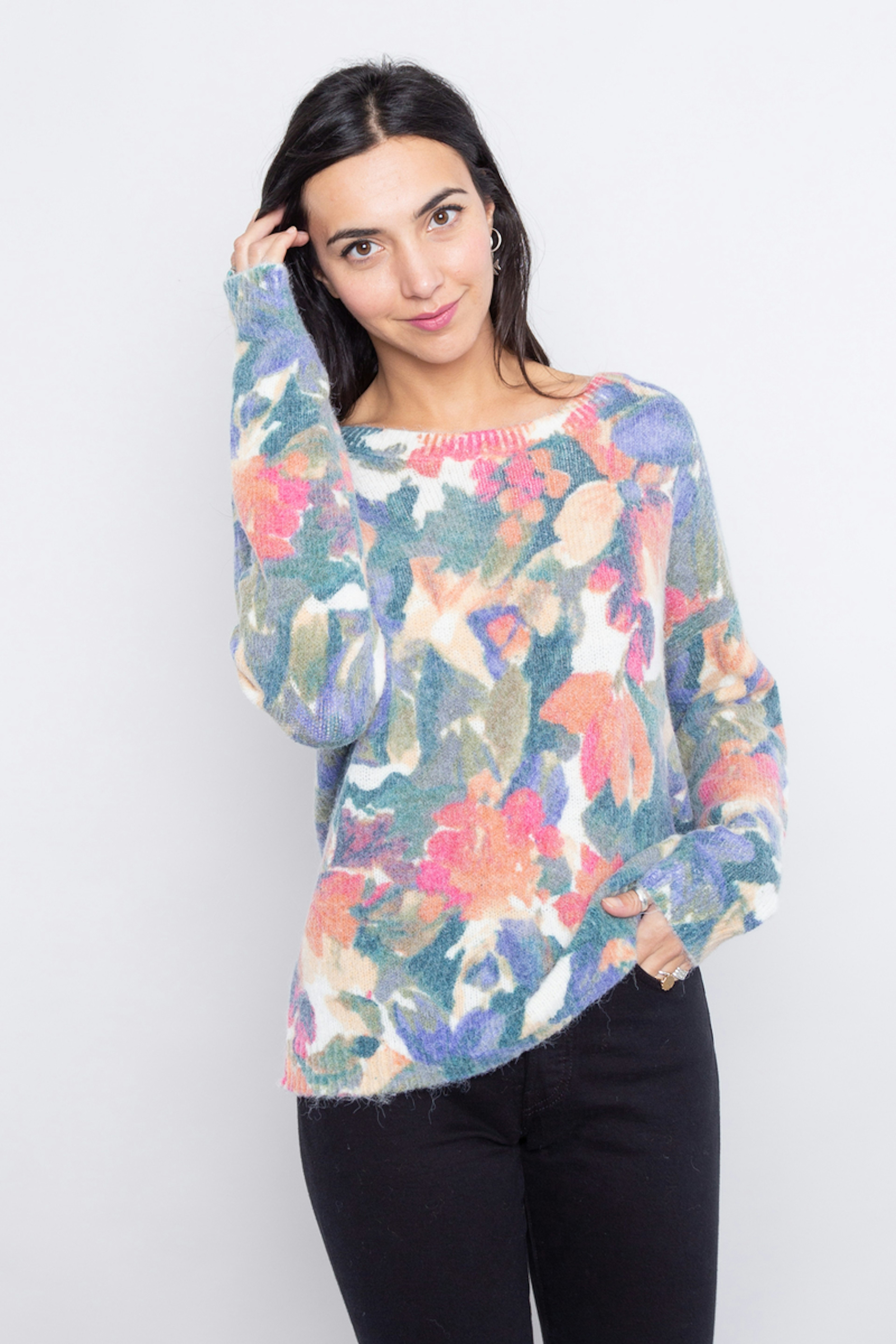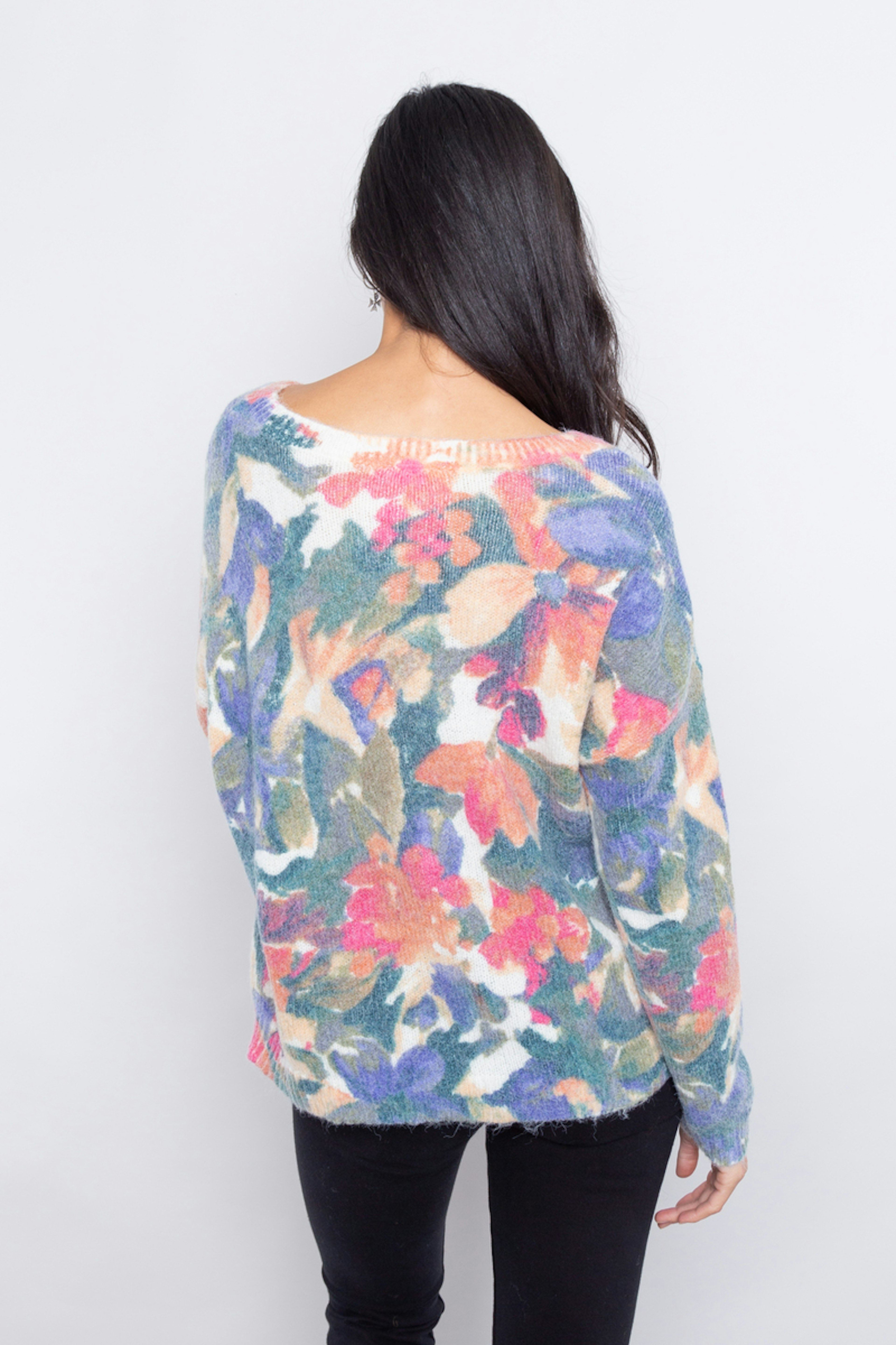 โ€ข Pull oversize imprimรฉ aquarelle โ€ข Manches longues โ€ข Poignets et ourlets cรดtelรฉs โ€ข Col rond