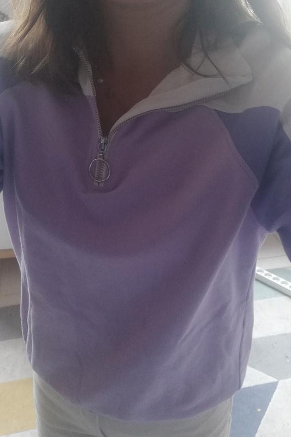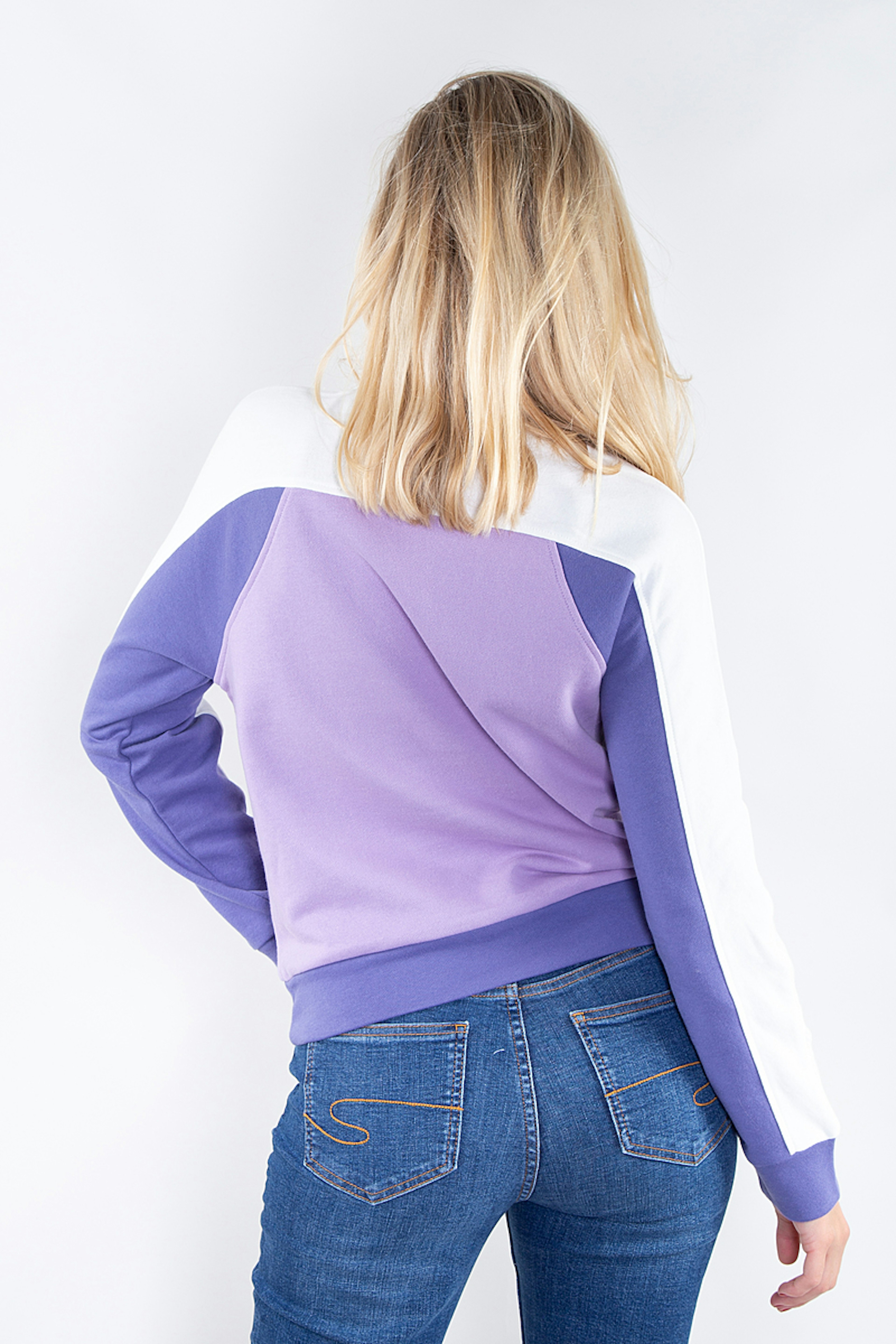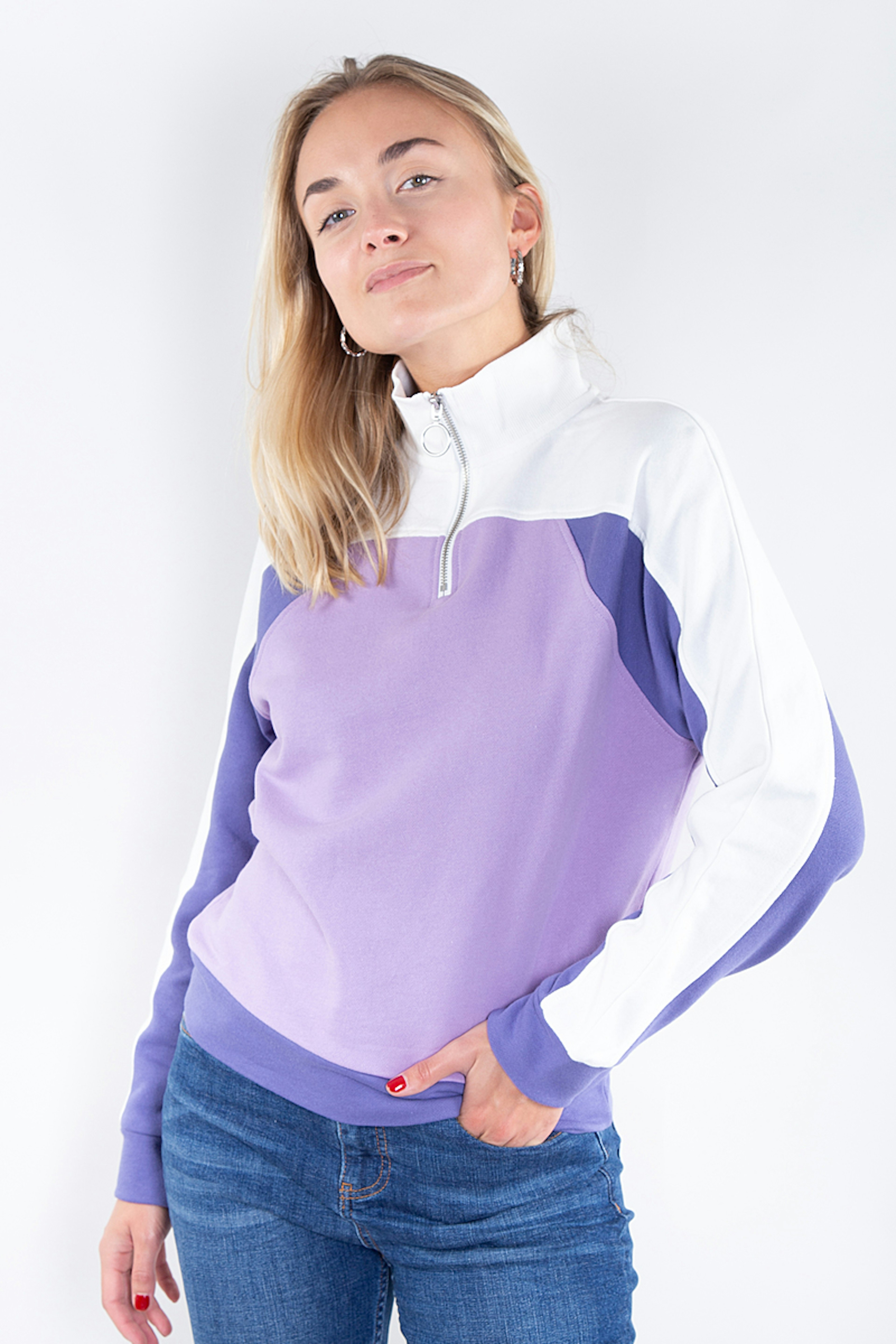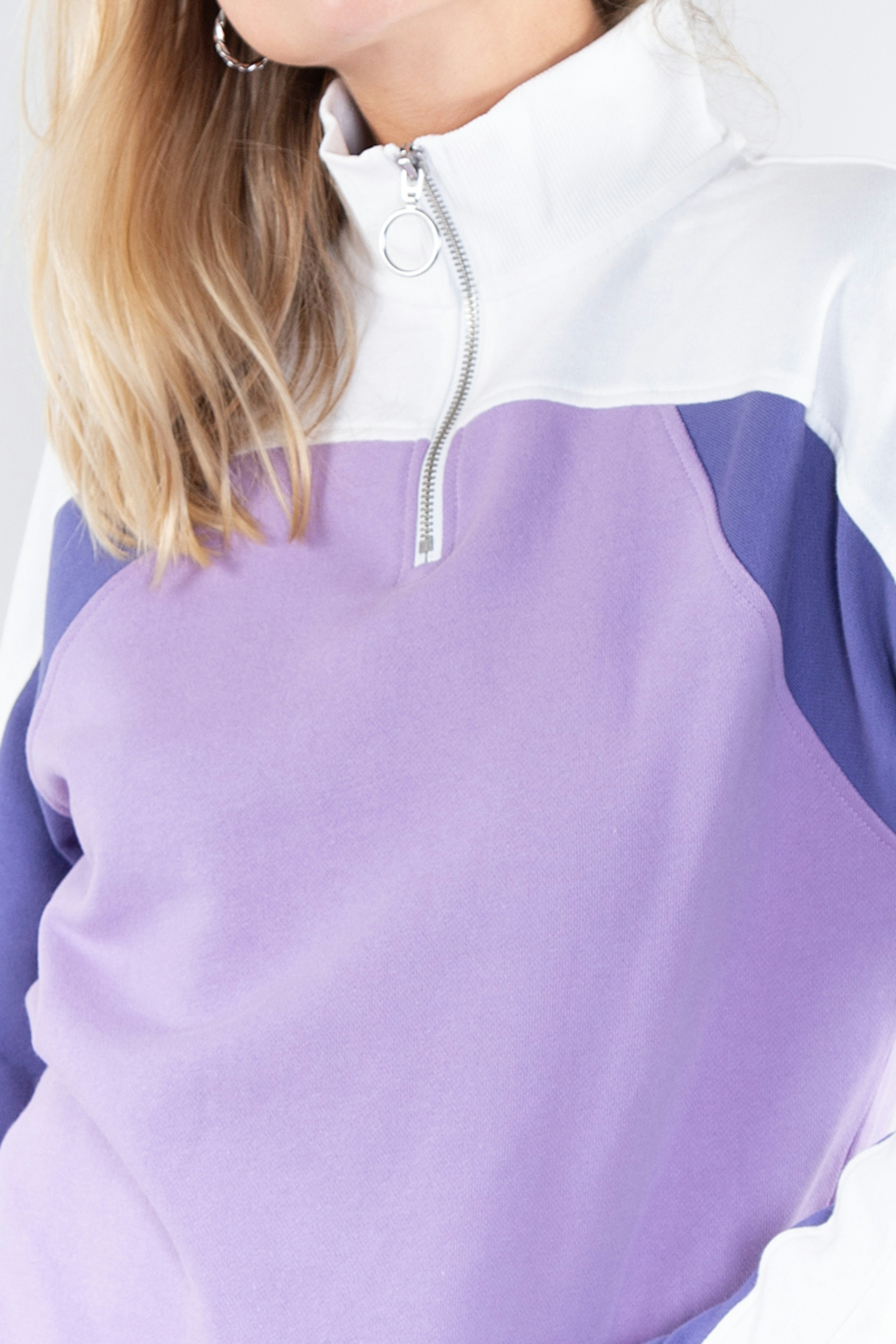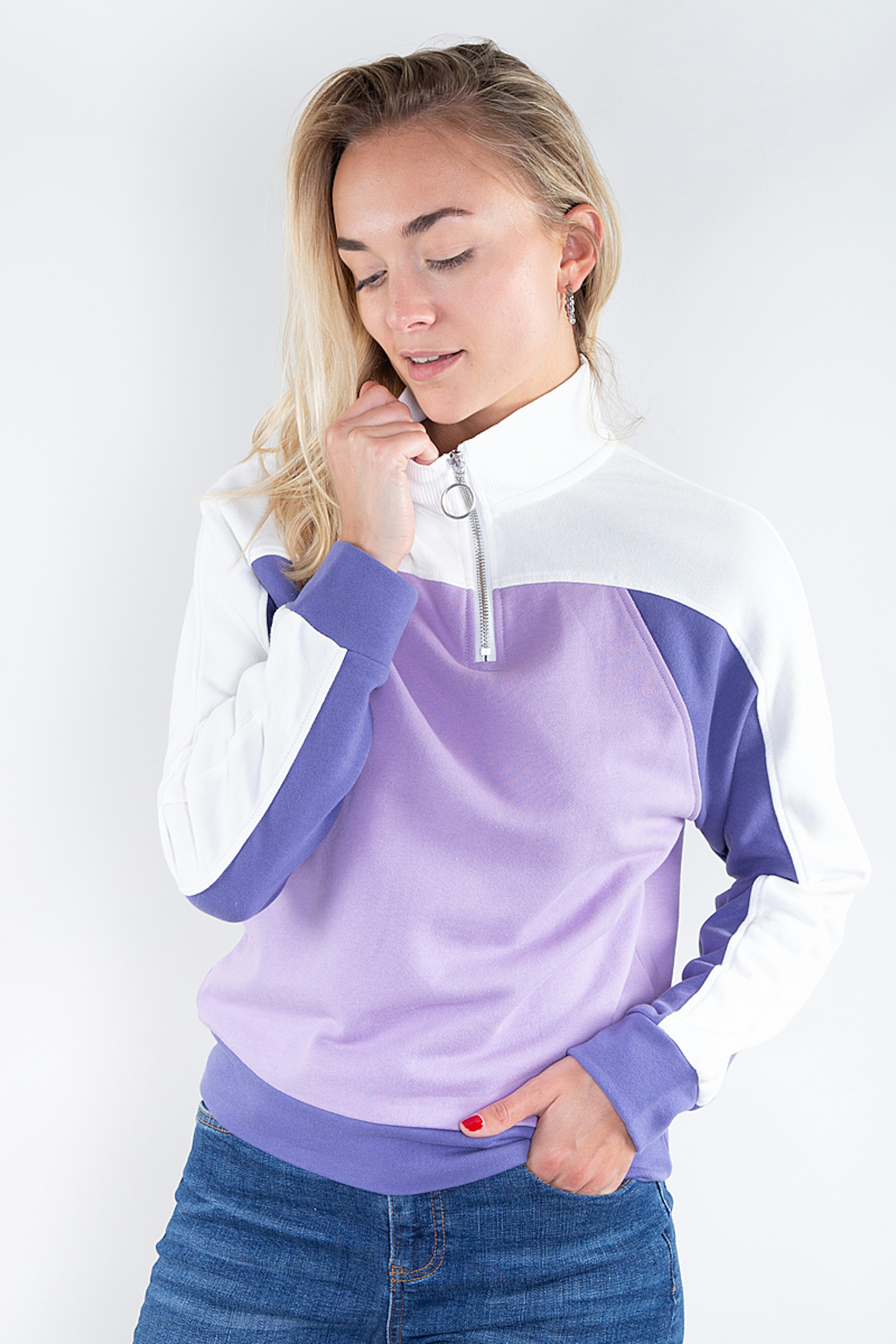 โข Sweat ร col camionneur colorรฉ โข Effet color block dans les tons blancs, lilas et violet โข Bord cรดte sur les manches et le bas du sweat